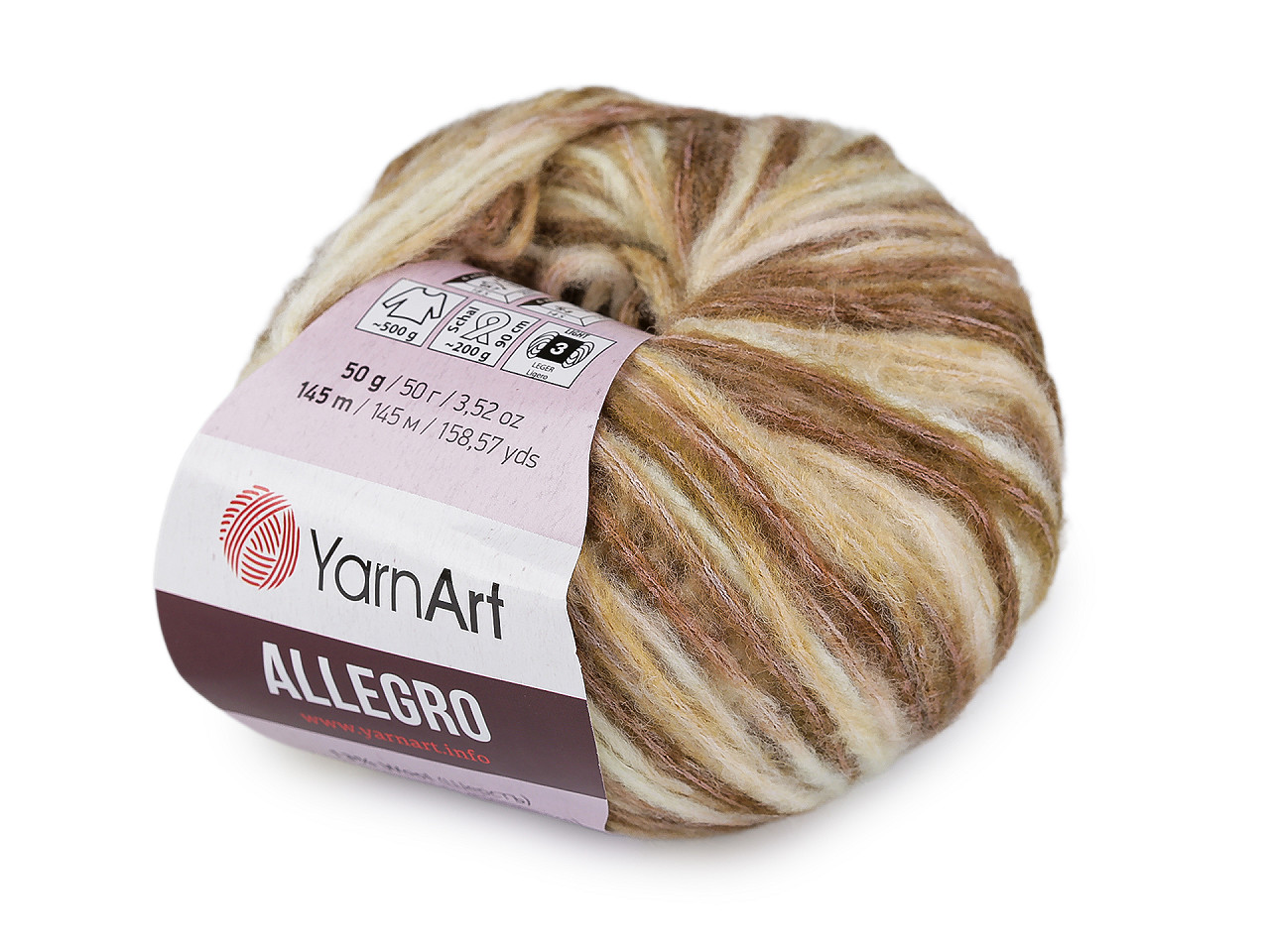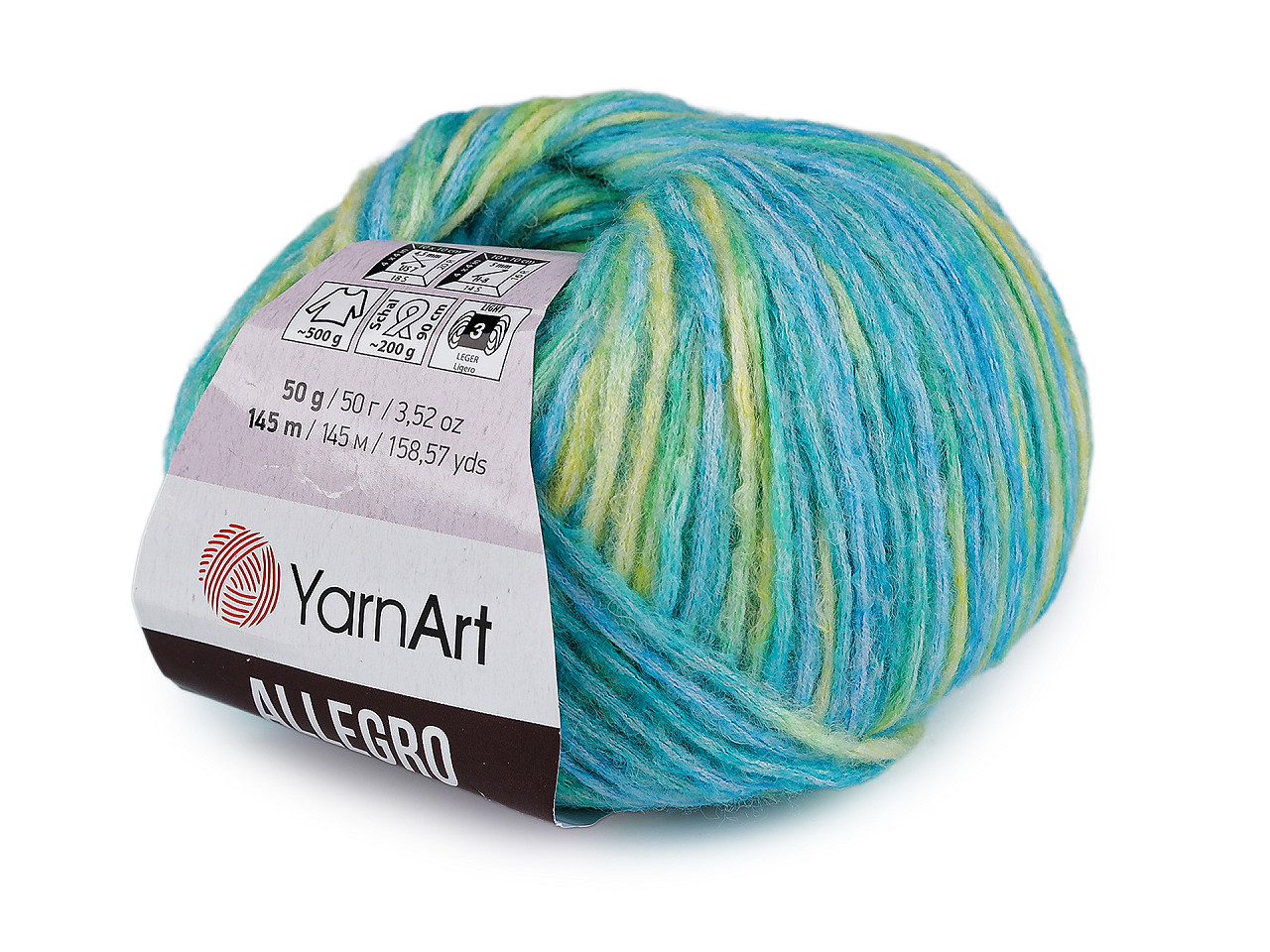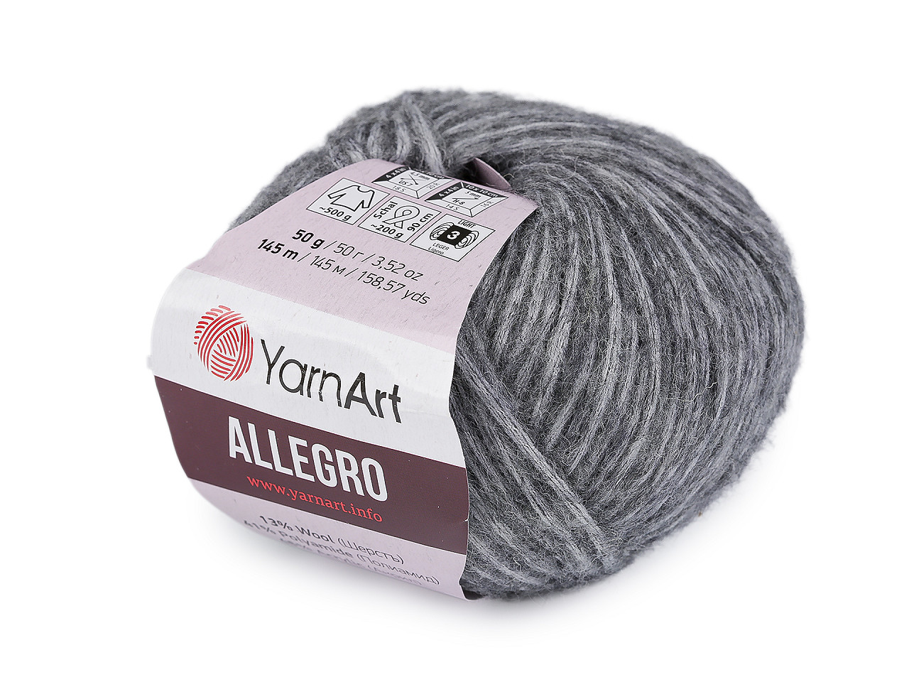 Priadza Allegro je ideálna na jesenné a jarné odevy a doplnky. Je jemná a príjemná na dotyk. Môžete z nej upliesť či uháčkovať ľahké svetre, šály, vesty, čiapky, čelenky, plédy a pod. Obsahuje podiel vlny. Veľkosť ihlíc: 4,5 Veľkosť háčika: 5