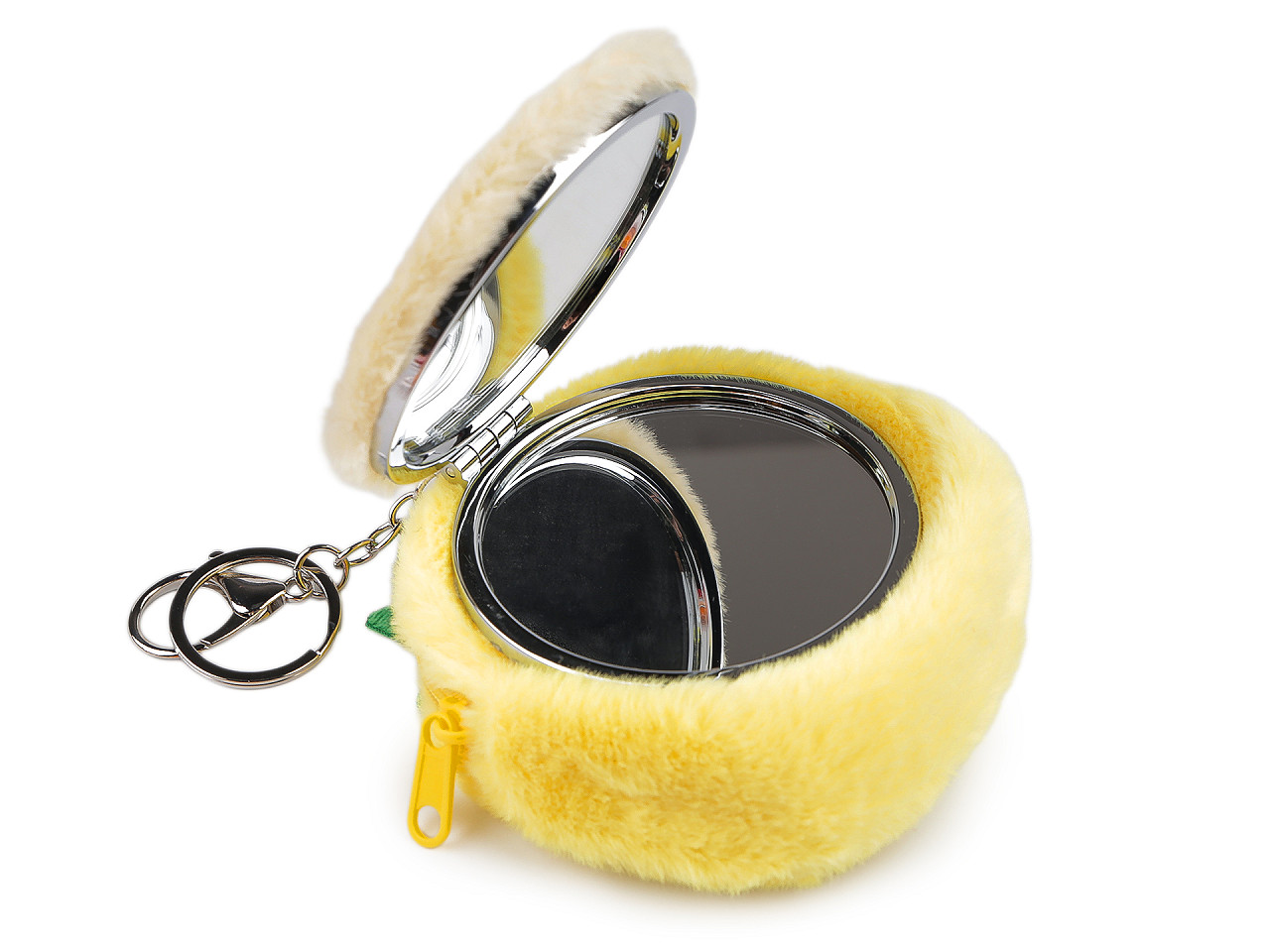 Plyšové puzdro s kozmetickým zrkadlom má hravý ovocný dizajn. Zapína sa na zips, predná strana je ozdobená, na zadnej strane je šikovne umiestnené otváracie zrkadlo . Puzdro je perfektné na uloženie drobnej kozmetiky, malých pokladov, kľúčov či drobných predmetov, ktoré potrebujete mať stále po ruke. Stane sa obľúbeným spoločníkom nielen na cestách, ale aj pri každodenných dobrodružstvách, pretože udrží všetky dôležité drobnosti bezpečne na jednom mieste. Zapína sa na zips , kovový krúžok a karabína umožňujú ľahké pripnutie na batoh či tašku. Zrkadlo má kvalitné spracovanie s rámčekom , vo vnútri sú 2 zrkadlá, jedno je zväčšovacie. Priemer samotných zrkadiel je 6,8 cm.
