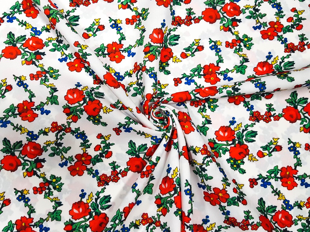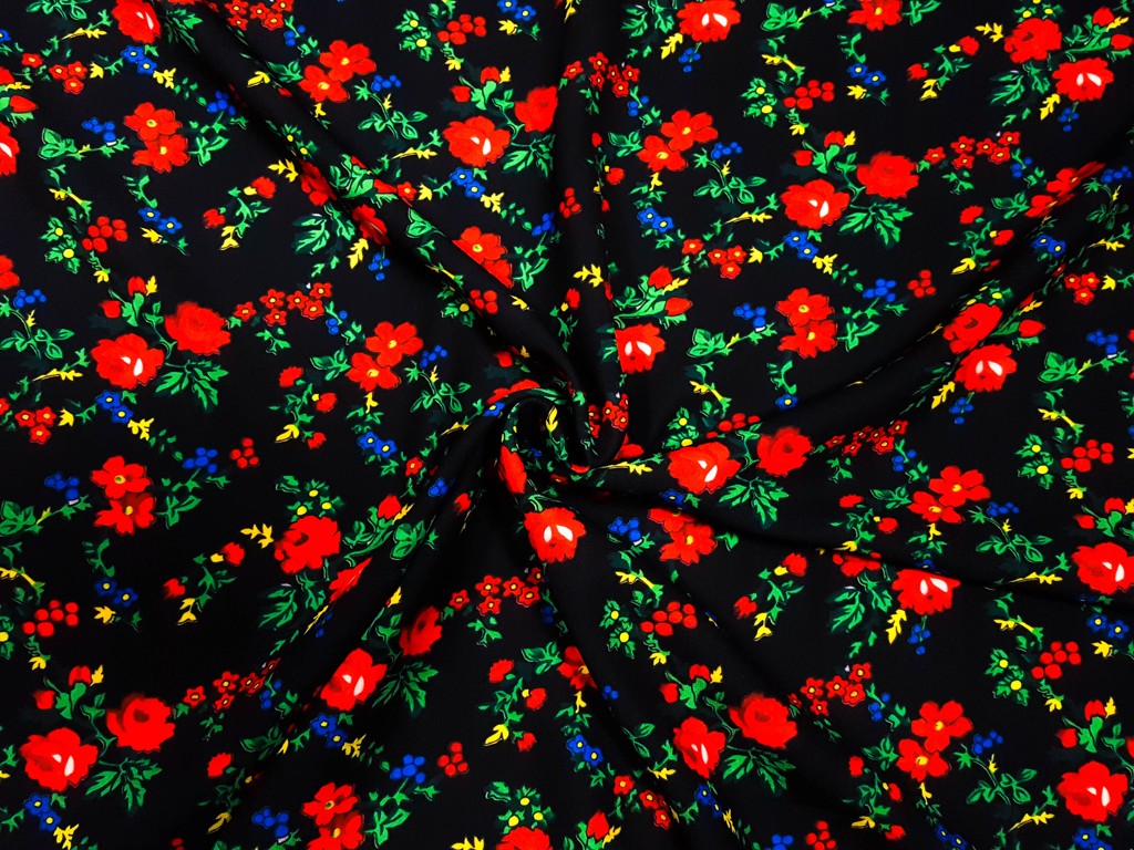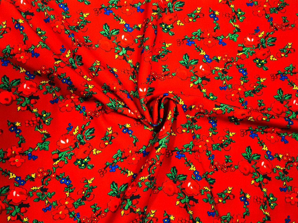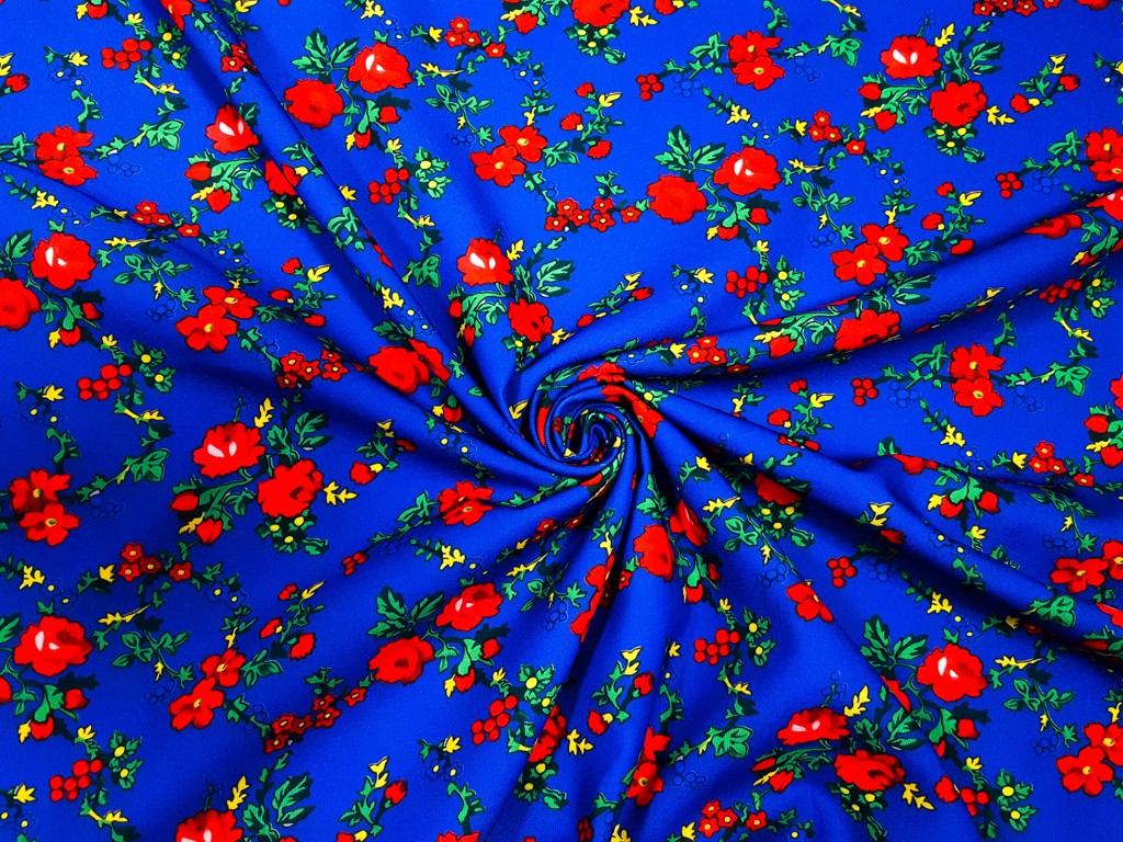 Folklórne látky s veľkým kvetom na farebnej potlači.