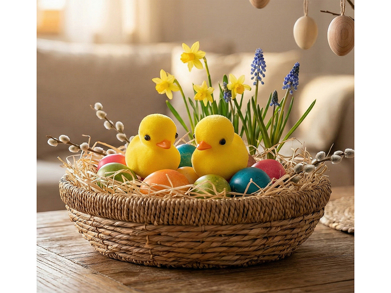 Dekoračná kačička oživí veľkonočné a jarné väzby, aranžmán aj vence. Je ľahká, vyrobená z polystyrénu, telo má pokryté jemným plyšom.