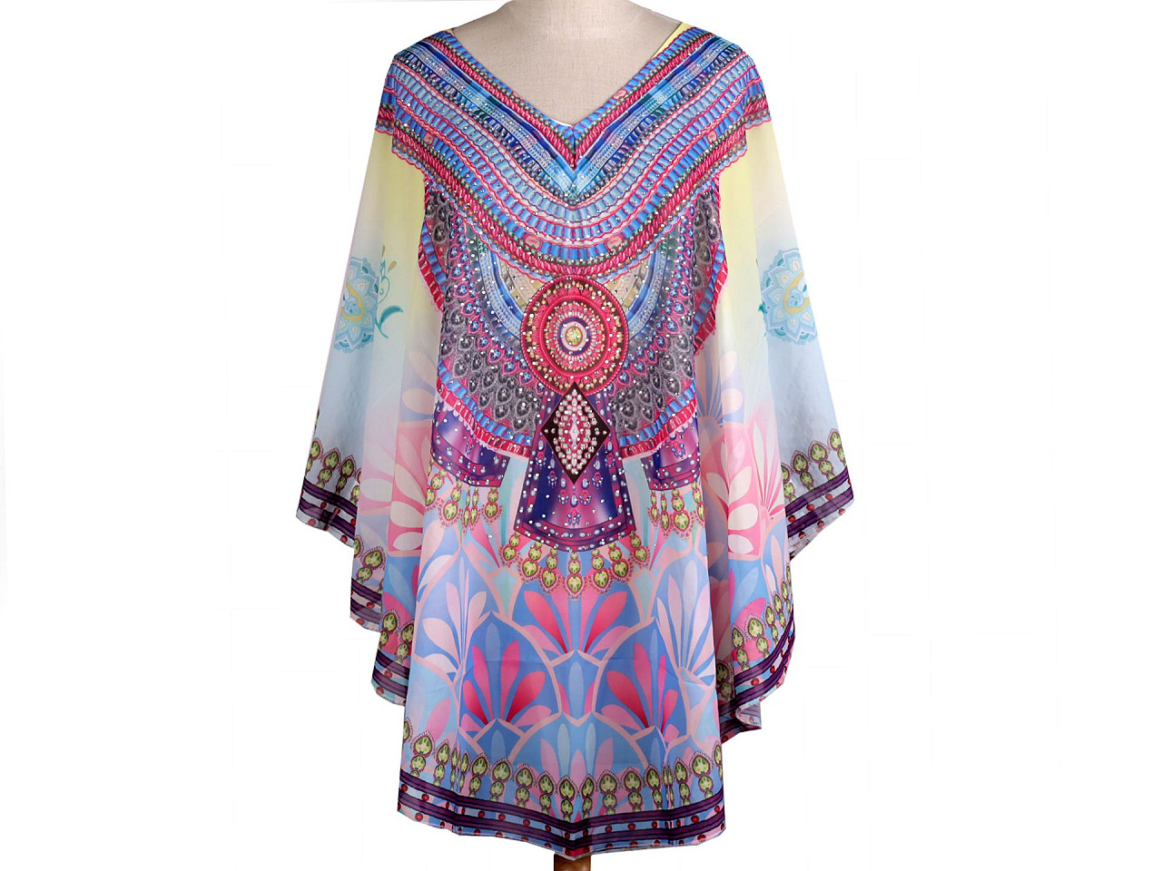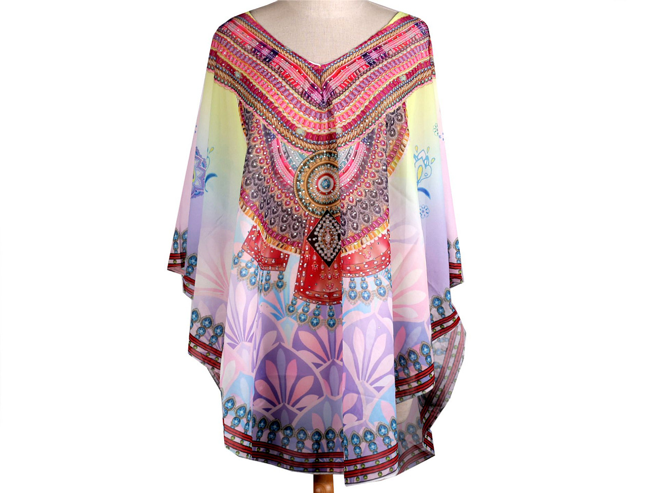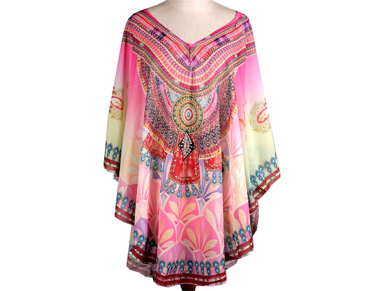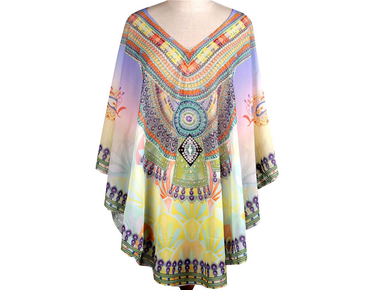 Jemné vzdušné viskózové pončo vám poslúži ako prehoz cez plavky. Zakryje to, čo je potrebné, a zároveň pôsobí sexy. Dá sa nosiť aj ako blúzka. Má univerzálnu veľkosť a je dozdobené trblietavými kamienkami. Pončo môže mať zlý štítok, skutočné zloženie je polyester. Ospravedlňujeme sa za toto nedopatrenie a ďakujeme za pochopenie.