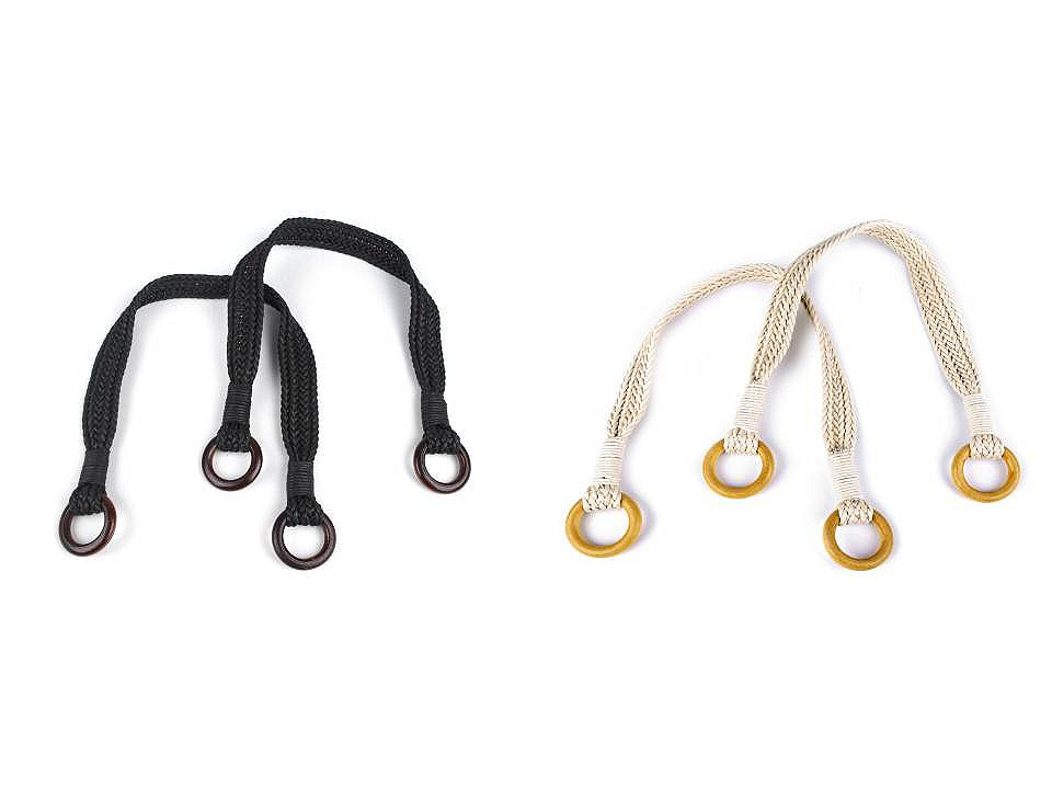 Preplietané uchá na tašky sú vyrobené z textilnej voskovanej šnúry, ktorá je na oboch stranách zakončená drevenými krúžkami. Uchá využijete pri výrobe tašiek alebo kabeliek.Celková dĺžka úch sa môže pohybovať v rozmedzí 50 - 54 cm.