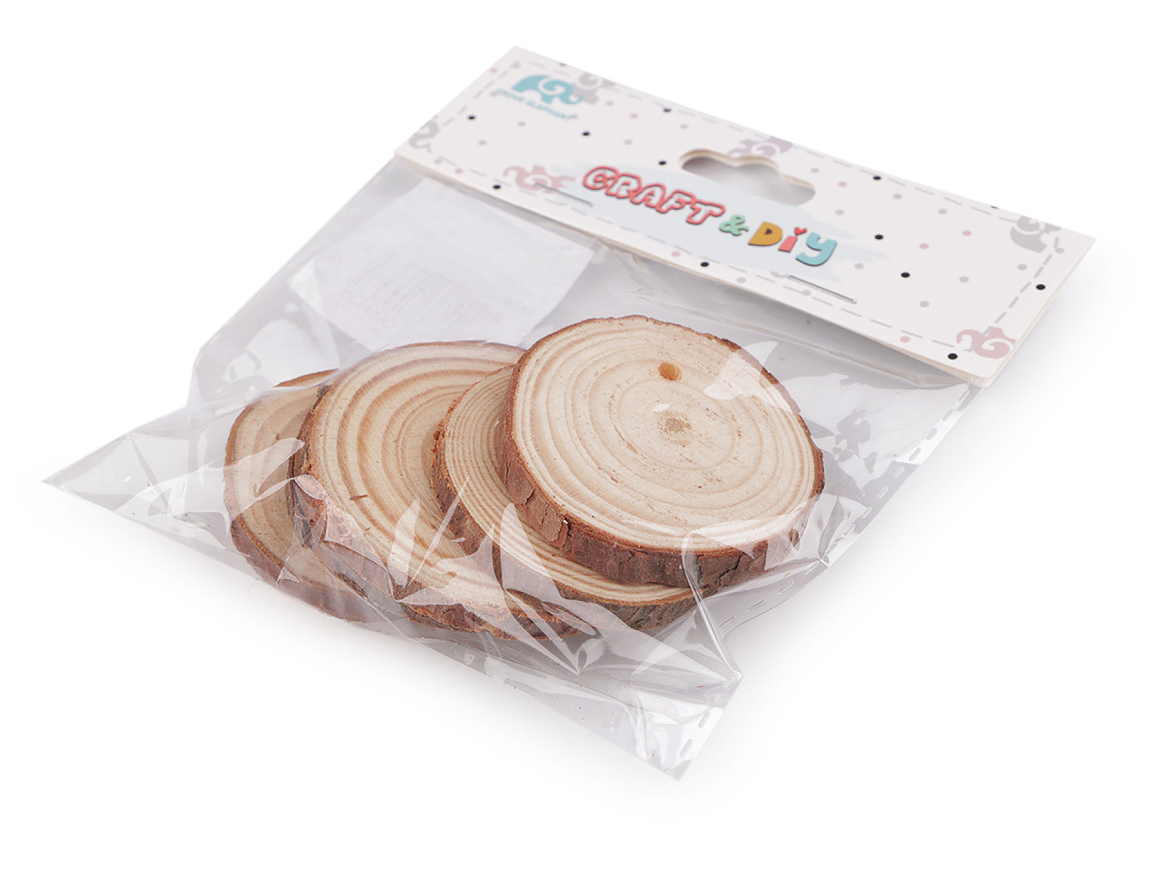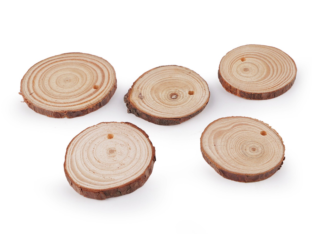 Prírodný drevený prívesok s otvorom na zavesenie sa hodí na ďalšie dotvorenie. Je z oboch strán rovný, po obvode má kôru. Nie je farbený ani lakovaný, každý kus sa môže líšiť ako farbou, tak aj kresbou dreva. Prívesky sú vhodné na ďalšie tvorenie, na výrobu madailí na detské súťaže a tábory, na výrobu talizmanov, visačiek - napríklad s číslami na adventný kalendár, menoviek a pod. Na ozdobenie môžete využiť techniku maľby, decoupage, lakovanie a pod. V jednom sáčku je 5 ks koliesok.