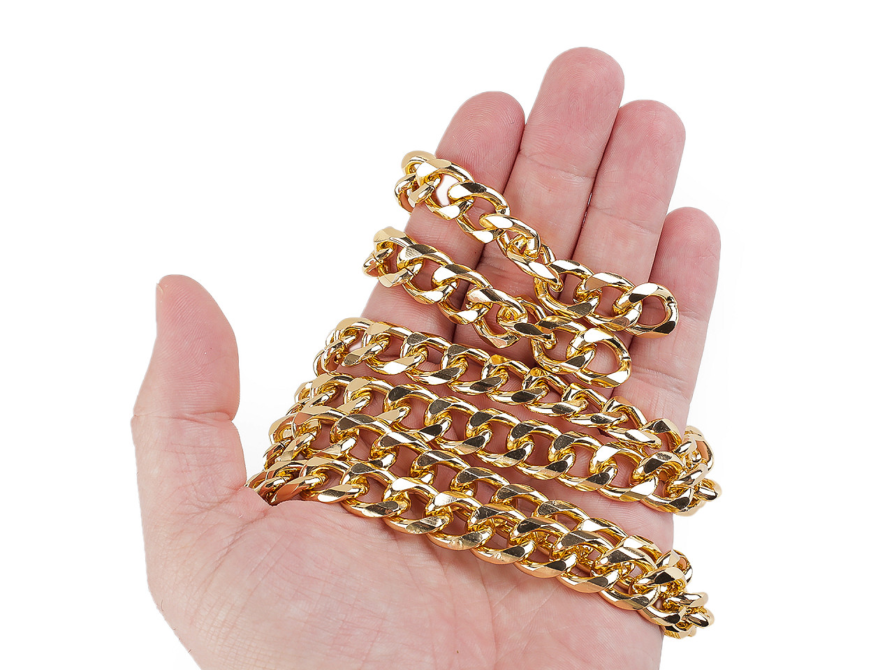 Reťaz je vyrobená z pevného a kvalitného prateľného materiálu. Využijete ho predovšetkým na uchá kabeliek a tašiek, prípadne na ozdobenie odevov a topánok. K reťazi nedodávame zakončovacie karabínky. Hmotnosť 1 m reťaze je cca 100 g , takže sa jedná o ľahkú reťaz.