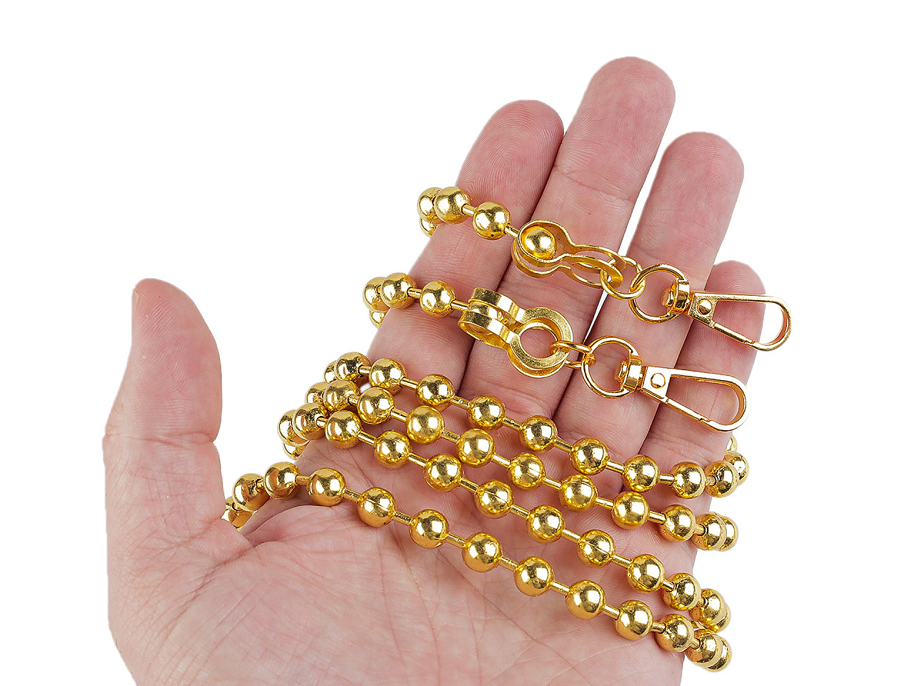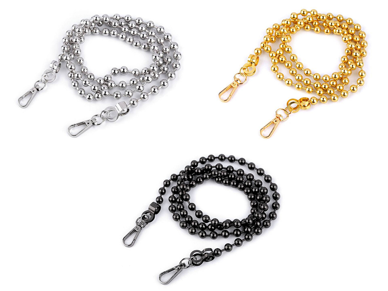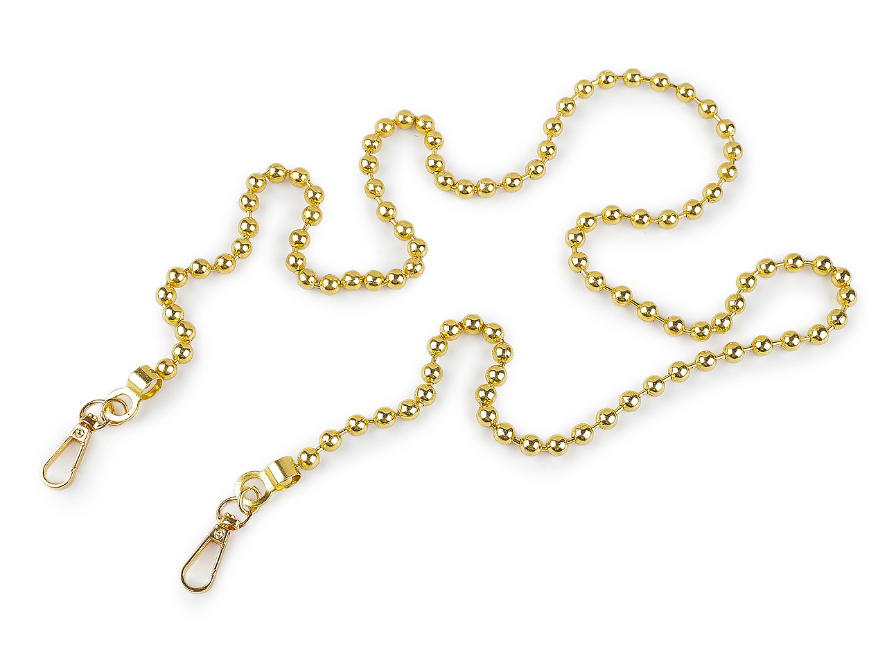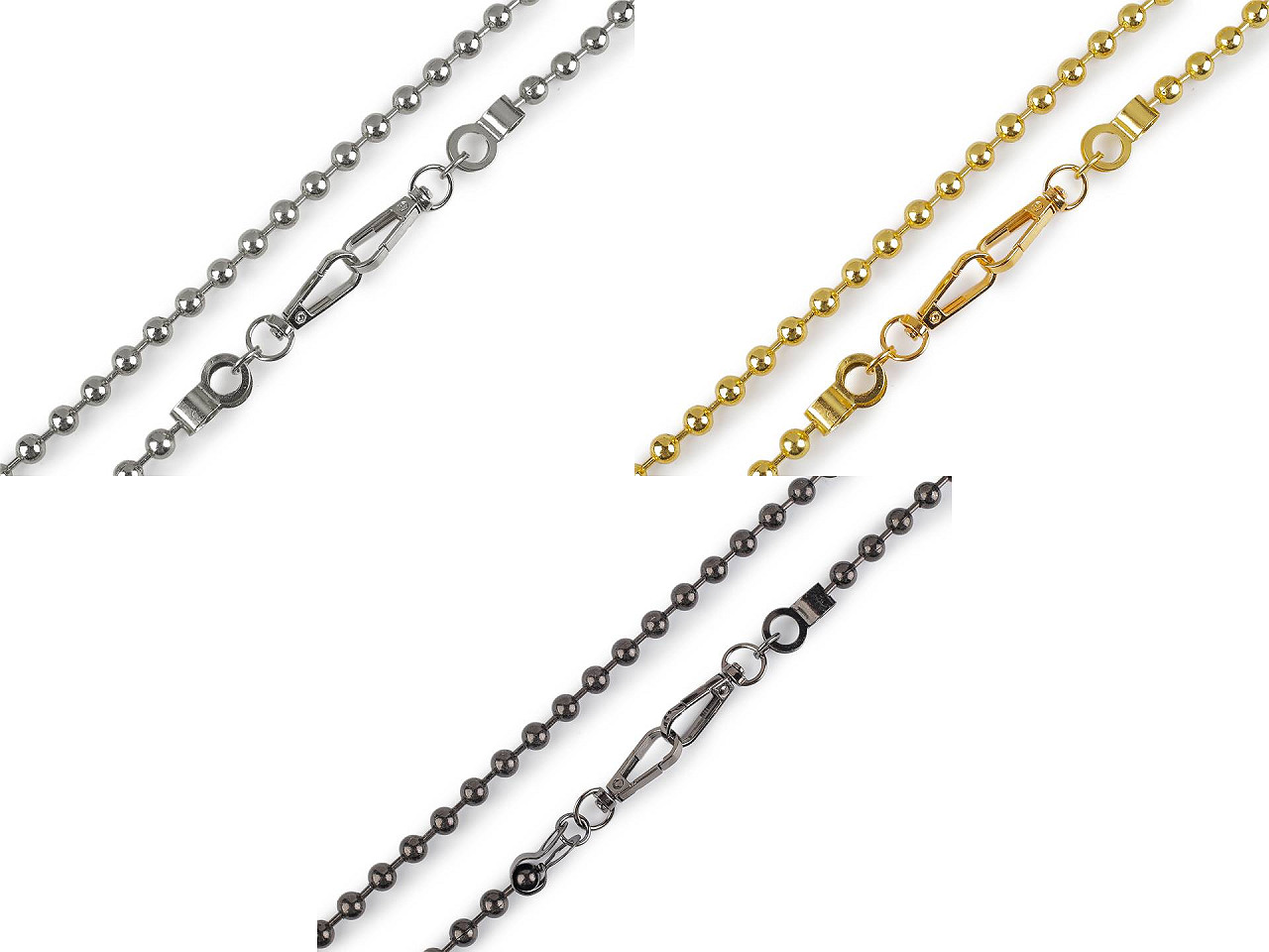 Kovovú guličkovú retiazku využijete na menšie kabelky, listové kabelky či puzdrá na mobilné telefóny. Na oboch jej koncoch nájdete pripevnené karabinky. Retiazka nie je určená na veľkú záťaž.