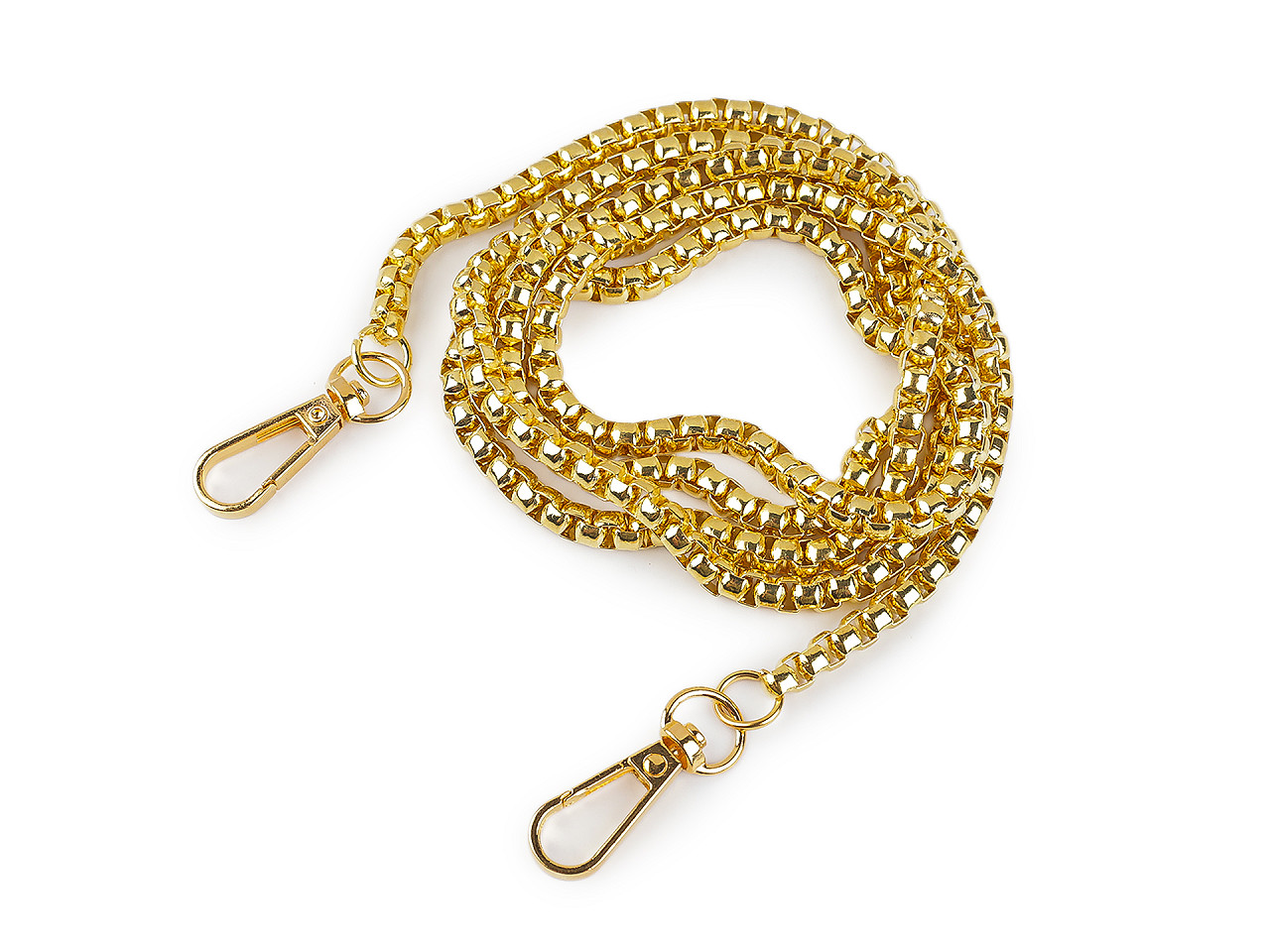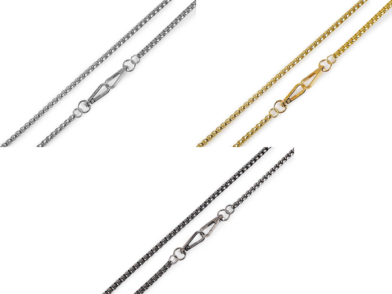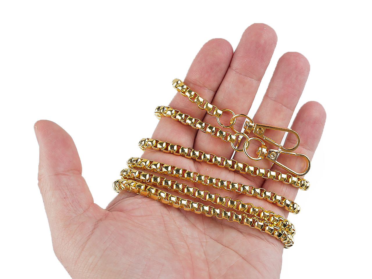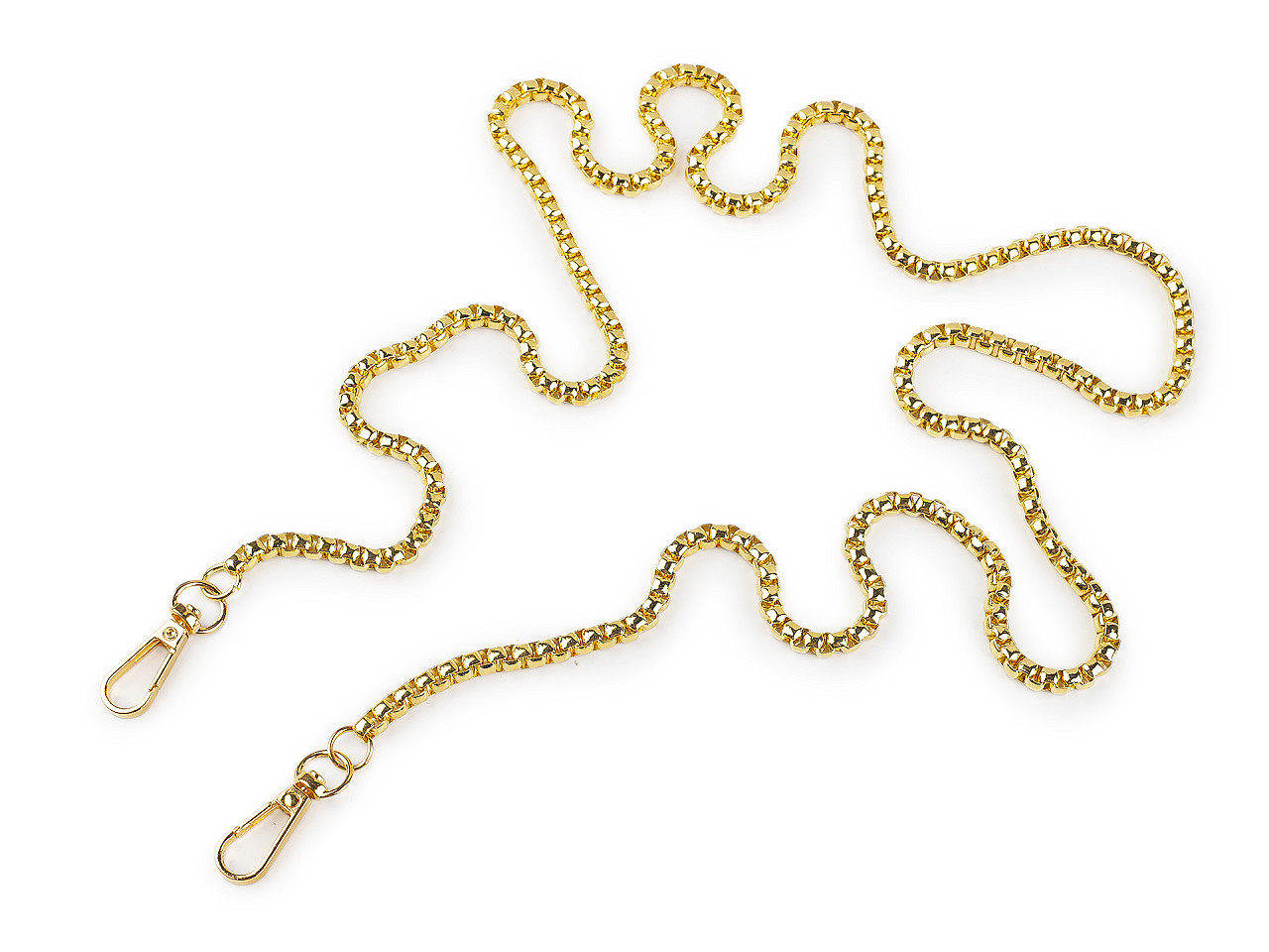 Dizajnovú kovovú retiazku využijete na menšie kabelky, listové kabelky alebo puzdrá na mobilné telefóny. Na oboch jej koncoch nájdete pripevnené karabínky. Retiazka nie je určená na veľkú záťaž.