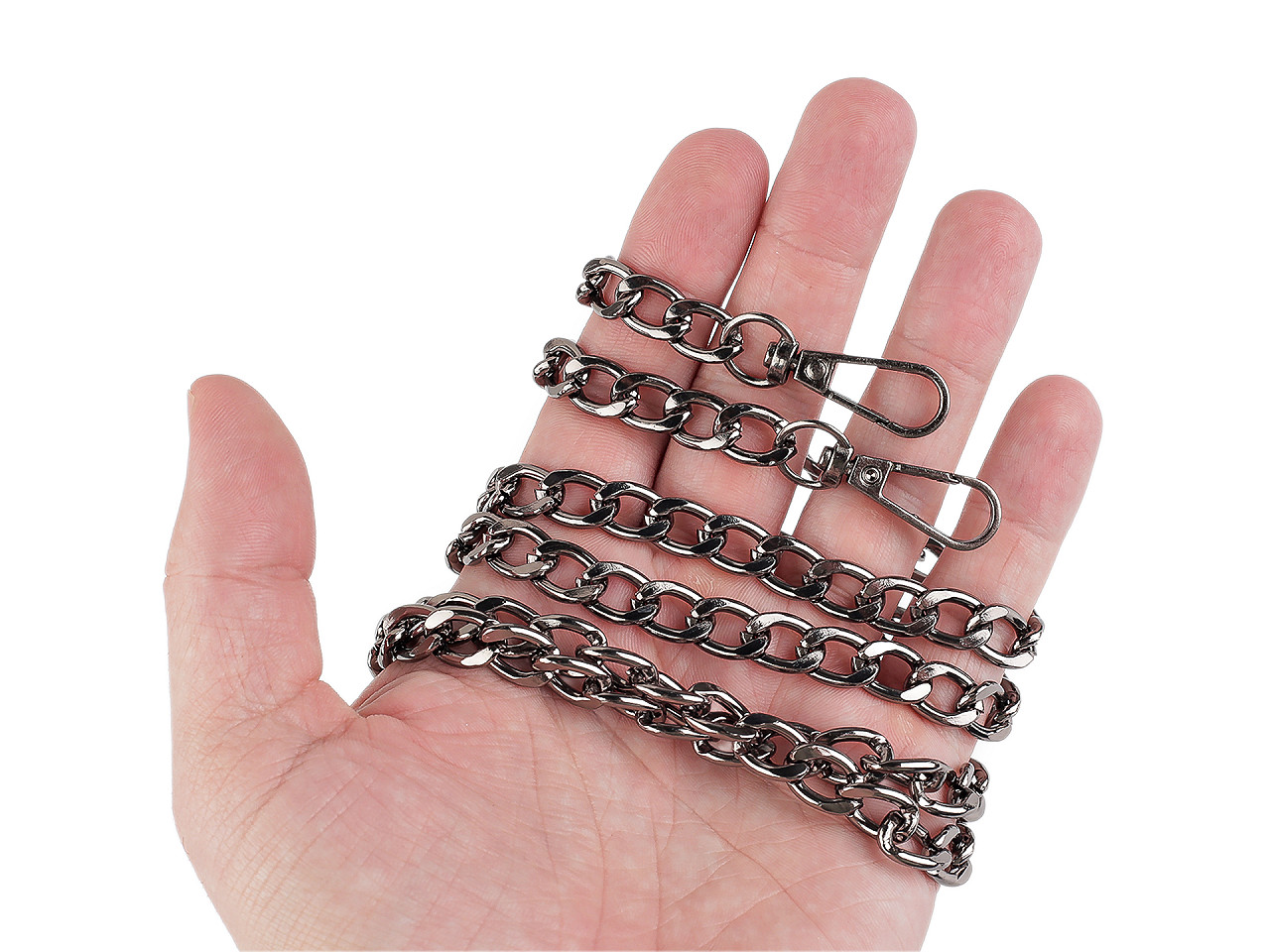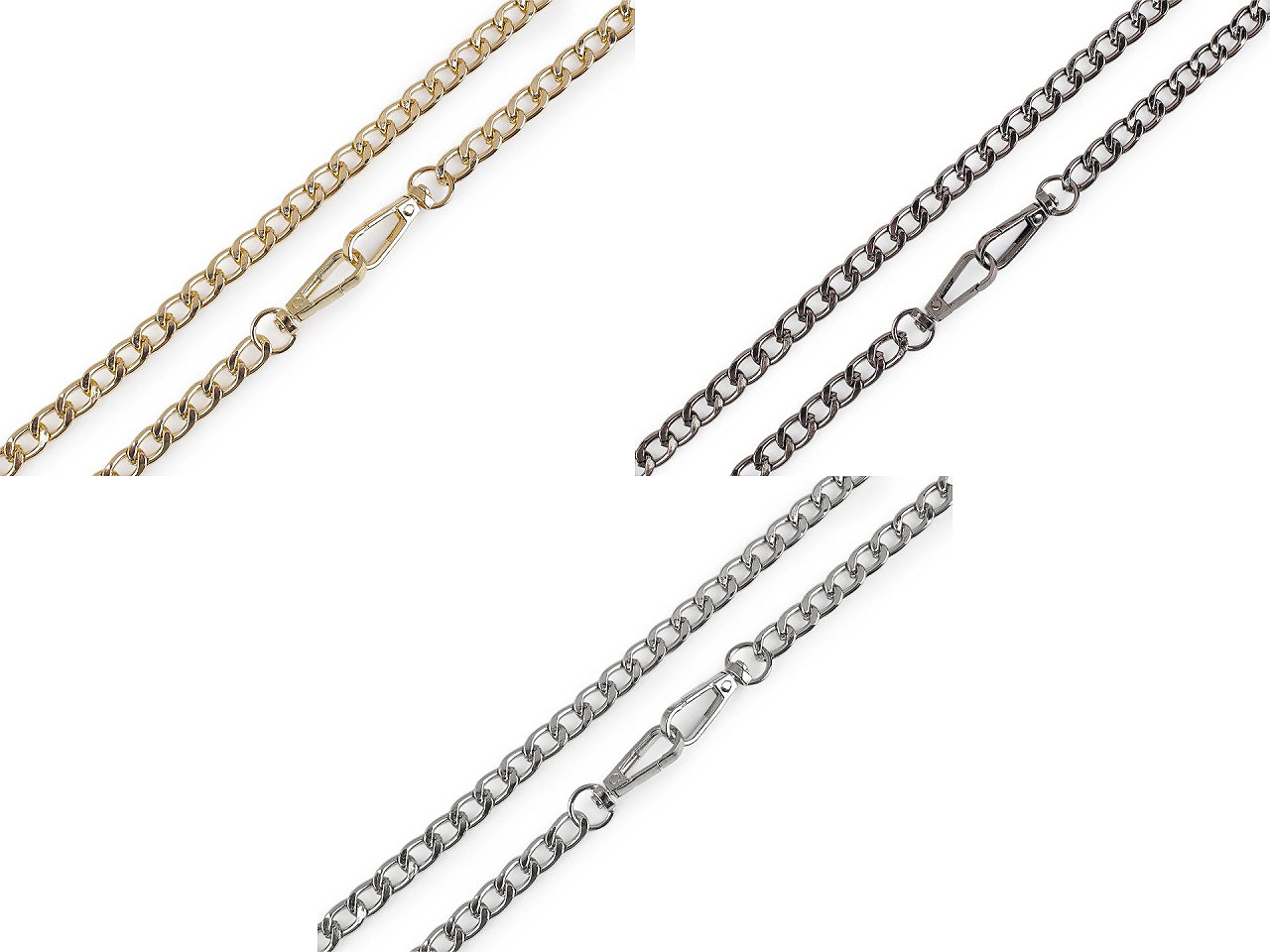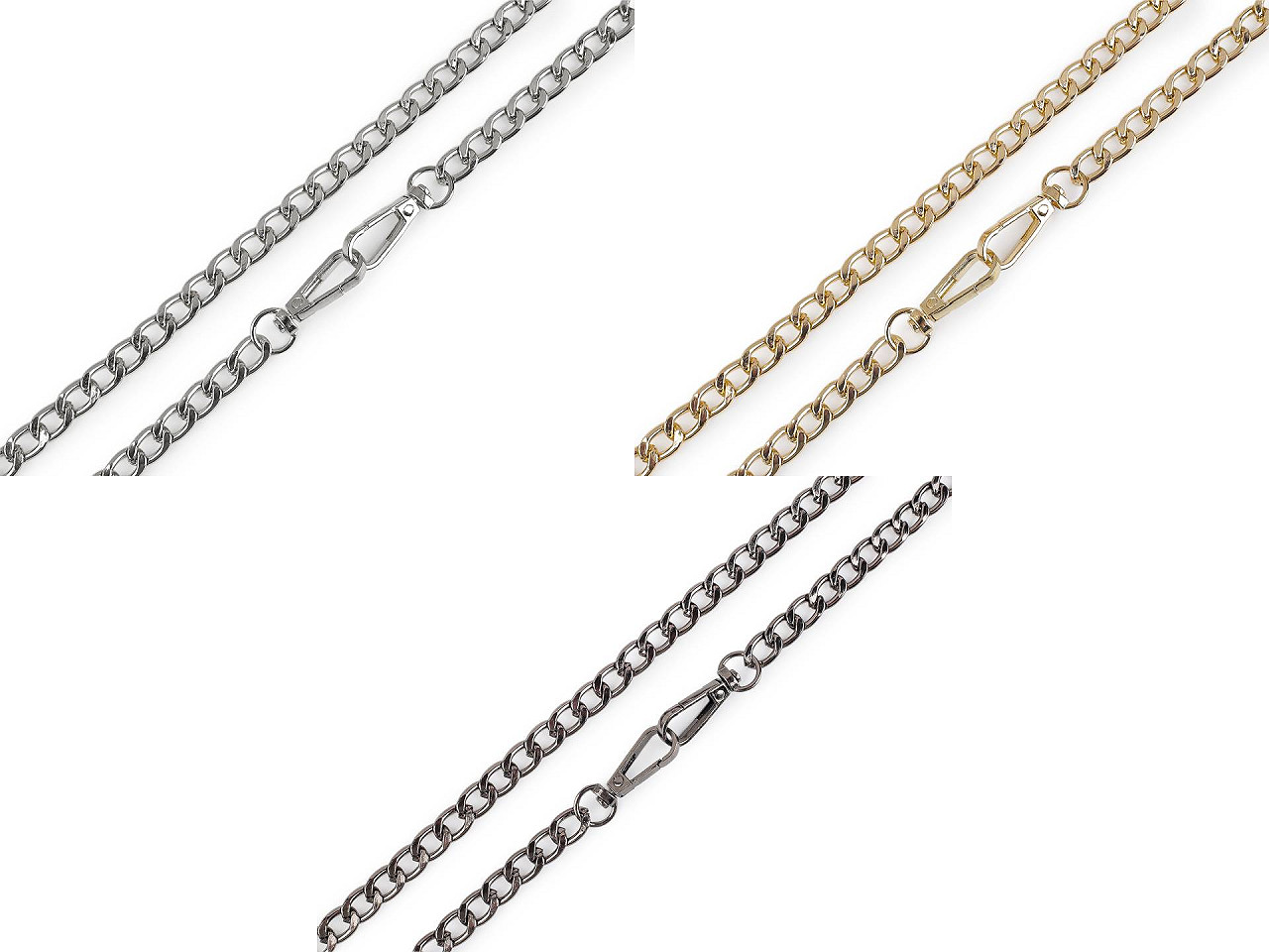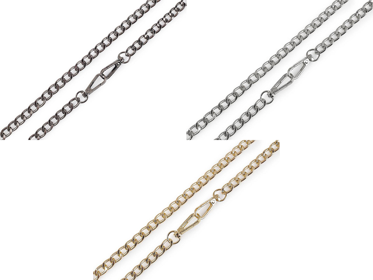 Kovovú retiazku využijete na menšie kabelky, listové kabelky a puzdrá na mobilné telefóny. Na oboch jej koncoch nájdete pripevnené karabinky. Retiazka nie je určená na veľkú záťaž.