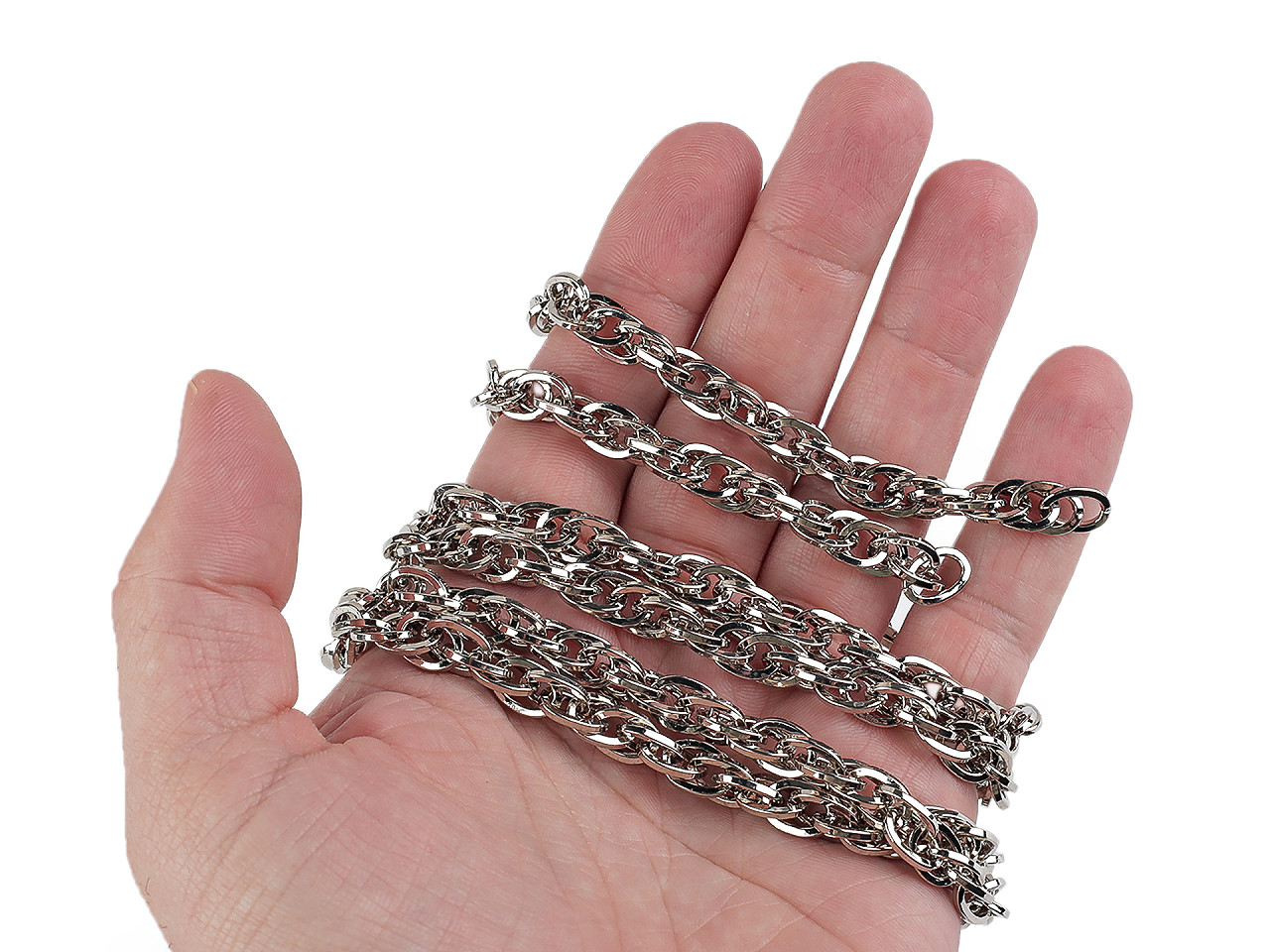 Kvalitne zhotovená retiazka pôsobí veľmi luxusne. Vďaka zdvojeniu očiek je pevná, vyrobená z lesklého materiálu. Jednotlivé očká sú oválne, vyrobené z hranatého drôtu. Nemá žiadne ukončovacie karabínky, naviac, jednotlivé očká sa dajú pomocou klieští rozpojiť. Môžete ho použiť na výrobu kabeliek. Dĺžka retiazky je 120 cm, šírka 0,8 cm. Vnútorné rozmery očka sú 5 x 8 mm, vonkajšie rozmery 8 x 10 mm. Hrúbka drôtu 1,2 - 1,3 mm. Retiazka nie je určená na veľkú záťaž.