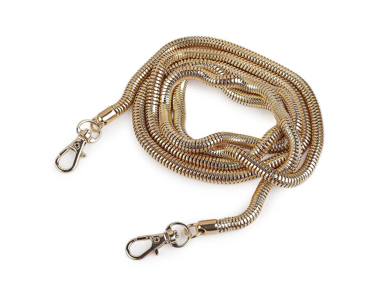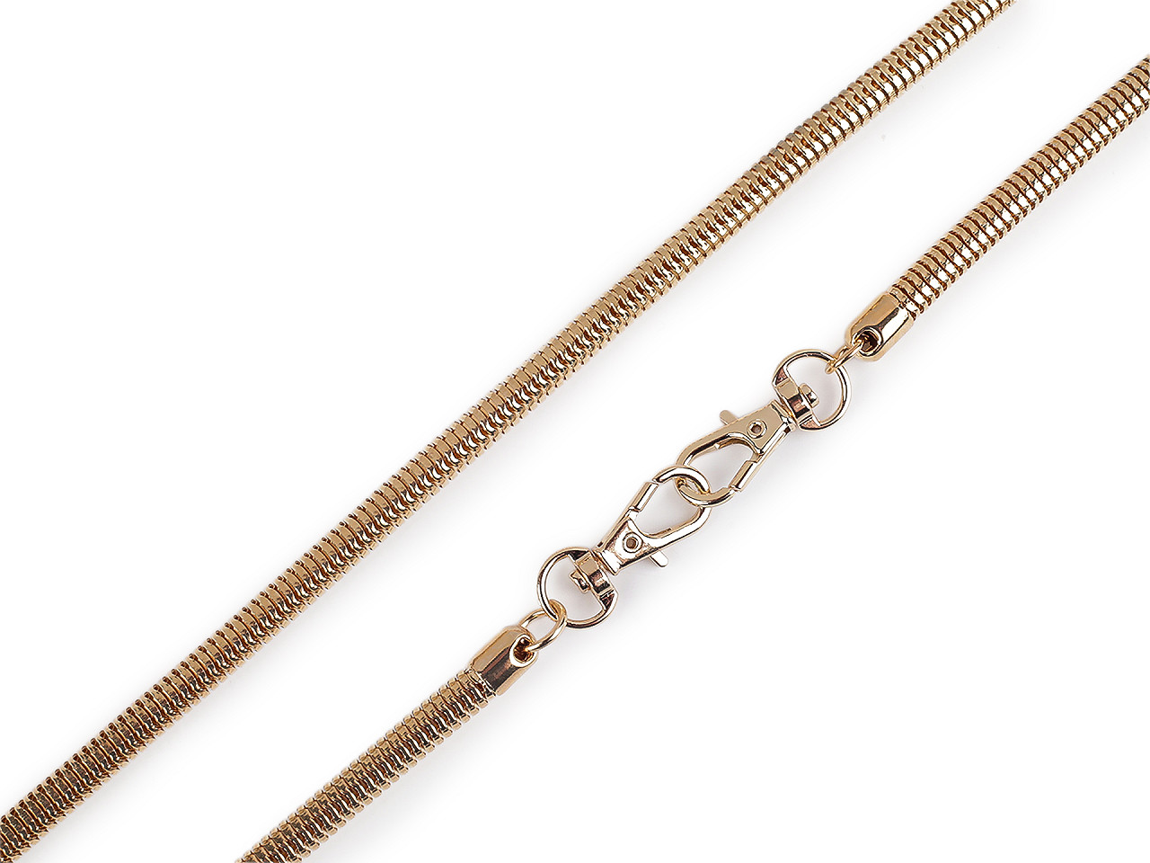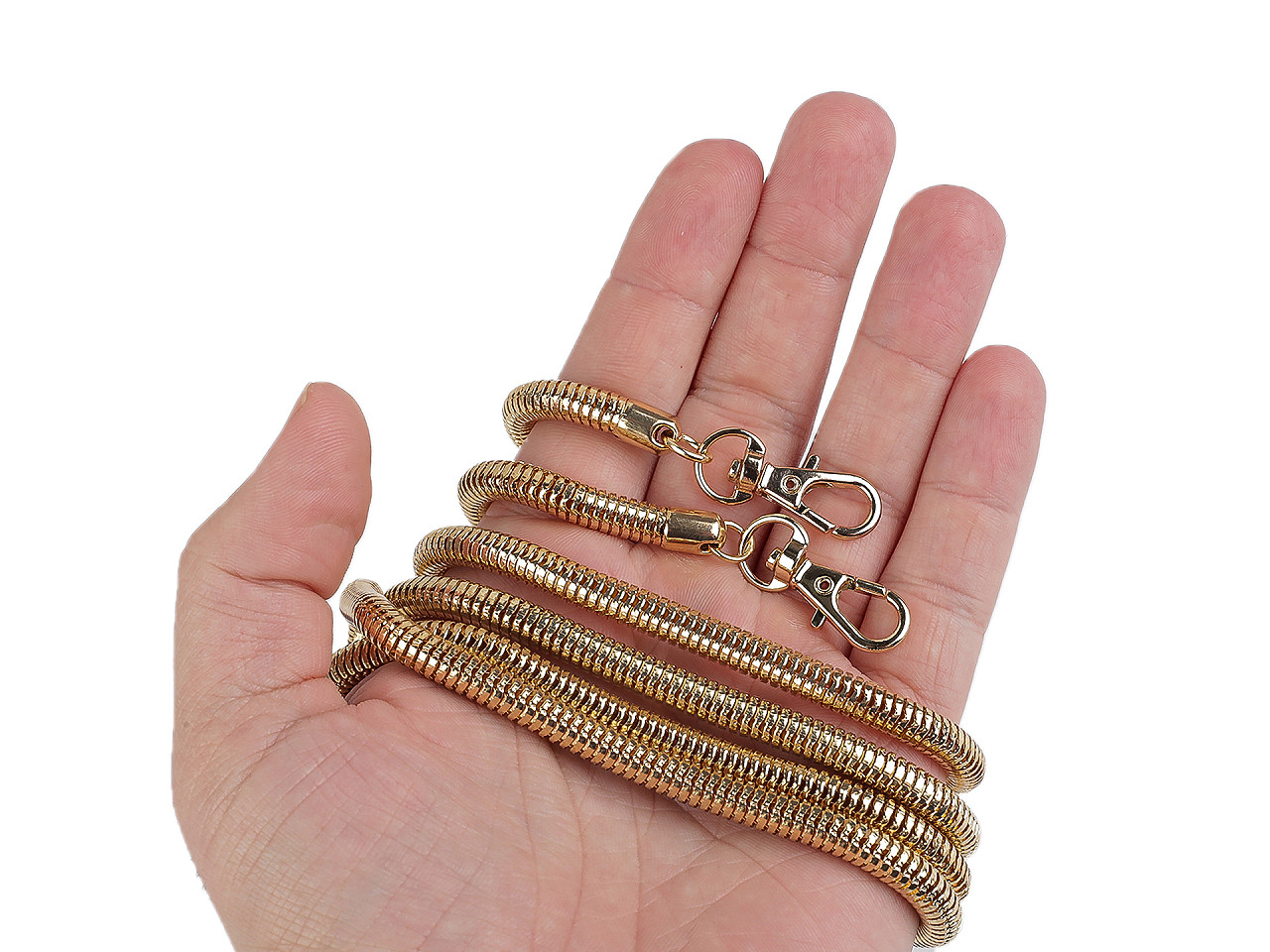 Kovovú retiazku v hadom štýle využijete na kabelky a listové kabelky. Karabínky umožňujú jeho rýchle a jednoduché pripevnenie. Retiazka je okrúhla a svojím spracovaním pripomína hada a pohyby jeho tela.