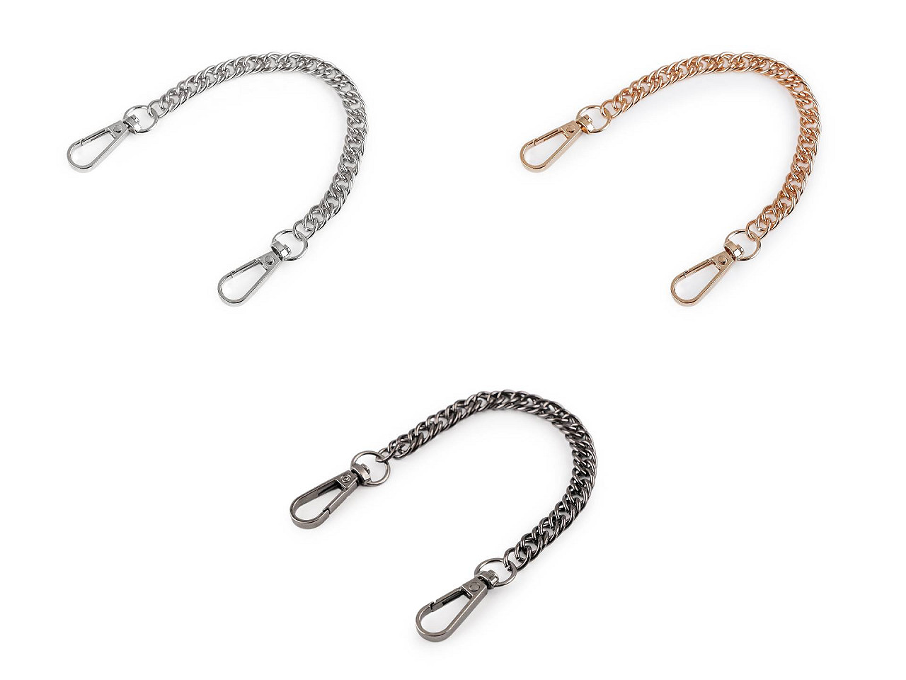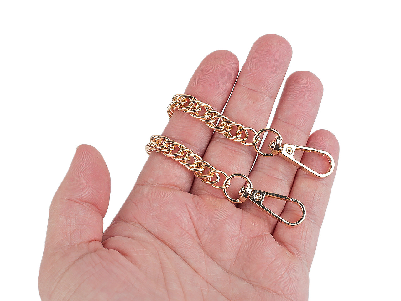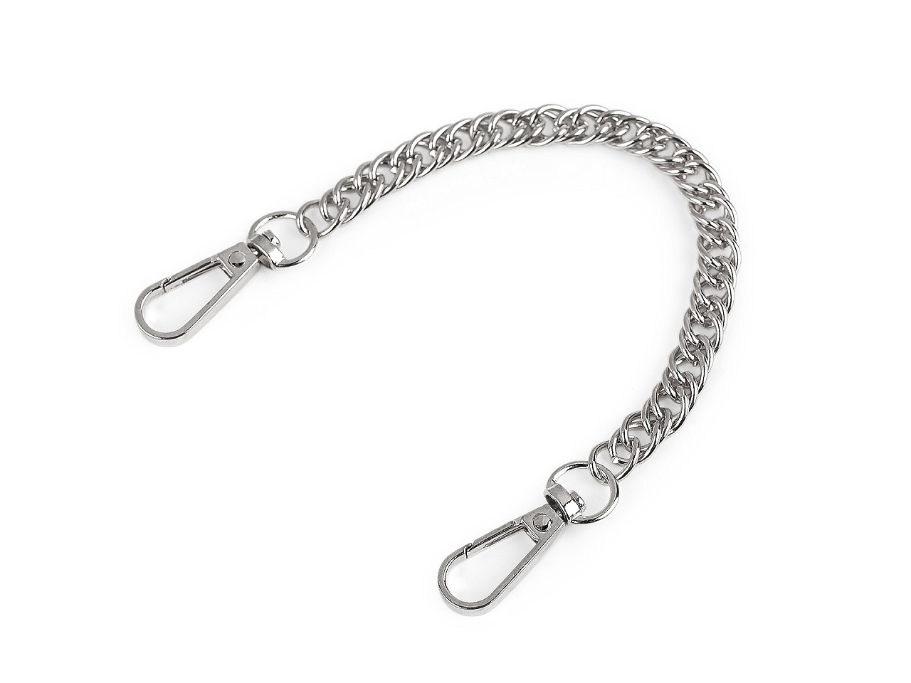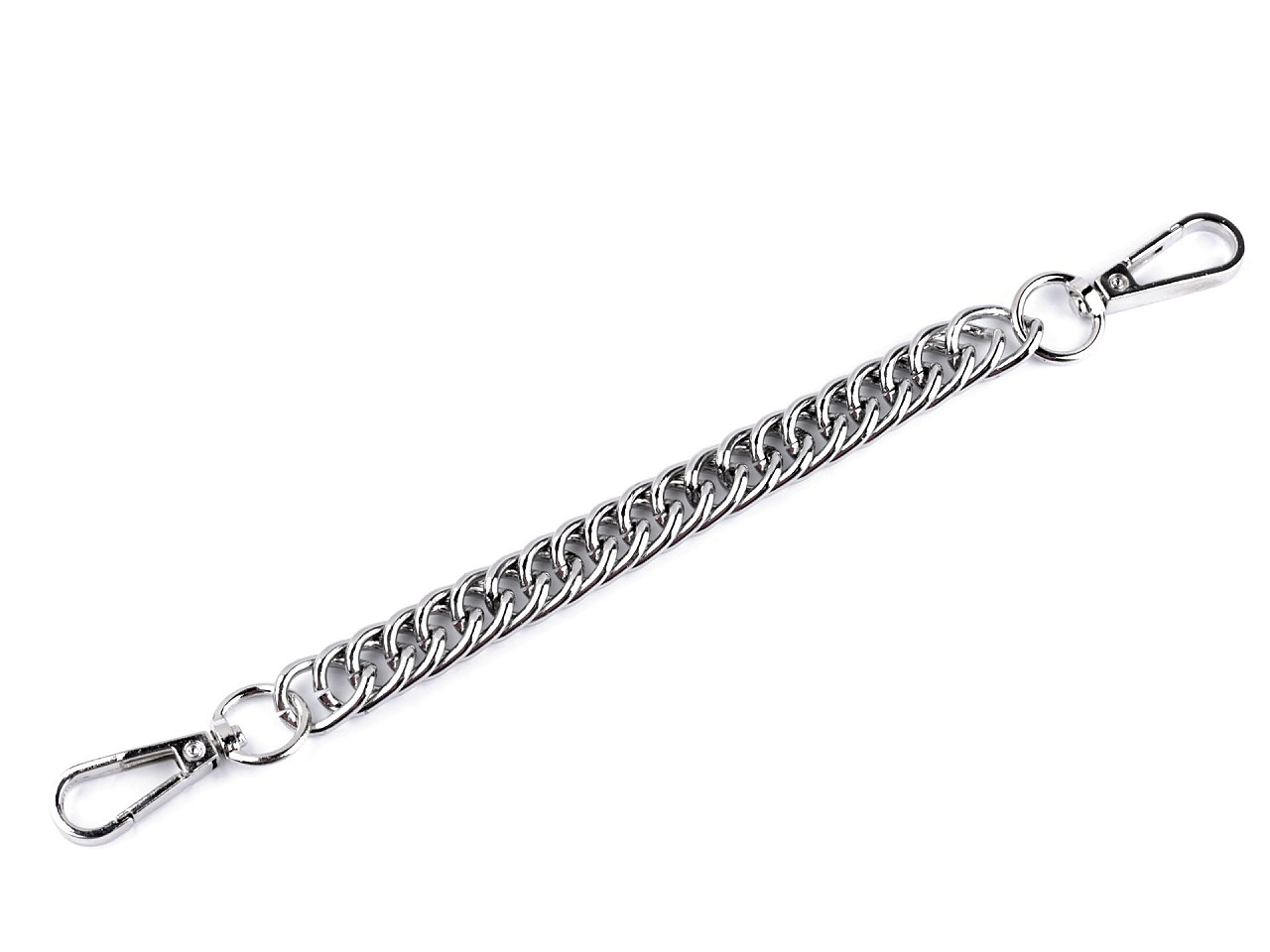 Krátka kovová retiazka vynikne ako štýlové ucho na kabelke, listovej kabelke aj napríklad mestskom batohu. Na oboch jej koncoch nájdete pripevnené karabínky. Retiazka nie je určená na veľkú záťaž.