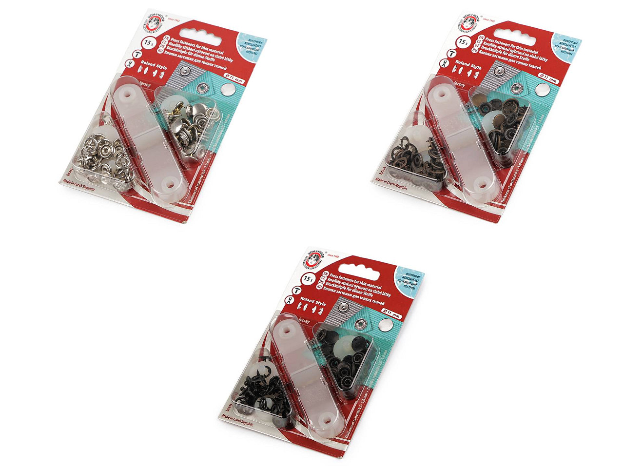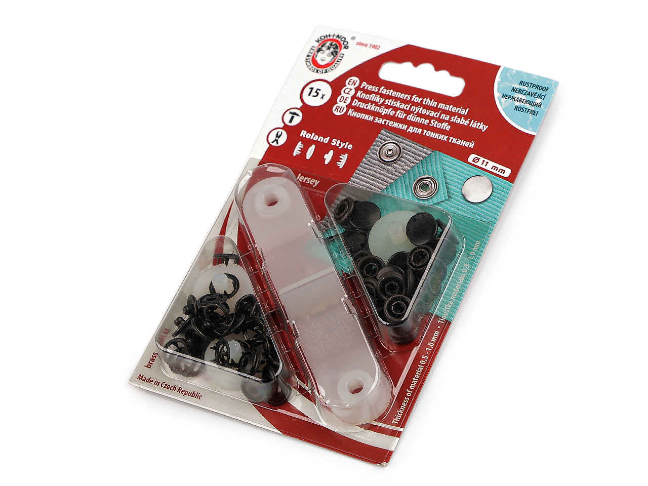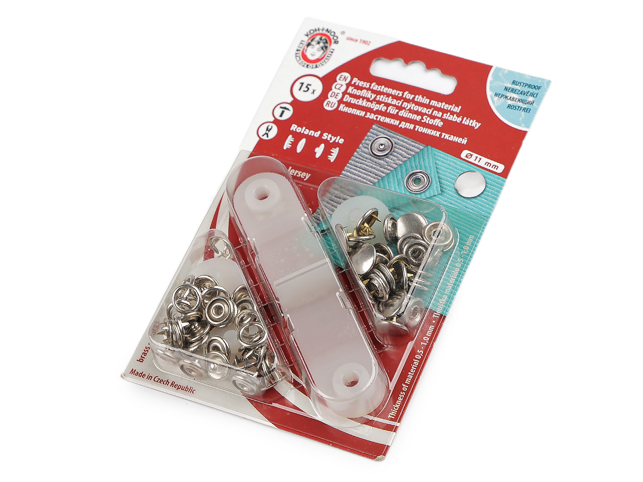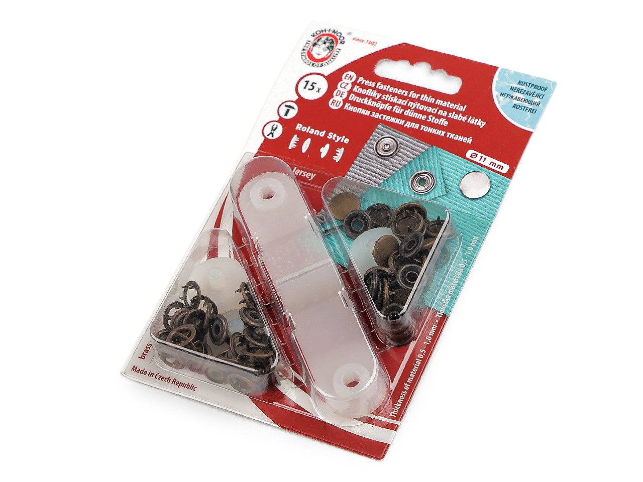 Stláčacie gombíky Roland style sa používajú na spájanie jemných a poddajných druhov látok - košeľovina a i. Nitovanie sa vykonáva mini lisom, ktorý je súčasťou balenia.