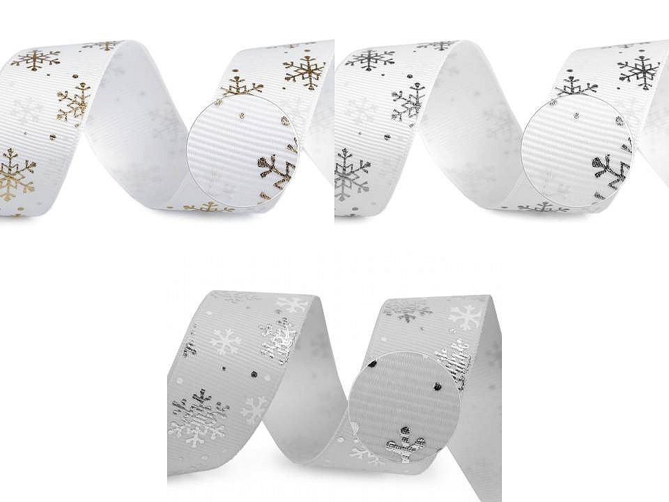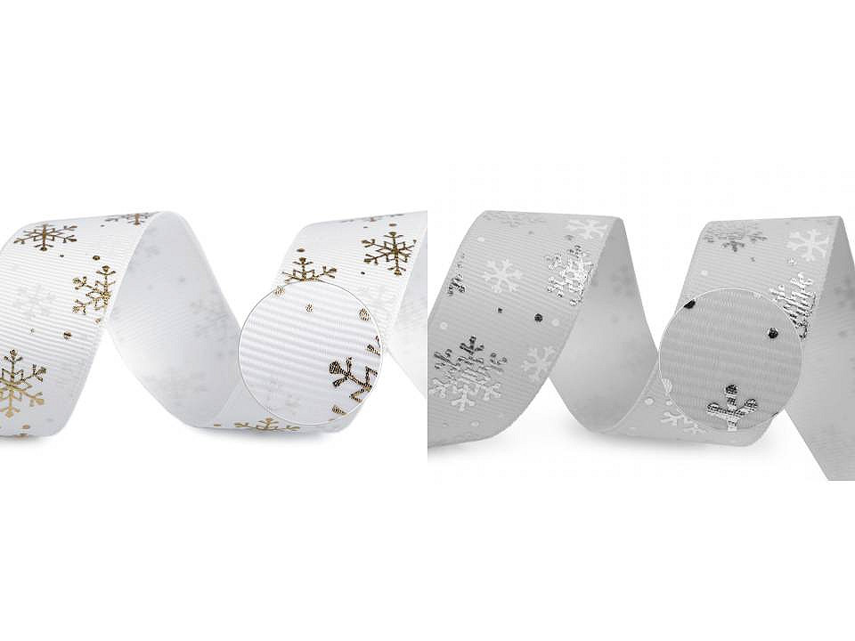Dekoračná rypsová stuha s potlačou snehových vločiek má na povrchu typické jemné rebrovanie. Potlač je jednostranná, metalická, pripomína lurex.