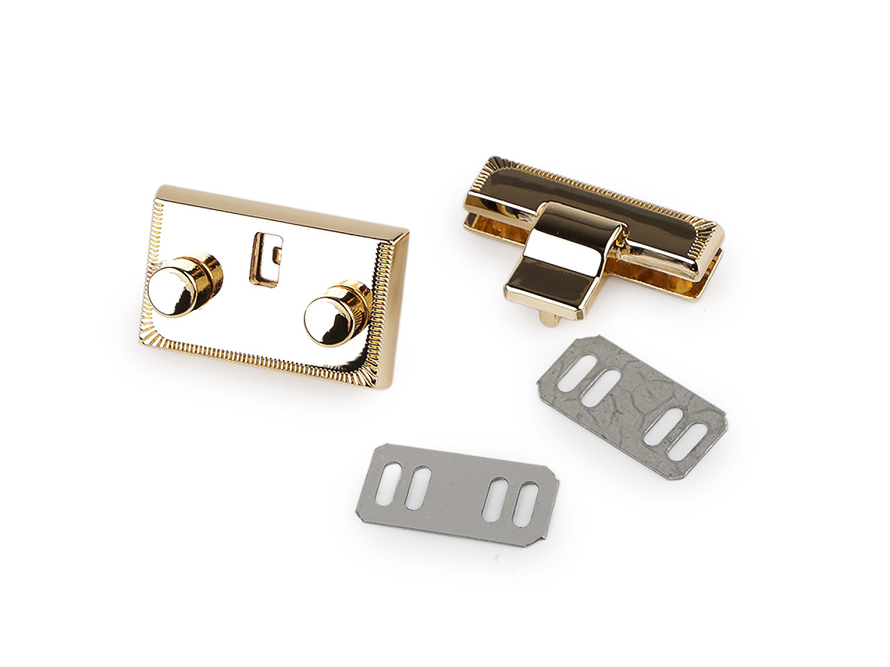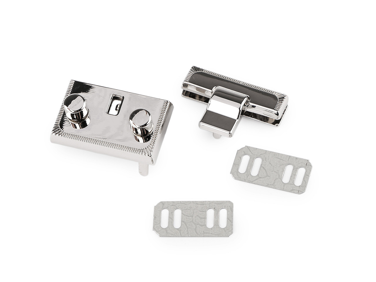 Zdobené kovové zapínanie vynikne na taškách, kabelkách a elegantných batohoch s klopou. Otvára sa posunutím gombíka. Horný diel sa pripevňuje pomocou priložených skrutiek. Spodný diel sa upevňuje nožičkami, ktoré sa z rubovej strany zaistia plieškami. Sada obsahuje kovové zapínanie, ktoré sa skladá z 2 kusov, 2 skrutky a 2 pliešky.