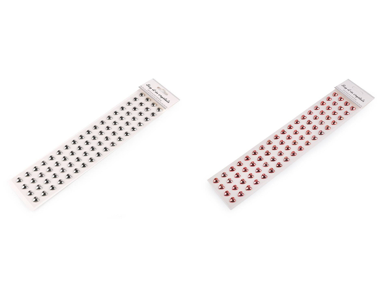Kamienky v tvare sŕdc sú veľmi pútavé, majú metalický lesk . Všetky sú nalepené na jednom archu podkladovej fólie, z ktorej ich stačí sňať. Srdiečka sú v radoch navzájom spojené lepiacim prúžkom, takže tvoria pásiky. Celkom tu nájdete 4 pásiky (v každom je 18 srdiečok). Môžete ho aj nastrihať na jednotlivé kúsky. Ozdoby odporúčame lepiť na suchý, hladký a pevný povrch. Využijete ich na zdobenie mobilov, tabletov, počítačov, prianí, krabičiek, zrkadiel, rámčekov fotografií, kvetináčov, denníkov, fotoalbumov a pod. V neposlednom rade ich ocenia aj nevesty na výrobu svadobných oznámení, výväzkov, menoviek a pod.