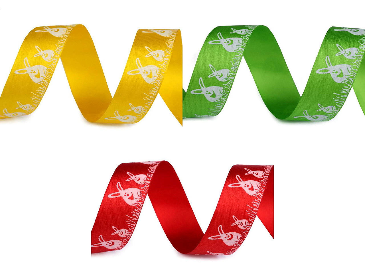 Dekoračná saténová stuha s pútavou potlačou zajačikov v tráve . Potlač je jednostranná. Použitie: stuha je určená na dekoráciu veľkonočných väzieb, na oživenie kvetináčov, obrusov a ďalších veľkonočných ozdôb. Je vhodná aj na ozdobné balenie darčekov, môžete ju koledníkom uviazať na korbáč.