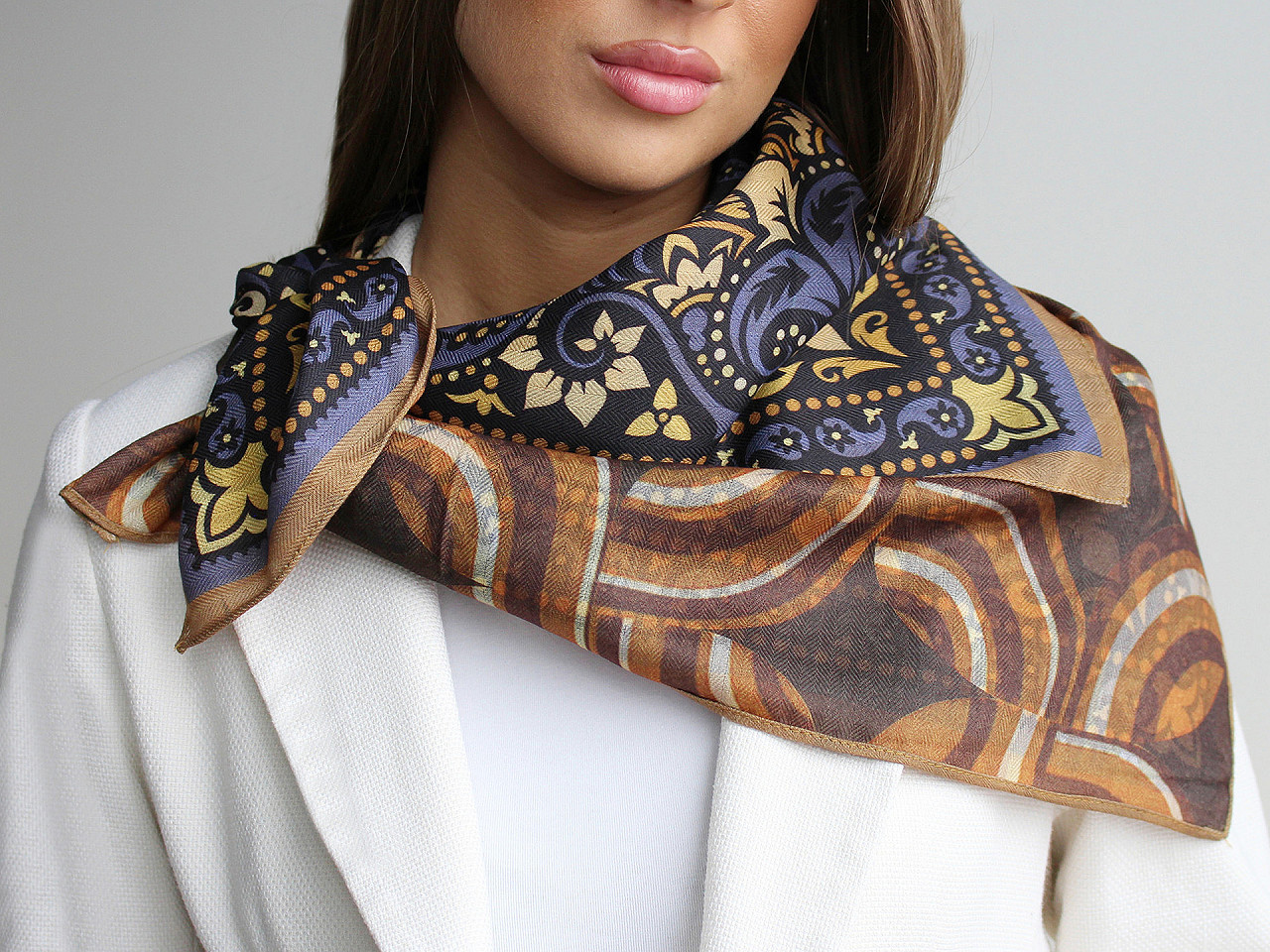 Šatku z imitácie kašmíru využijete na každodenné nosenie. Vyniká svojou eleganciou a univerzálnosťou. Jej materiál krásne splýva , príjemne vás zahreje. Je obojstranná , ale z druhej strany má farby naopak, je svetlá. Niektoré šatky majú zlé štítky, skutočné zloženie je viskóza a polyester. Ospravedlňujeme sa za toto nedopatrenie a ďakujeme za pochopenie.