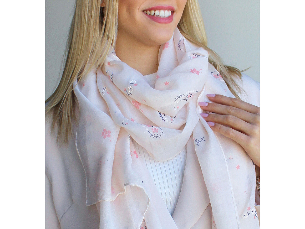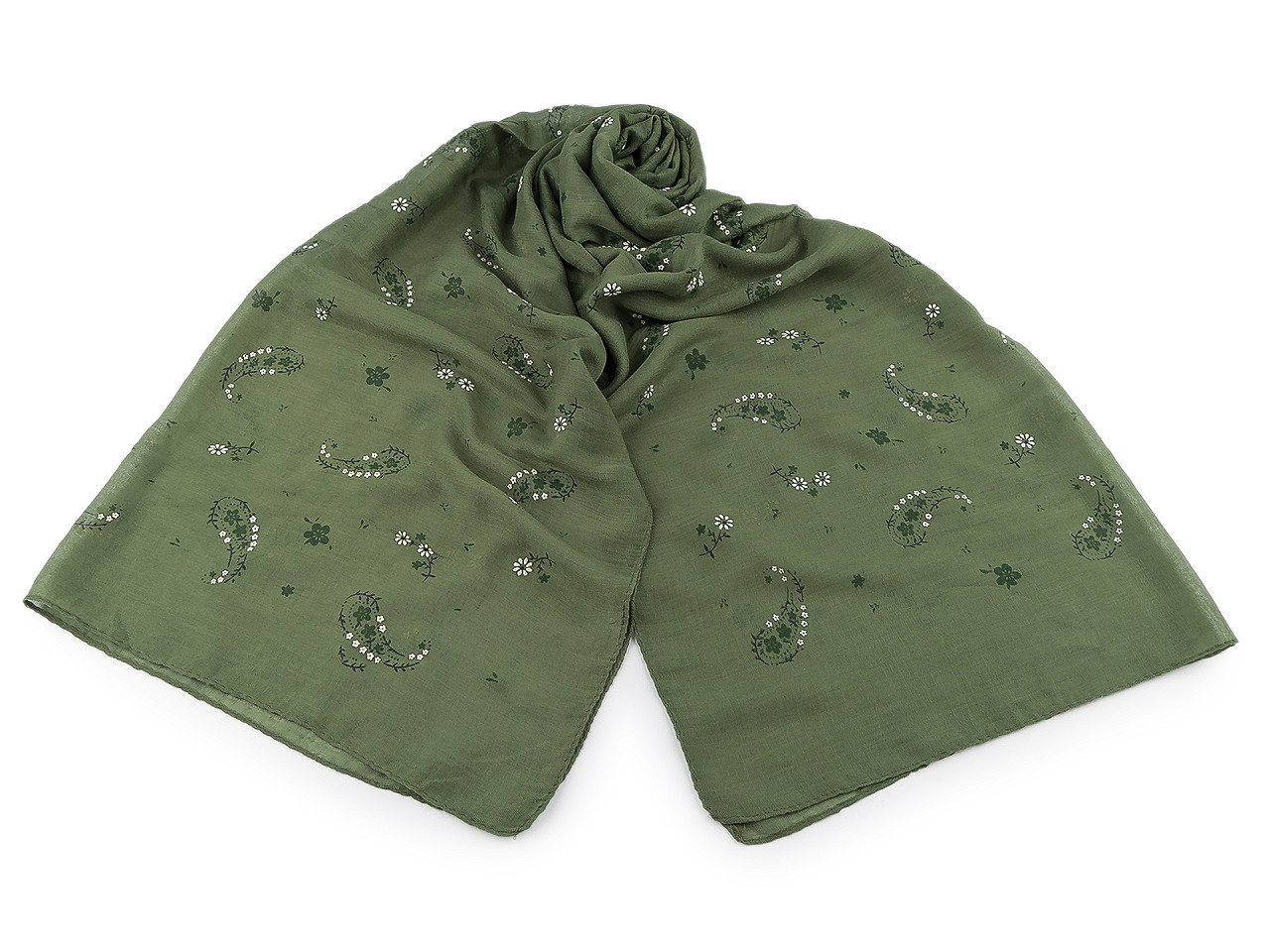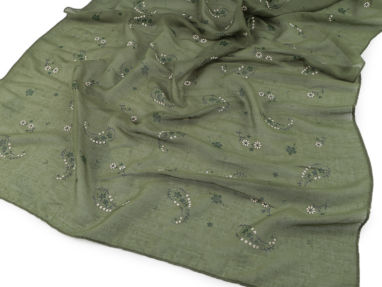 Šatka s obľúbeným vzorom paisley je vzdušná a ľahučká , veľmi príjemná na dotyk. Niektoré kvetinky sú zvýraznené gumovou potlačou. Šatka je jemne priesvitná , decentne doladí váš outfit, či už si vezmete sako, blúzku, svetrík alebo šaty. Šatky môžu mať zlé štítky, skutočné zloženie je 100% polyester.