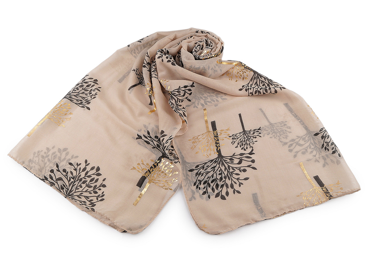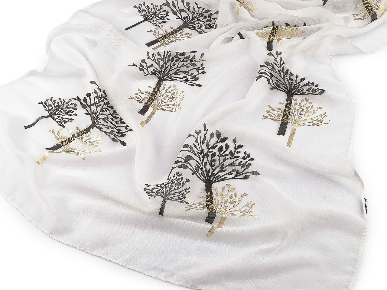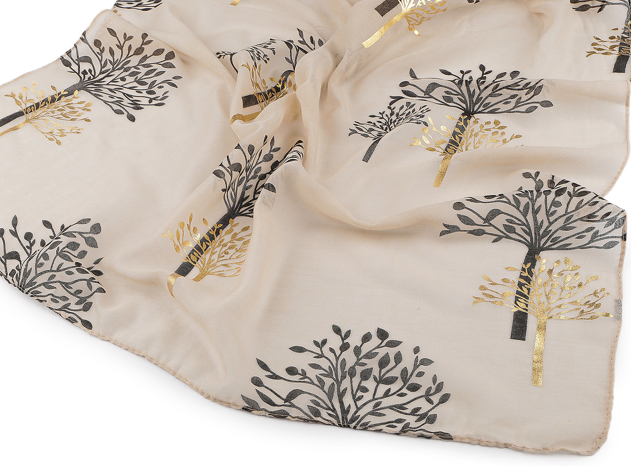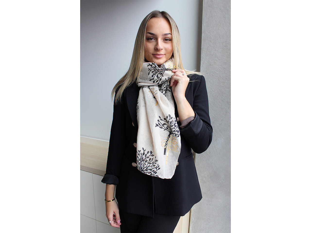 Šatka s potlačou vetvičiek je veľmi príjemná na dotyk, je vzdušná a ľahká . Niektoré vetvičky sú zvýraznené zlatou metalickou farbou . Šatka bude elegantným doplnkom pre každú príležitosť, doladí váš outfit, či už si vezmete sako, blúzku, svetrík alebo šaty. Hodí sa k formálnym aj neformálnym outfitom, môžete ju ľahko kombinovať s vašim šatníkom. Šatky môžu mať zlé štítky, skutočné zloženie je polyester.