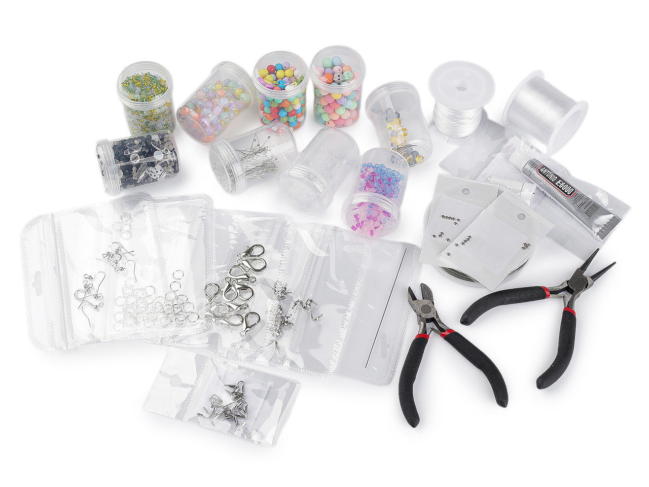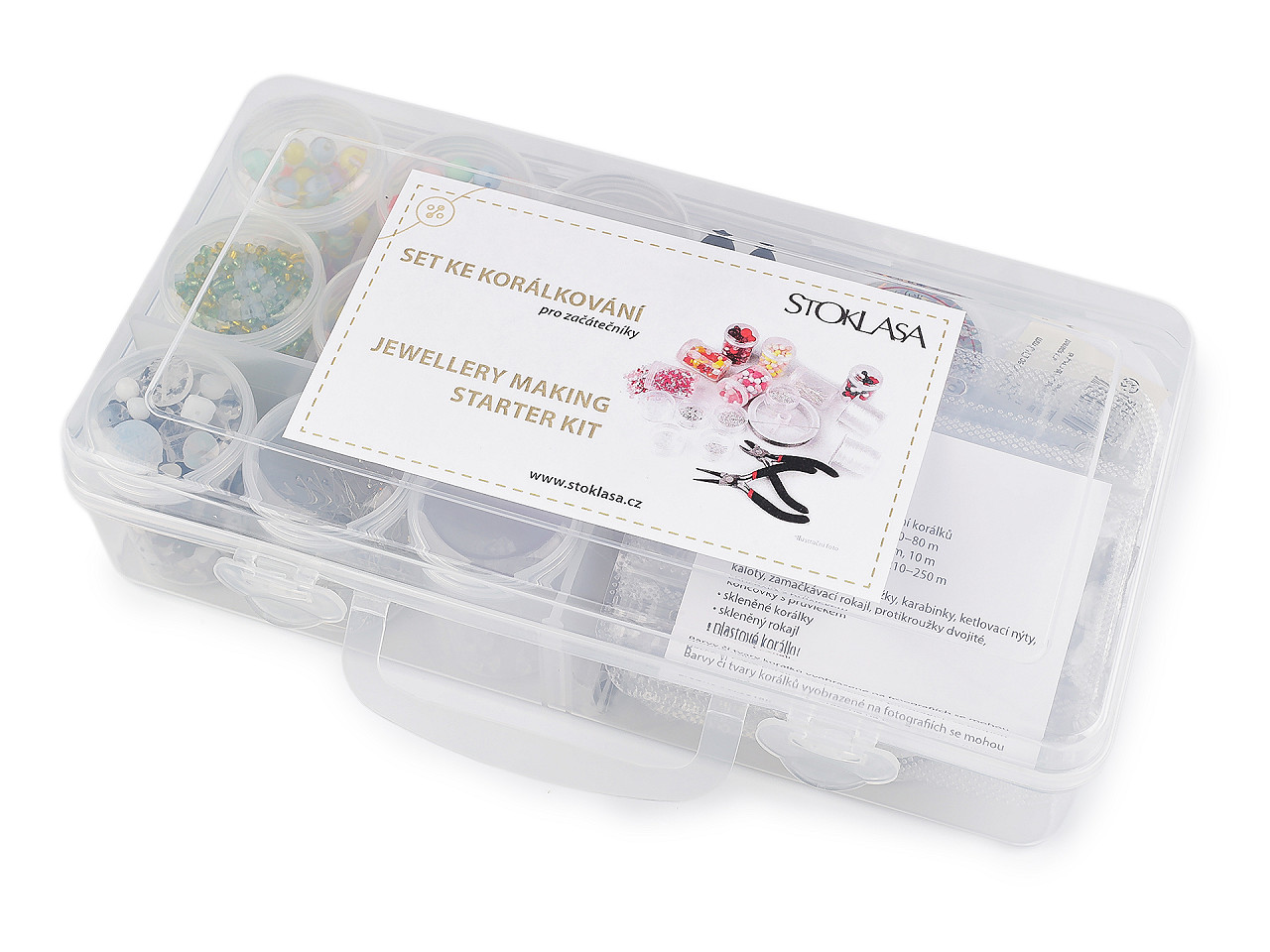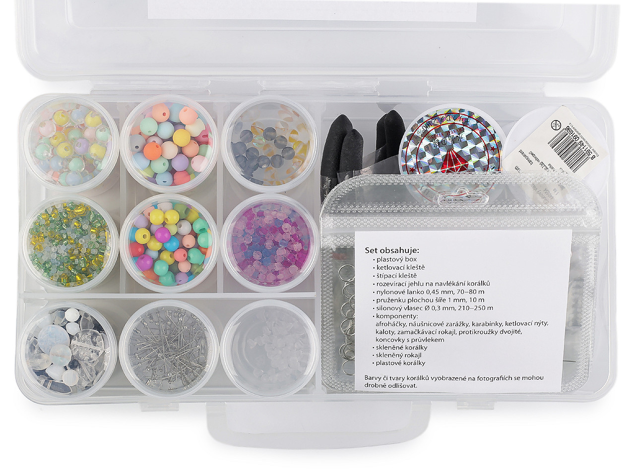 Veľký korálkový set je vhodný pre začiatočníkov, ale aj pokročilejších. Všetko je uložené v praktickom plastovom boxe. Set obsahuje: - plastový box - ketlovacie kliešte - štiepacie kliešte - roztváraciu ihlu na navliekanie korálikov - komponenty: afroháčiky, náušnicové zarážky, karabínky, ketlovacie nity, kaloty, zatláčací rokajl, protikrúžky dvojité, koncovky s prievlakom - lepidlo na šperky - nylonové lanko Ø 0,45 mm, 70 - 80 m - gumičku plochú šírka 1 mm, 10 m - silónový vlasec Ø 0,3 mm, 210 - 250 m - sklenené koráliky - sklenený rokajl - plastové koráliky Farby či tvary korálikov vyobrazené na fotografiách sa môžu drobne odlišovať.