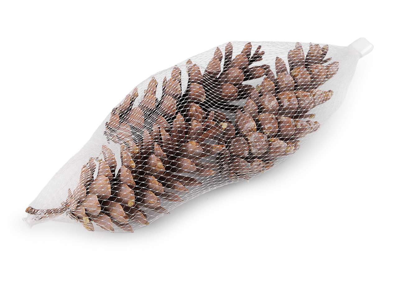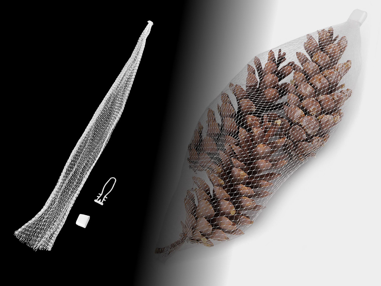 Flexibilná sieťka slúži ako obalový materiál. Je vhodná na prírodné dekorácie (šišky, drevo a pod). Tovar v nej môže "dýchať", nezaparí sa a nesplesnivie. Navyše sa vďaka svojej flexibilite v obvode pekne prispôsobí. V dolnej časti je sieťka zatavená. Hornú časť zabezpečíte plastovou koncovkou s háčikom , nie je teda problém sieťku kamkoľvek zavesiť.