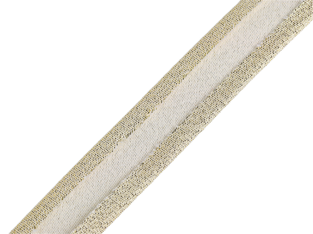 Lurexový šikmý prúžok sa elegantne trblieta. Využijete ho na olemovanie a začistenie odevov - večerných a plesových šiat, sukní, boleriek, sák a pod. Môžete ho použiť i ako ozdobný prvok na tašky a kabelky, obrusy alebo obliečky na vankúše. Ľahko pruží po dĺžke aj po šírke. Po našití má polovičnú šírku - 10 mm.