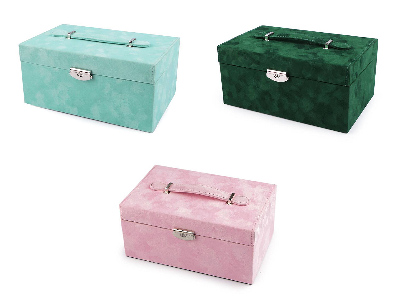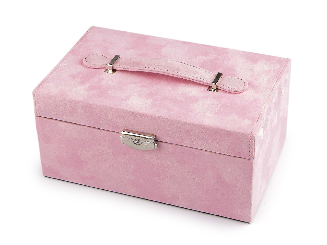 Uzamykateľná šperkovnica so zrkadielkom má semišový povrch. Kovové, mechanické zapínanie spoľahlivo ochráni šperky pred svetlom alebo vlhkosťou. Vďaka uchu ju môžete pohodlne prenášať. Vnútri je šperkovnica veľmi zaujímavá. Horné poschodie môžete odňať a samostatne ho zavrieť do malej cestovnej krabičky . Je v ňom 1 priehradka, 1 oddiel na prstene a 1 veľká priehradka s vreckom a háčikmi. Dolné poschodie má 1 veľkú priehradku. Vo veku je oválne zrkadlo. Šperkovnica má veľmi kvalitné a precízne prevedenie.