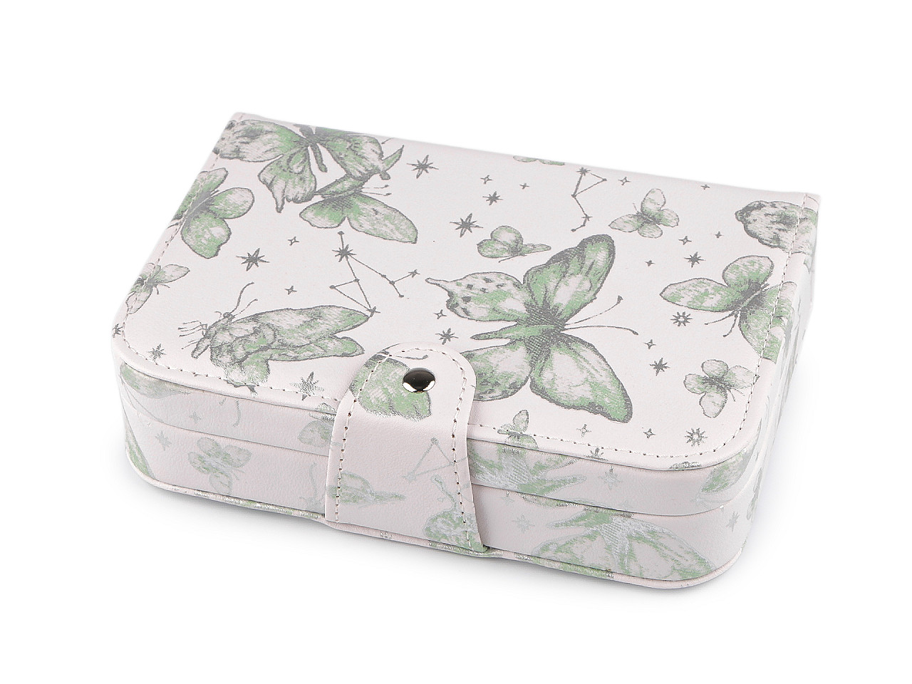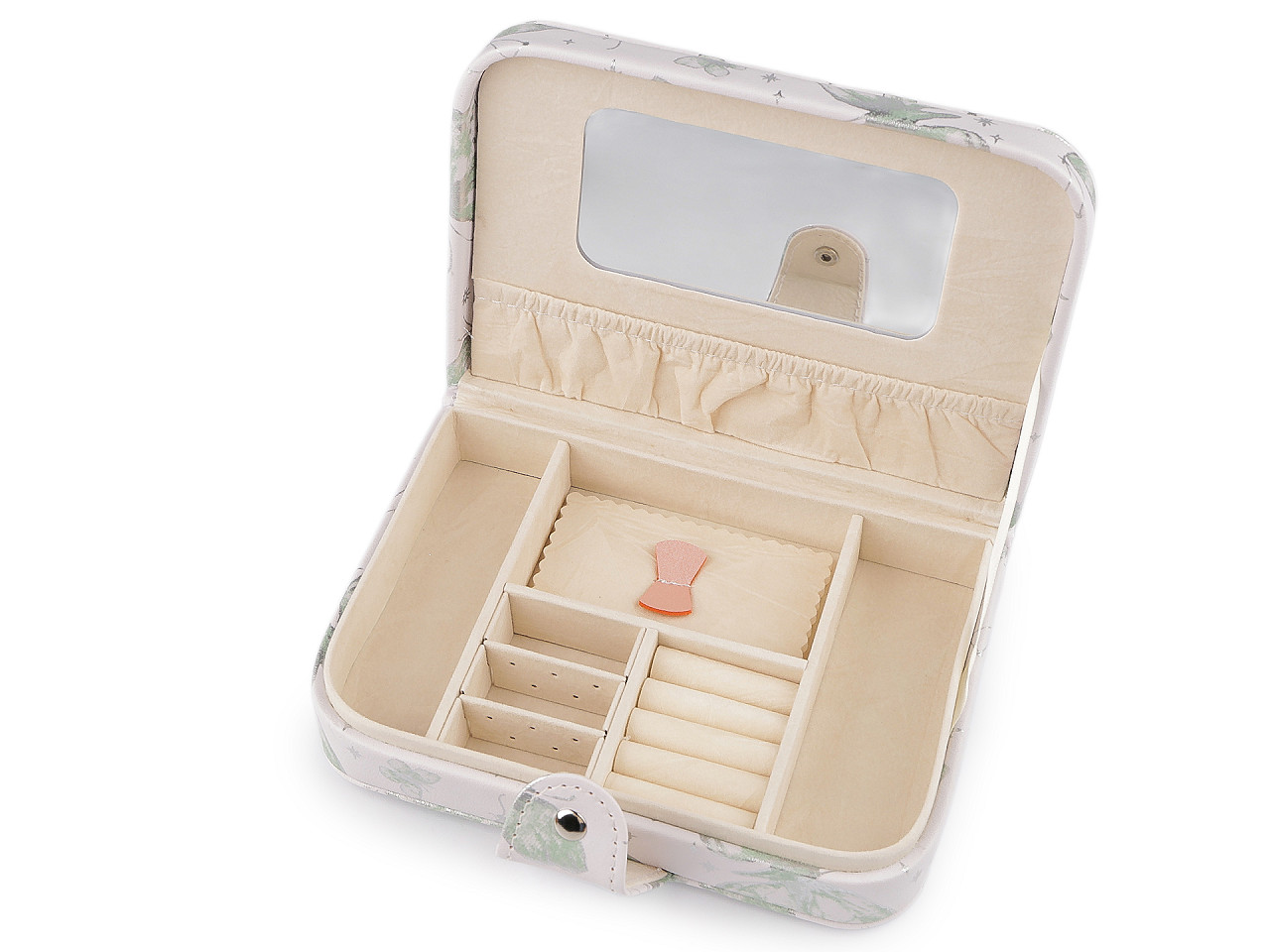 Šperkovnica so zrkadielkom je vyrobená z kvalitnej eko kože. Zo všetkých strán má potlač s motýľmi s metalickými odleskami . Zapína sa na pracku s patentom. Je prispôsobená na postavenie na výšku do knižnice. Spoľahlivo ochráni šperky pred nepriaznivými vplyvmi okolia ako je svetlo alebo vlhkosť. Vnútri šperkovnice sú 3 priehradky, vankúšik na brošne, oddiel na prstene, prepážky na puzetové náušnice, vrecko a zrkadlo . Šperkovnica má veľmi kvalitné a precízne prevedenie.