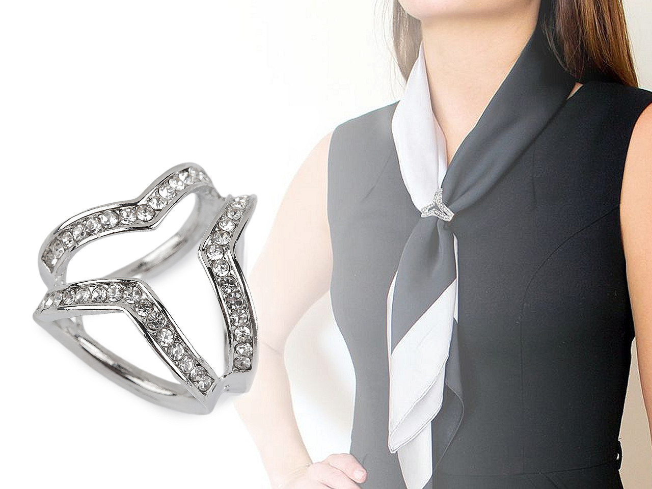 Ozdobnú sponu na šatku zdobia brúsené kamienky, ktoré jej dodávajú eleganciu. Najlepšie vynikne v kombinácii s jemnou šatkou.
