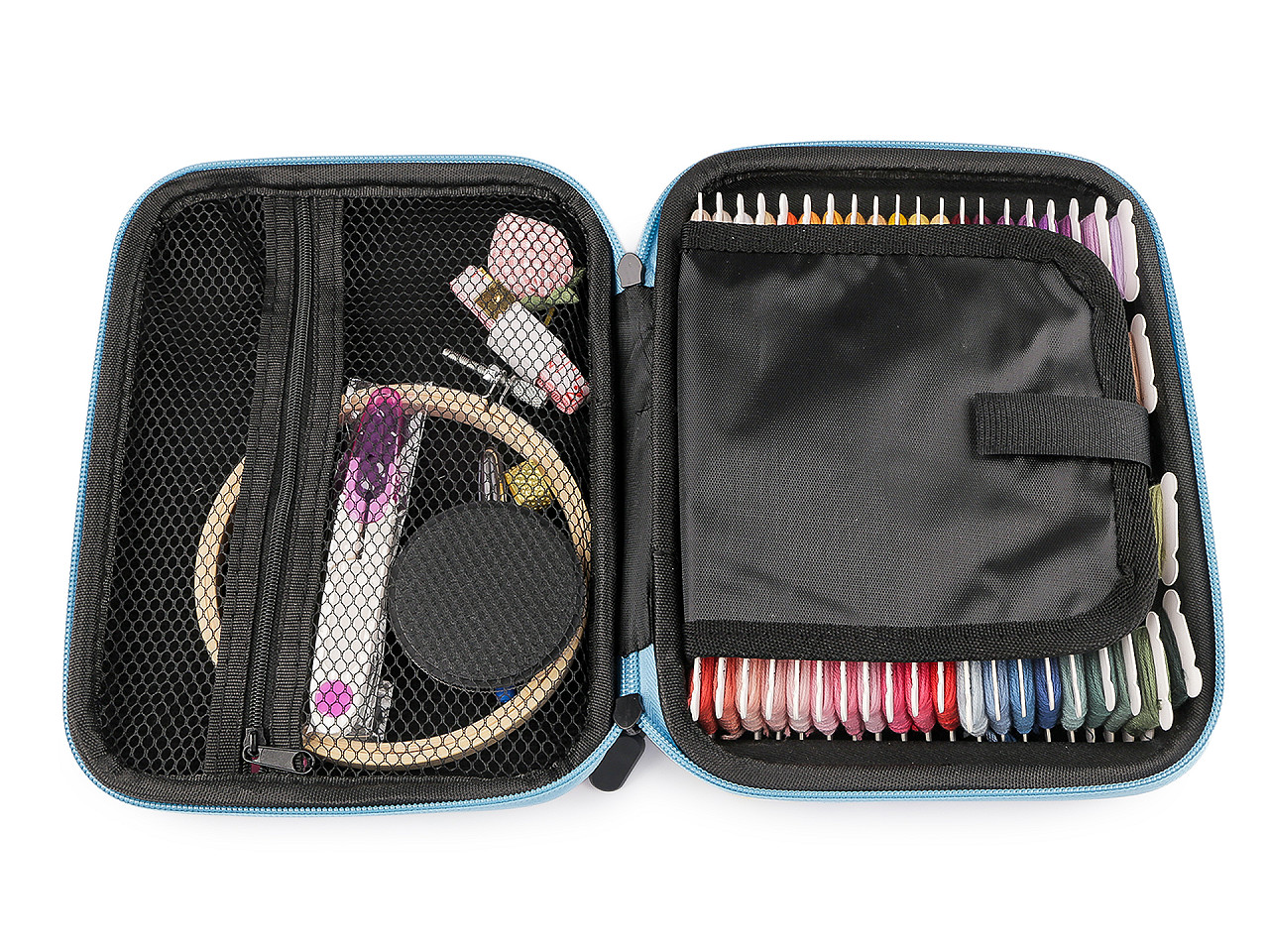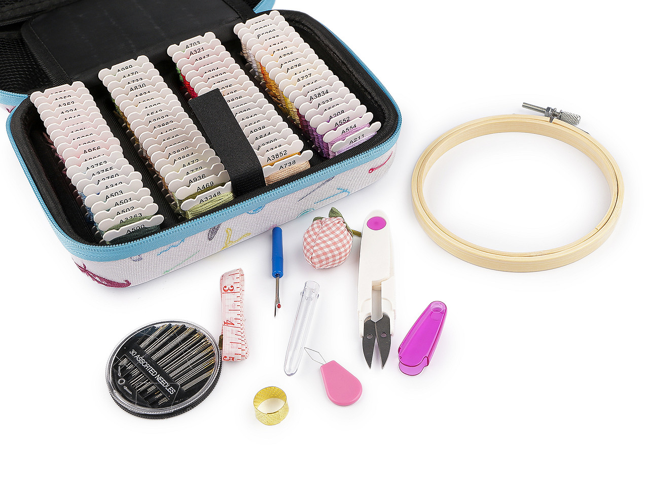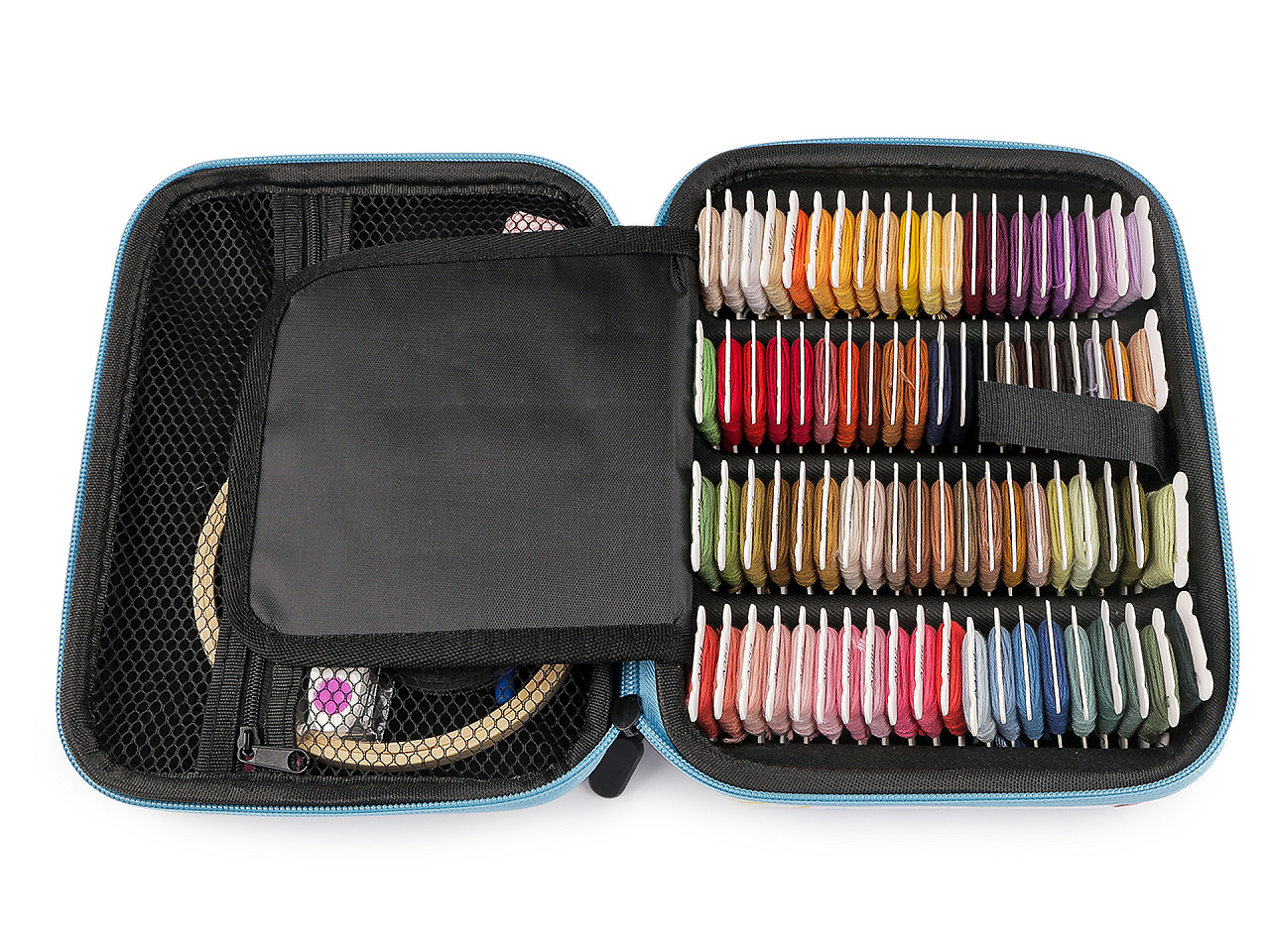 Súprava na vyšívanie poteší všetkých milovníkov tejto techniky. Vnútri nájdete širokú škálu farebných priadzí typu Mouliné (80 ks), kompaktné balenie ihiel v plastovej krabičke, páradlo, navliekač priadzí, kovový náprstok, malý ihelníček, nožnice cvakačky, obojstranný krajčírsky meter - cm, inch (150 cm) a bambusový vyšívací kruh priemer 12 cm. Všetko je úhľadne a prakticky zabalené v pevnom kufríku s uškom na pohodlné prenášanie.