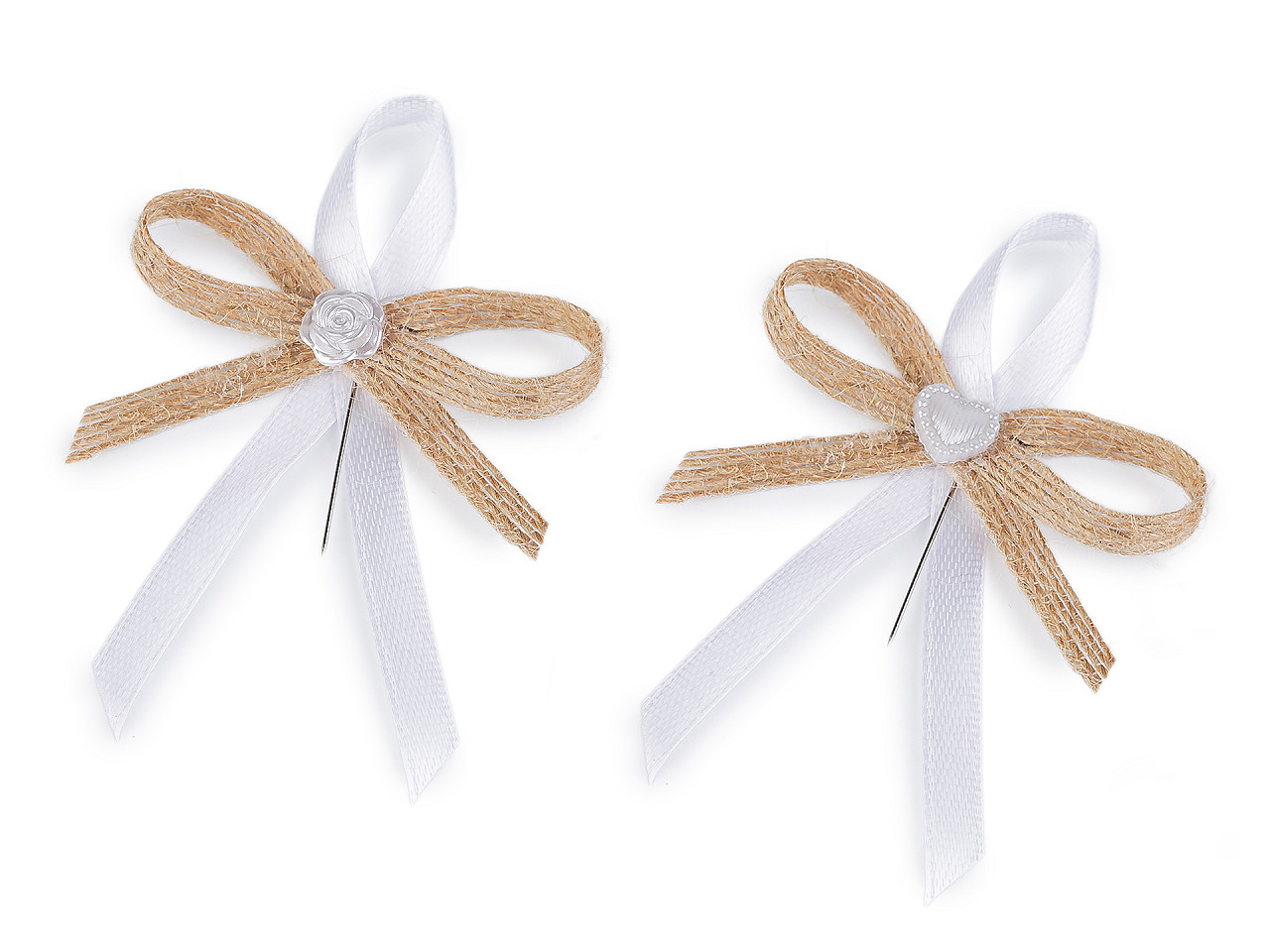 Svadobné jutové mašličky v boho štýle sú veľmi populárne. Slúžia predovšetkým na ozdobenie klopy ženícha a svadobčanov. Sú kvalitné, ručne spracované . Skladajú sa z jutovej mašle, saténovej stuhy, drobnej aplikácie s perlovým leskom a špendlíka. Mašličky môžete použiť aj na aranžovanie rôznych svadobných dekorácií. Mašličky sú zabalené po 10 ks v sáčku s papierovou kartou na zavesenie na predajný stojan. Variant č. 1 je s ružičkou. Variant č. 2 je so srdiečkom.