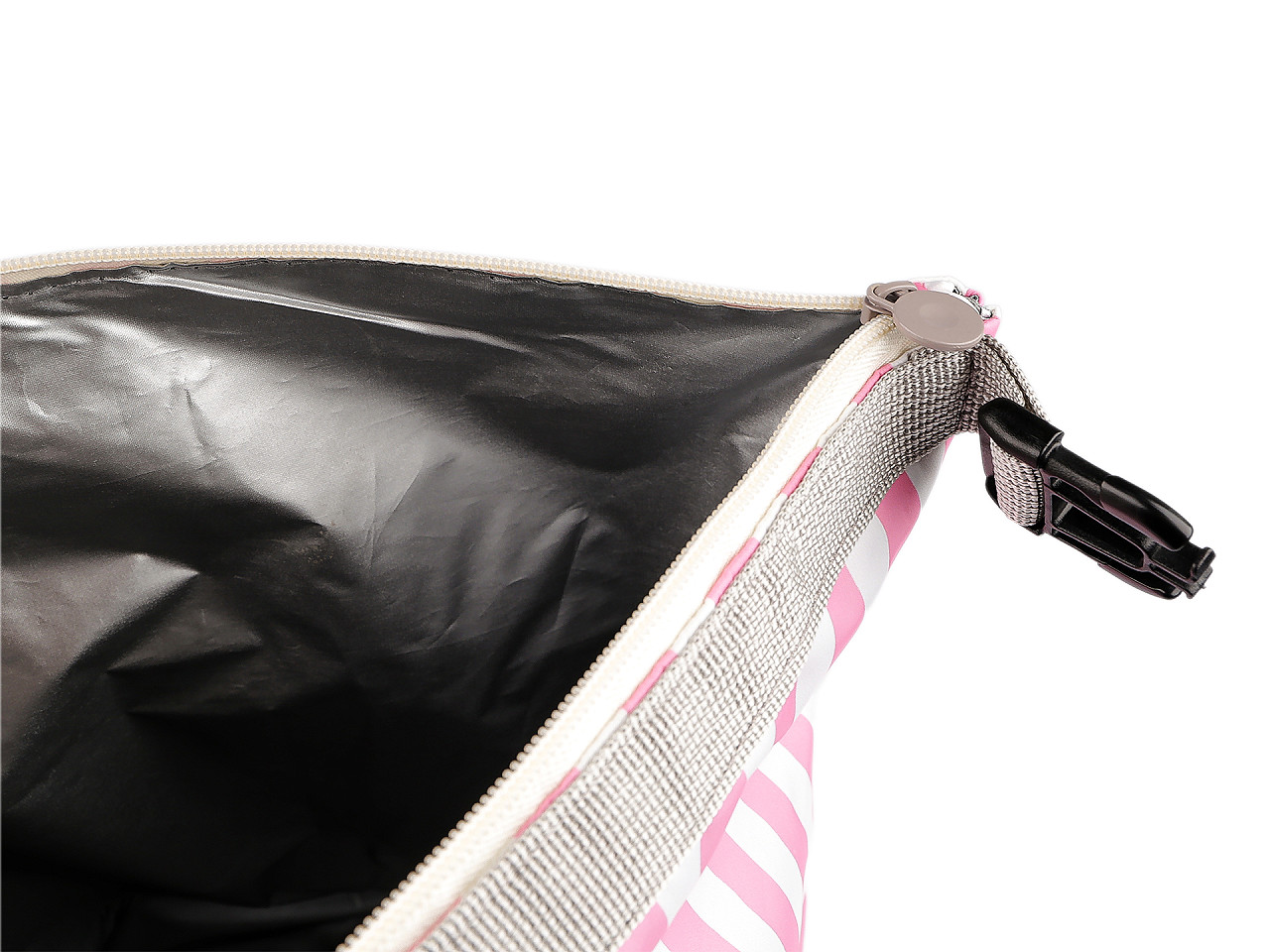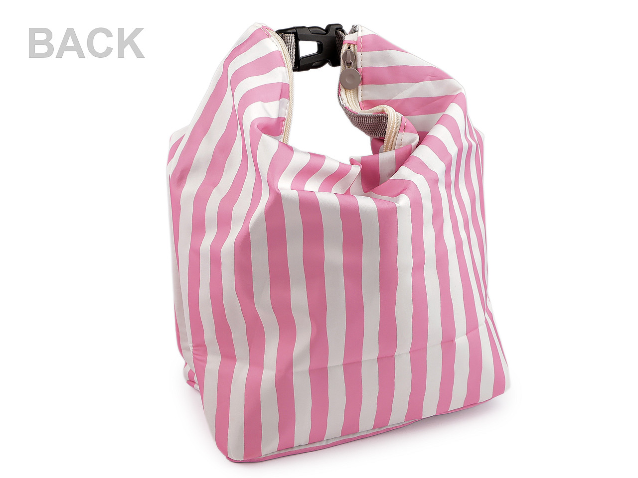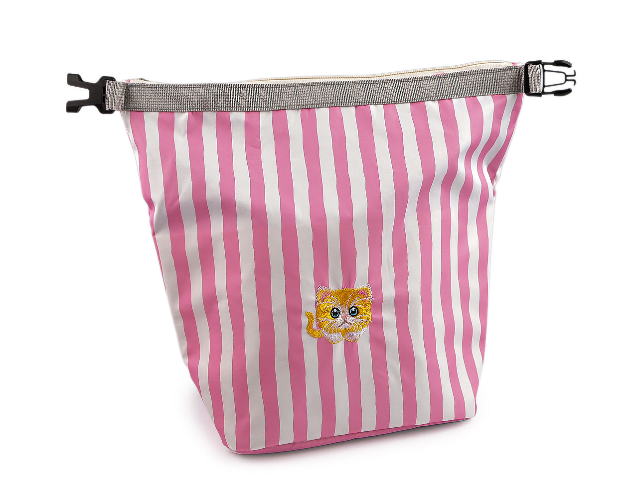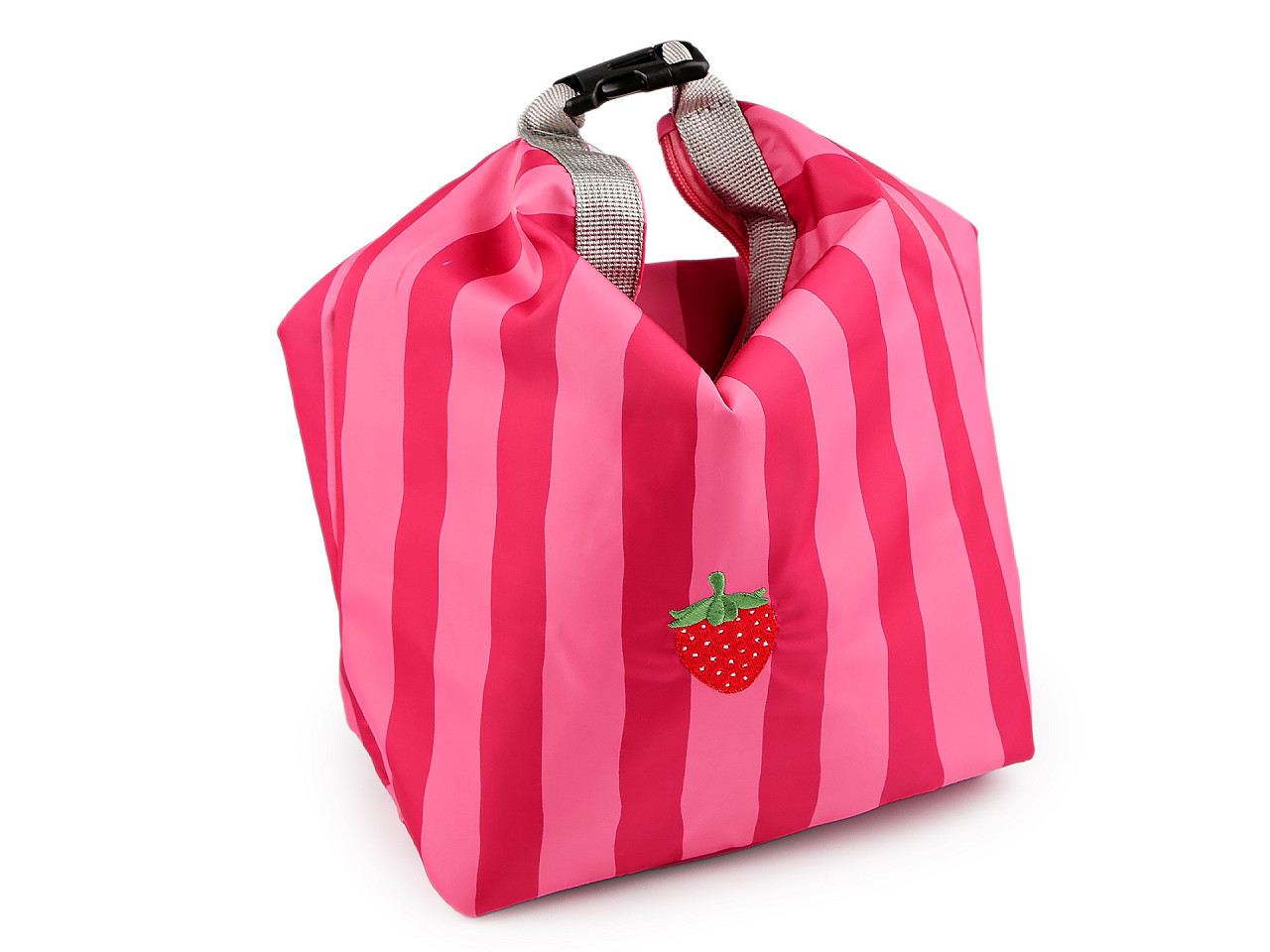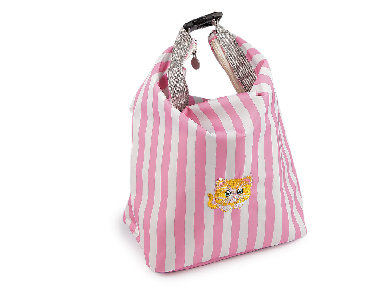 Pruhovaná termotaška strednej veľkosti je na prednej strane ozdobená kvalitnou výšivkou obrázka . Je dostatočne priestranná, jej prednosťou je, že uchová potraviny po určitú dobu pri rovnakej teplote. V hlavnom úložnom priestore je izolačná vrstva , ktorá je umývateľná. Vďaka širokému dnu perfektne stojí . Zapína sa na zips, hore sa dá zopnúť karabínou , čím sa jej objem trochu zmenší a vznikne ucho do ruky.