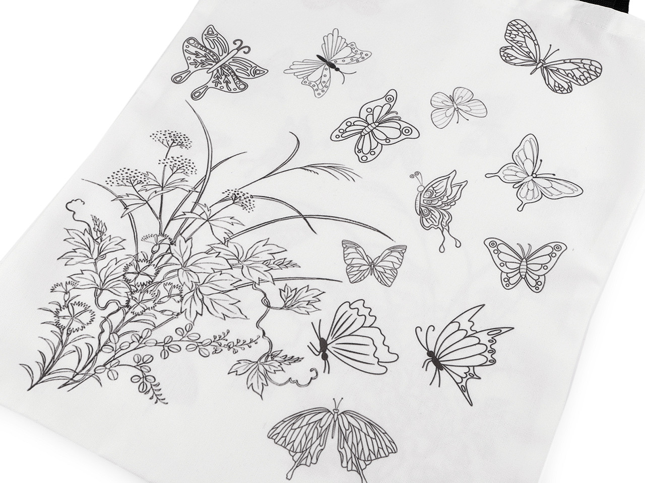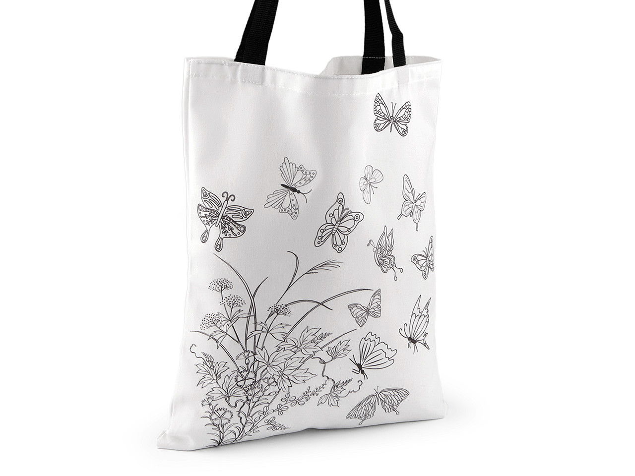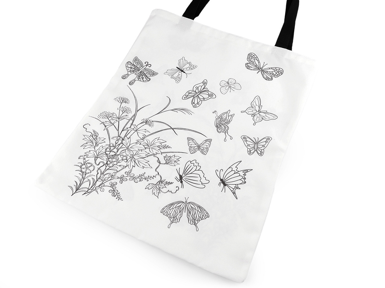 Textilná taška má z oboch strán potlač s obrázkom kvetov a motýľov . Je veľmi kvalitná, pevná , hodí sa na bežné nosenie aj nákupy. Má dlhé uchá z pevných popruhov, dajú sa nosiť v ruke aj cez rameno. Môžete si ju domaľovať najlepšie farbami alebo popisovačmi na textil. Tašku tak môžete doslova nechať rozkvitnúť pod vašimi rukami.