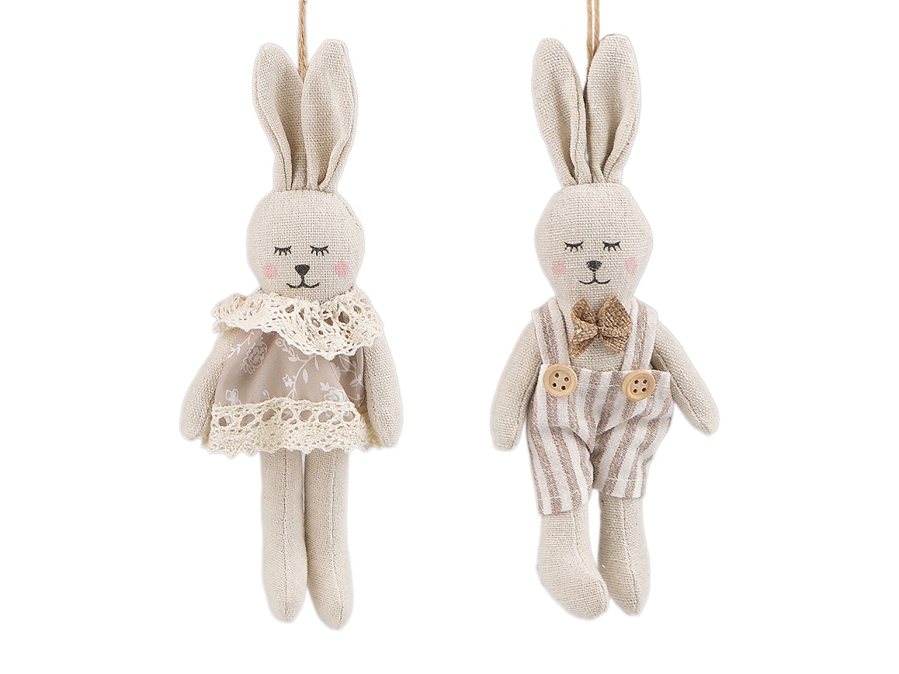 Textilní veľkonoční zajačikovia vo vintage štýle očaria svojou jednoduchosťou. Majú rozkošné detaily, ako sú vyšívané oči, nežné čipkové doplnky či drevené gombíky. Vďaka pútku ich môžete ľahko kamkoľvek zavesiť. Hodia sa aj na výrobu veľkonočných vencov. Vnesú do domova radosť a veselú náladu.
