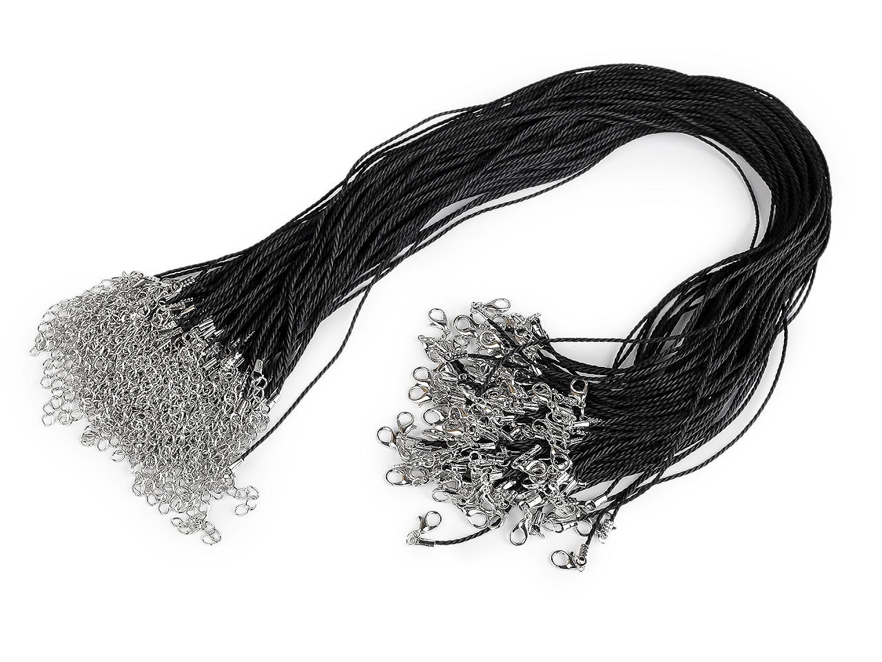 Módna šnúrka k zaveseniu príveskov. Dĺžka 45cm+5cm adjustačná retiazka. Karabinka 5x10mm. Šnúra Ø1 mm. V prípade, že prívesok nebude možno vďaka koncovke navliecť, tak je možné kliešťami pružinovú koncovku roztvoriť, navliecť prívesok a opäť koncovku uzatvoriť.