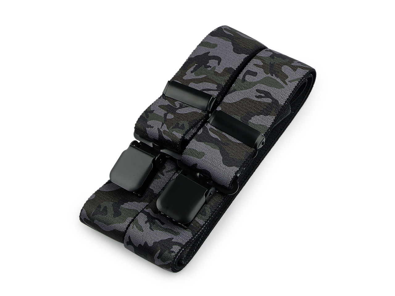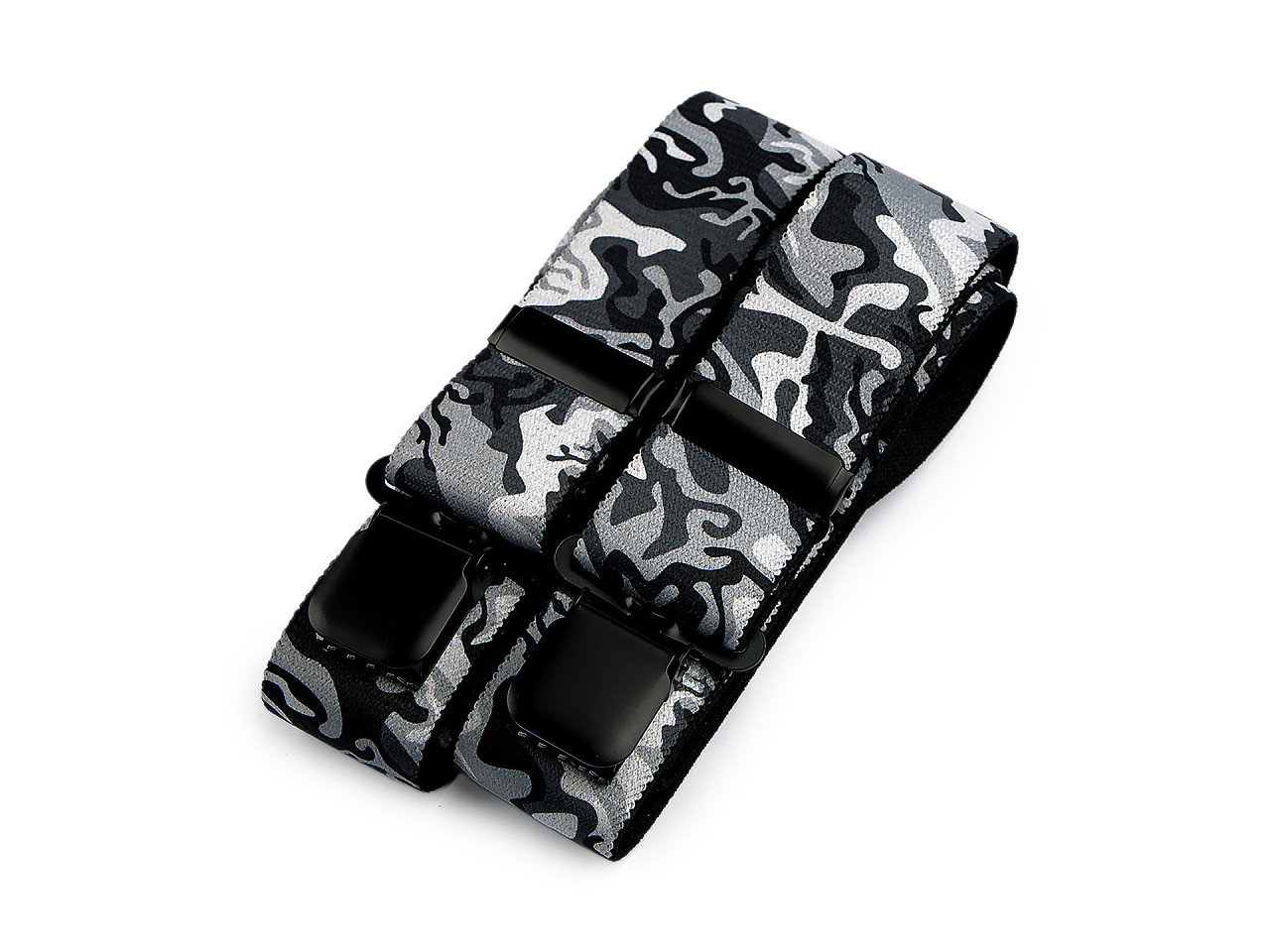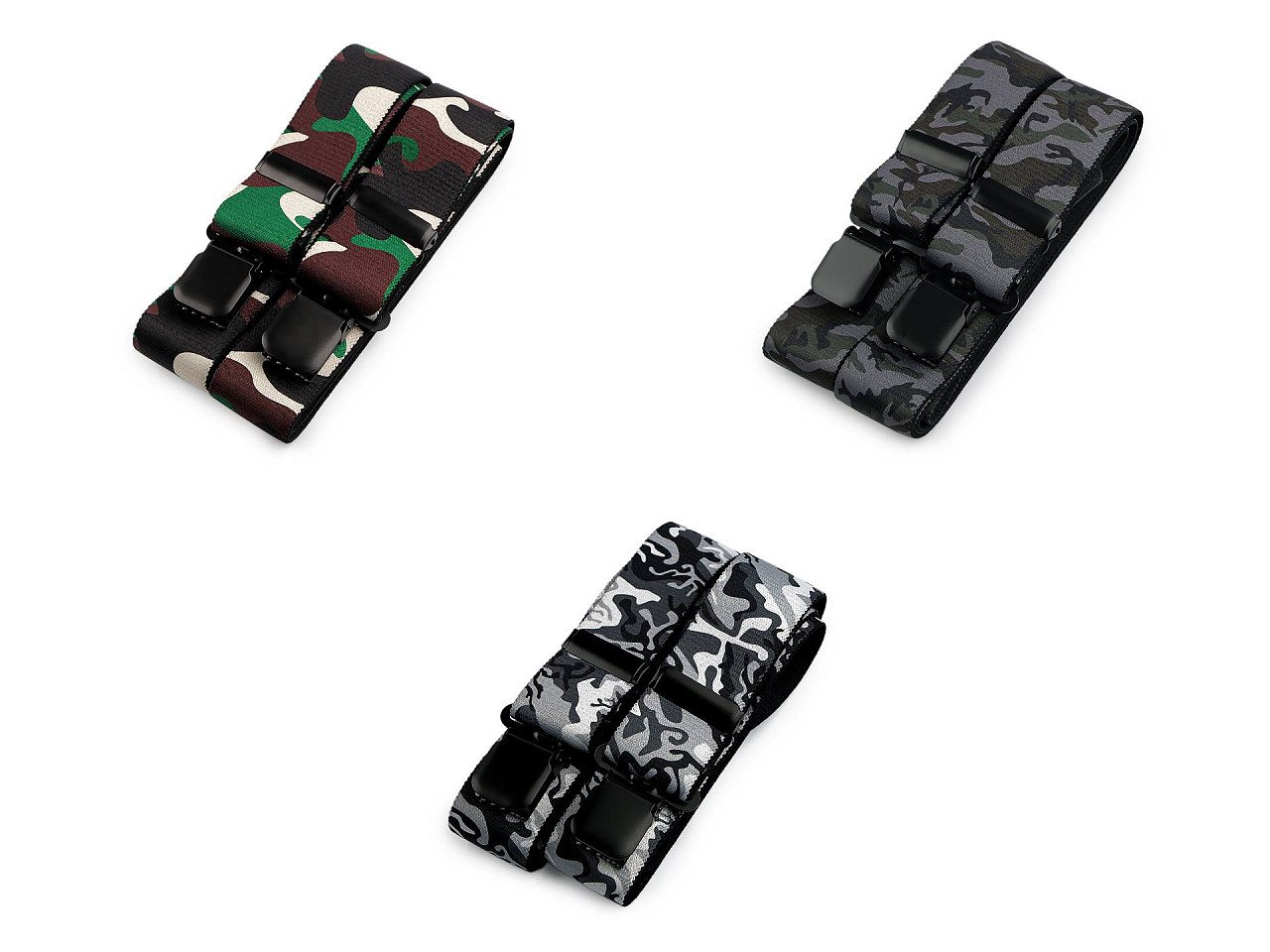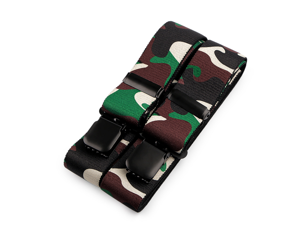 Traky s maskáčovou potlačou potešia mužov, ktorí chcú pridať do svojho šatníka nádych originality. Môžu ich bez obáv kombinovať s ležérnym aj športovejším oblečením a využiť ich ako na výletoch do prírody, tak pri uvoľnených stretnutiach s priateľmi. Sú kvalitnej českej výroby , elastický materiál umožňuje pohodlné nosenie . Zadná vsadka z eko kože im dodáva štýlový vzhľad. K nohaviciam sa upevňujú na tri žabky - dve vpredu a jednu vzadu.