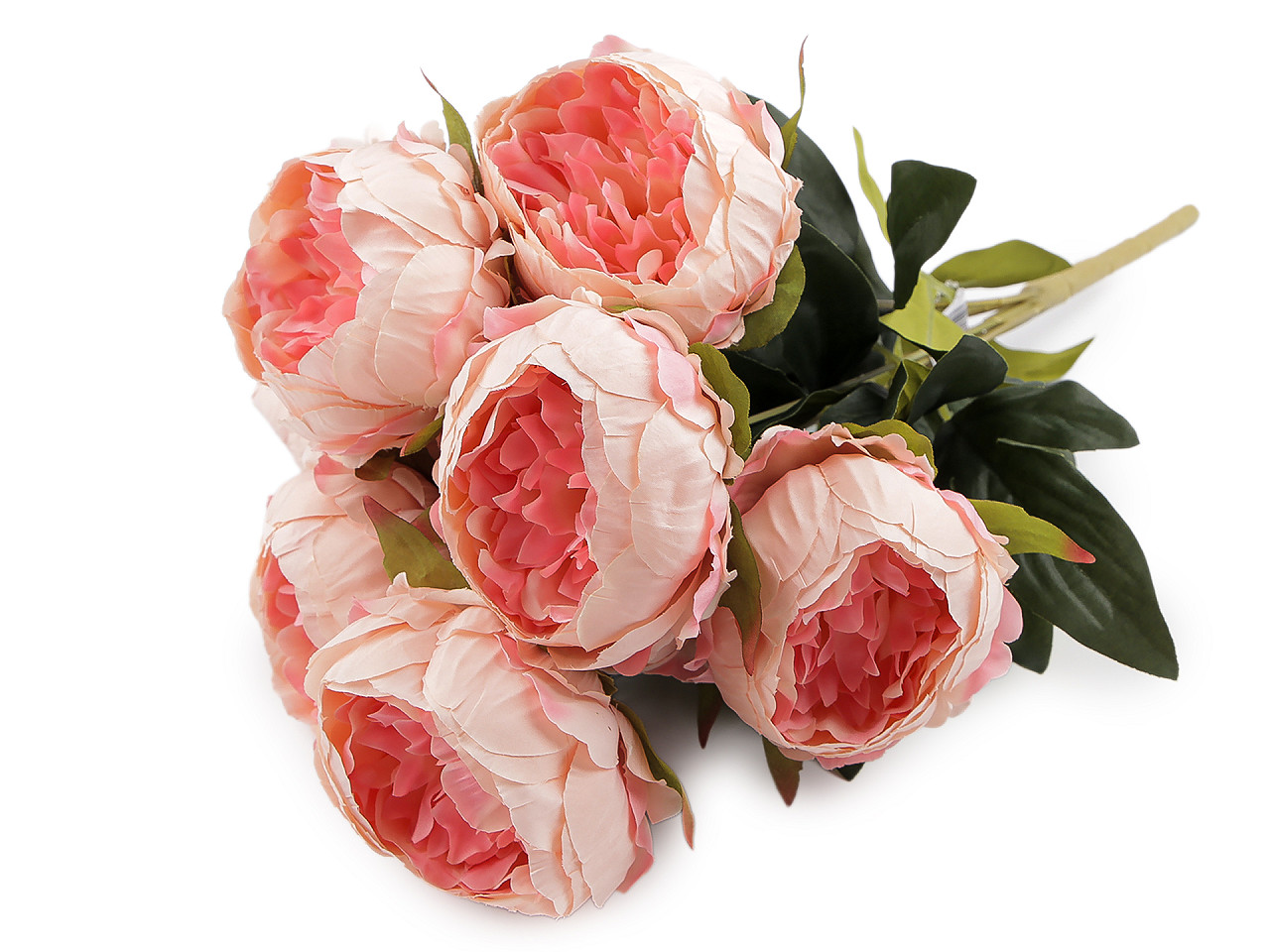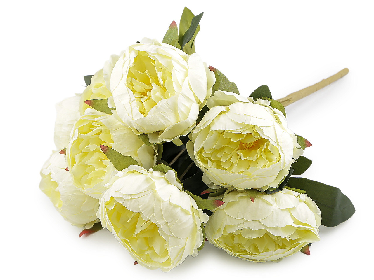 Veľká kytica umelých pivoniek vyzerá ako živá. Kvety a lístky sú textilné. V jednom zväzku je 9 kvetov, ktoré sú na ohybnom drôtiku.
