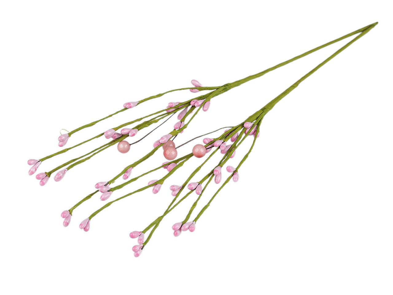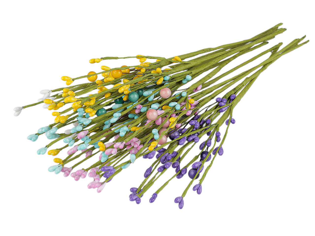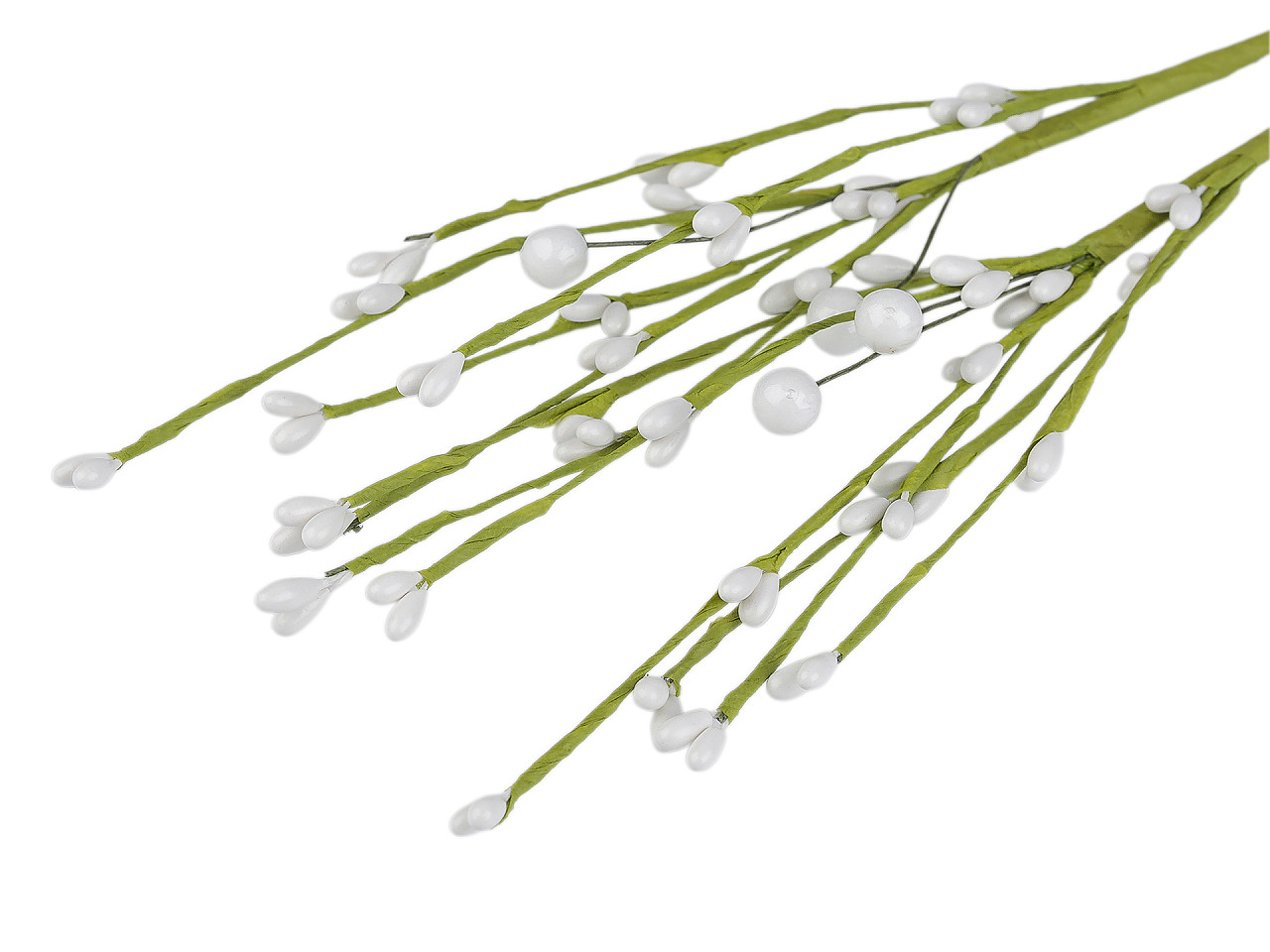 Dekoračná vetvička s púčikmi je vyrobená z drôtika, ktorý je omotaný floristickou páskou, dá sa ľahko ohýbať a tvarovať. Vetvička dodá sviežosť kvetinovým väzbám, dekoračným vencom a aranžmánom. Využijete ju aj na výrobu čeleniek do vlasov. Jednotlivé stonky môžete odstrihnúť a použiť zvlášť.
