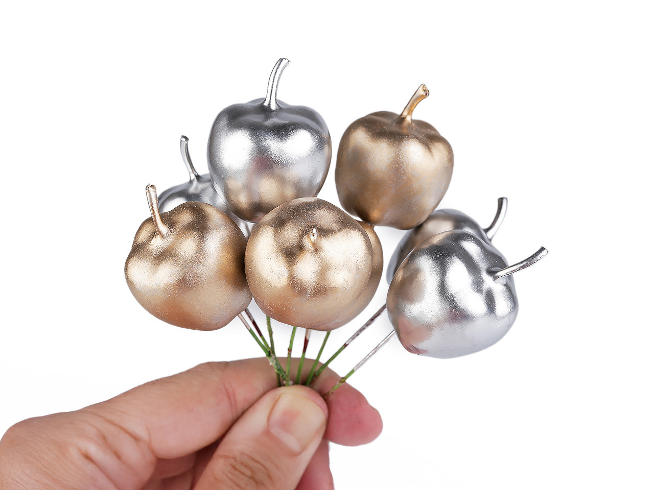 Dekoračné jabĺčka pôsobia vďaka svojmu metalickému zafarbeniu slávnostne. Sú pripevnené na drôtiku, ktorý sa dá dobre tvarovať. Ľahko sa zapichujú do polystyrénových polotovarov, vencov, dekoračných väzieb, kvetináčov a pod.