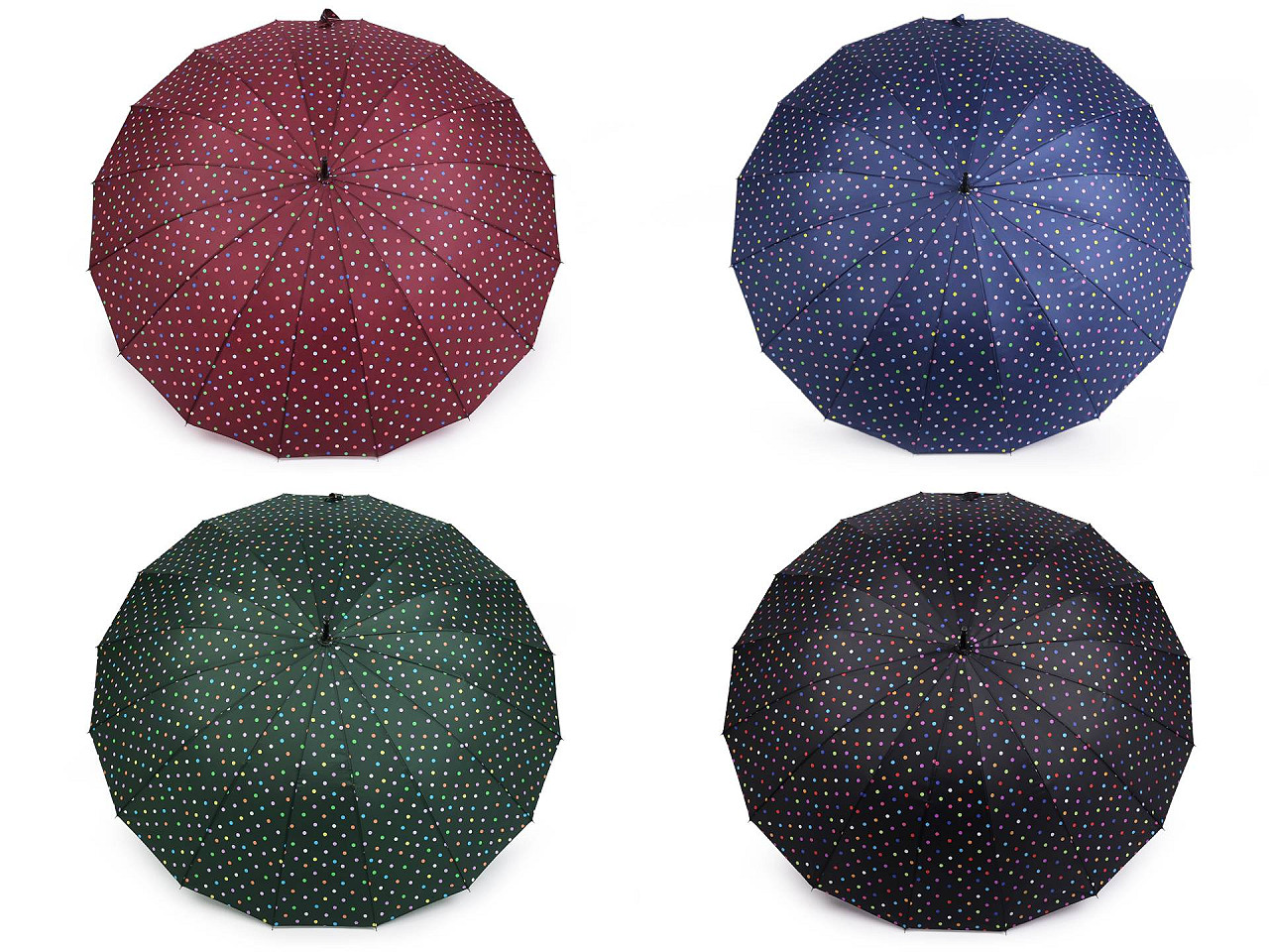 Veľký vystreľovací dáždnik s bodkami vás spoľahlivo ochráni pred nepriazňou počasia. Skladá sa zo 16 polí. Vďaka jeho veľkému priemeru 117 cm je vhodný ako dáždnik pre dvoch (rodinný dáždnik).