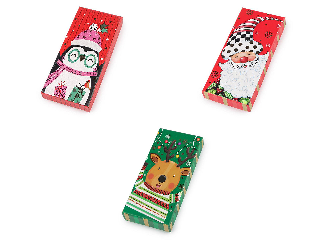 Vianočná krabička sa skvele hodí na zabalenie malého plochého vianočného darčeka. Má ideálne rozmery na darovanie bankoviek . Je klasická, otváracia s vekom, je veľmi kvalitná, vyniká svojou pevnosťou . Veko zdobí farebná potlač . Vnútri má papierovú kartičku, na ktorú môžete napísať venovanie . Dva šikmo umiestnené výrezy môžete využiť na lepšie pripevnenie vloženého predmetu. Krabička nemá atest na potraviny. Pochúťky a iné maškrty odporúčame vložiť zabalené v sáčku.