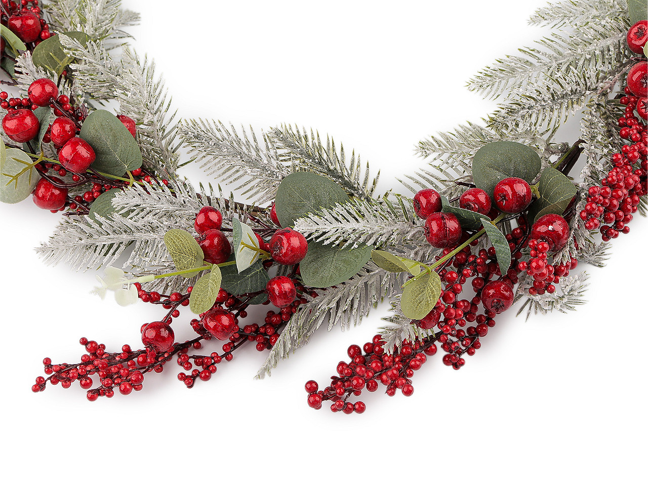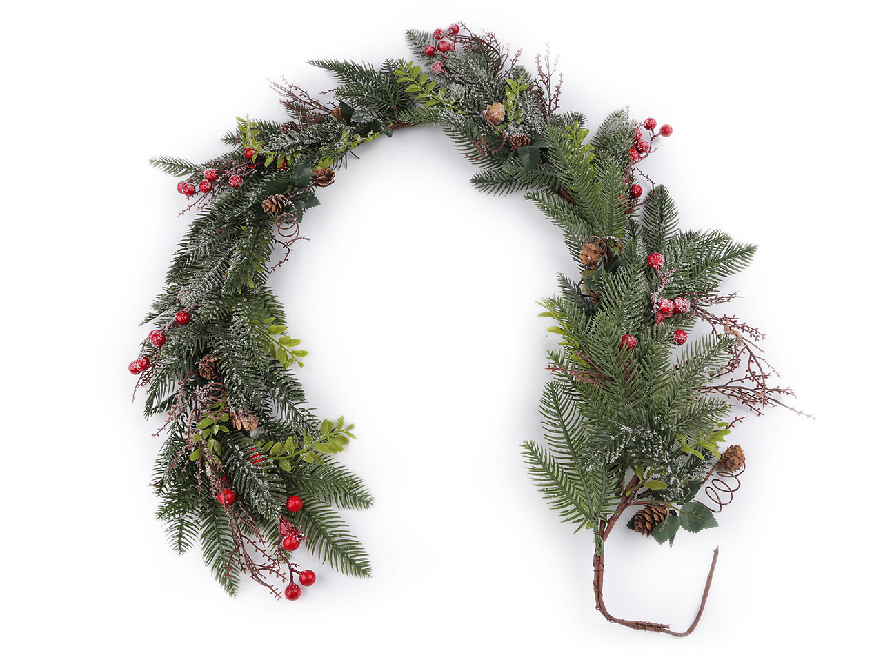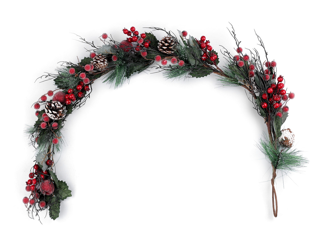 Dlhá vianočná girlanda je tvarovateľná a bohato ozdobená vetvičkami, bobuľami a jabĺčkami . Možno ju nechať v natiahnutom stave alebo ju stočiť do venca. Využijete ju na ozdobenie dverí, krbu, okien alebo stola, hlavne počas zimných sviatkov.