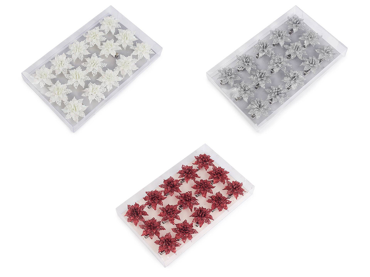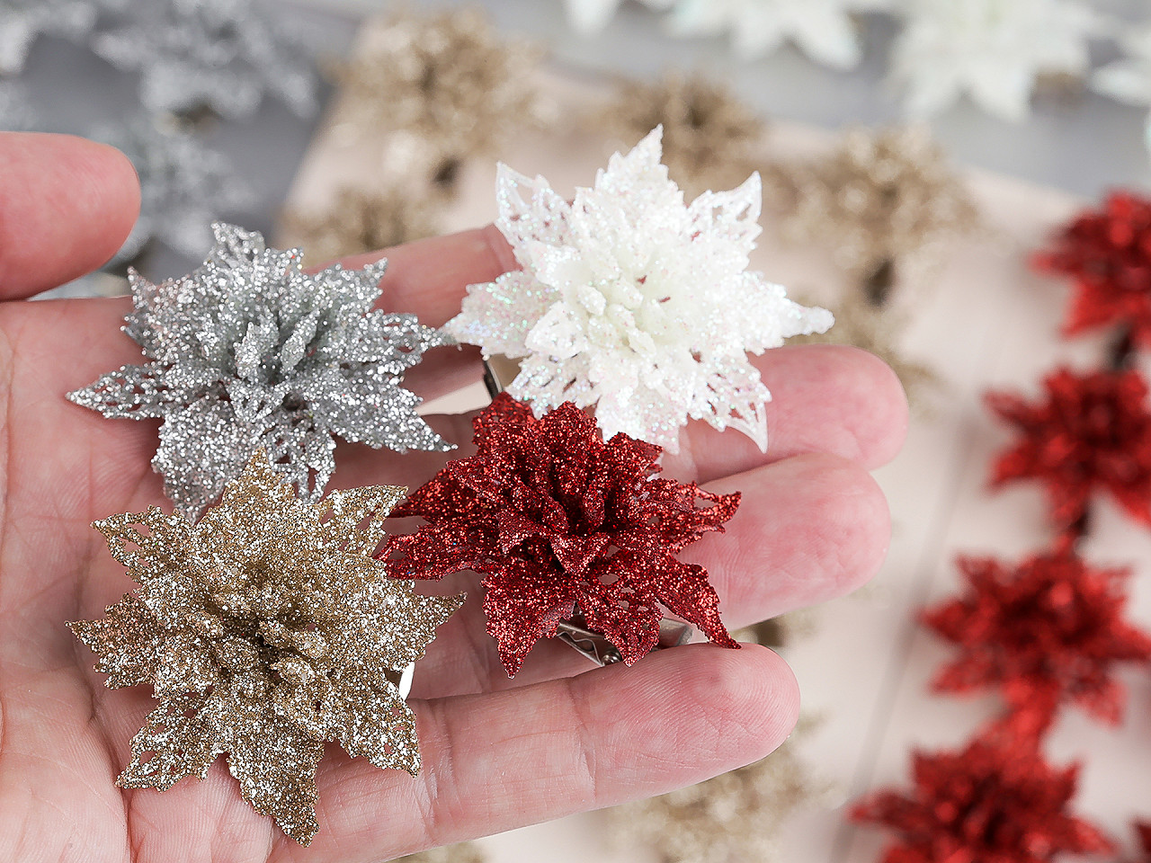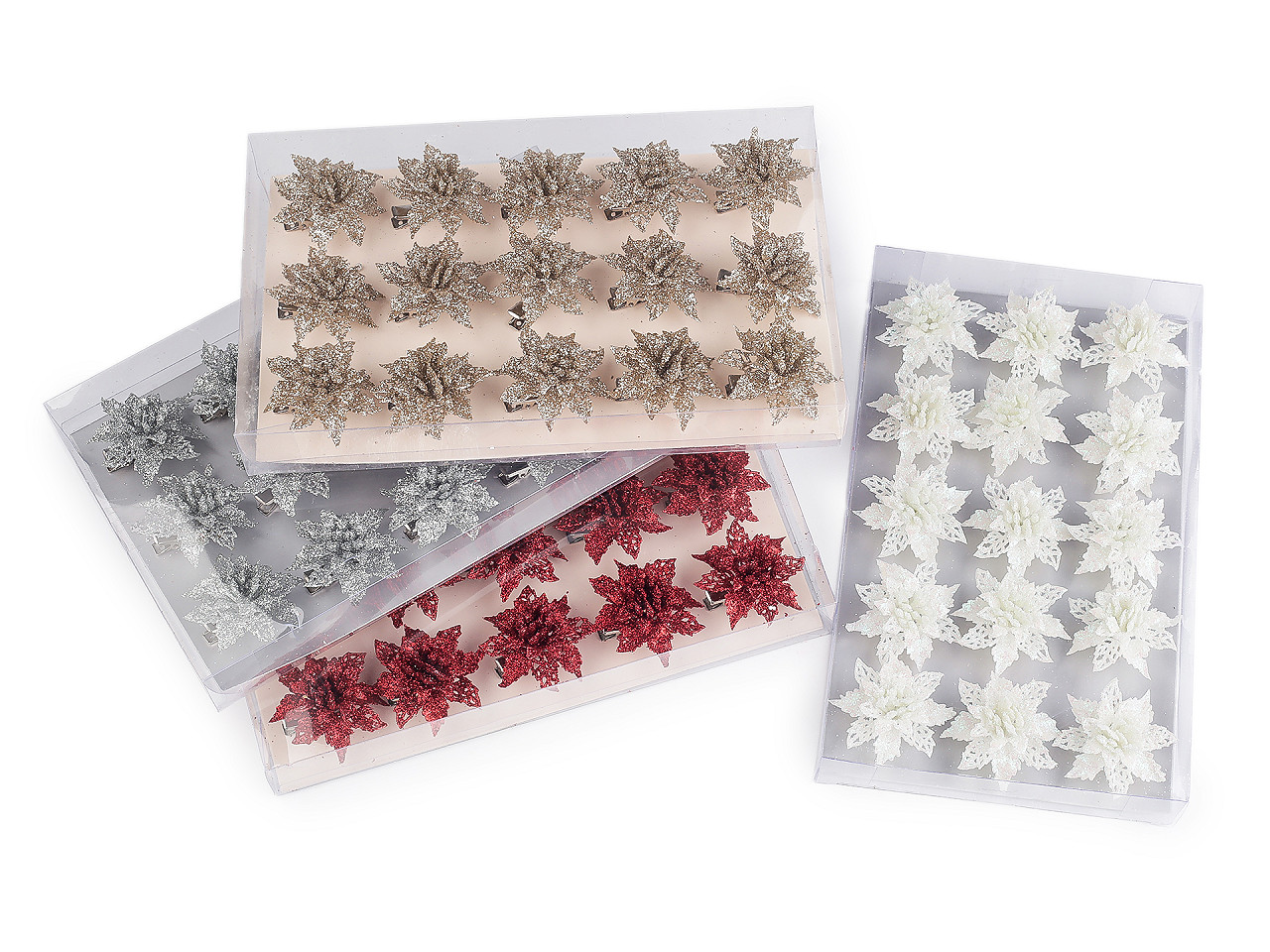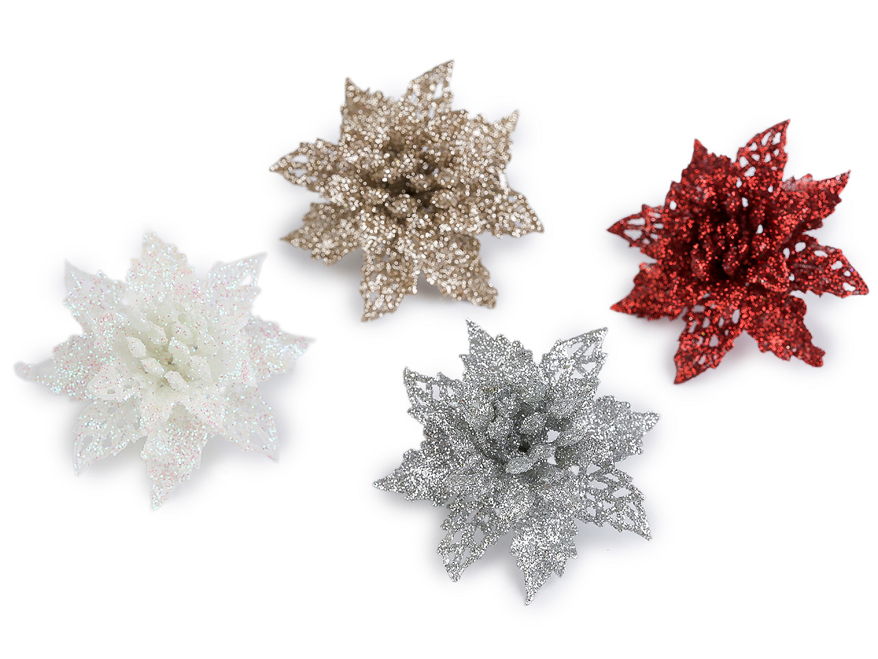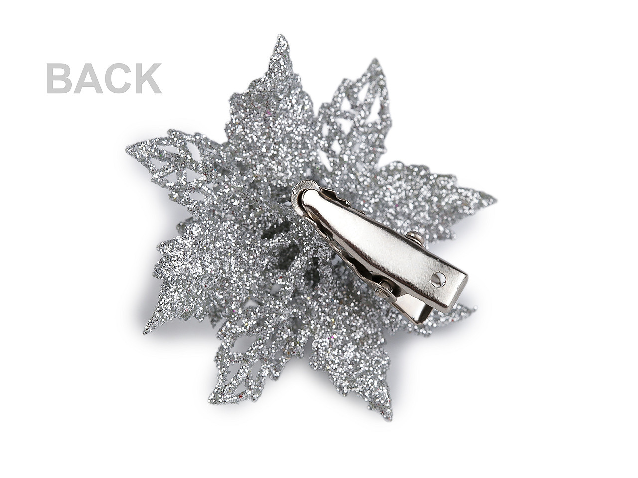 Vianočné hviezdy sú pútavým detailom sviatočnej výzdoby. Ich povrch s trblietavými glitrami dodá vášmu domovu nádych elegancie a luxusu. V dolnej časti je kovový klip, ktorý umožňuje jednoduché pripevnenie na vianočný stromček, vence, darčeky, svietniky a rôzne aranžmány.