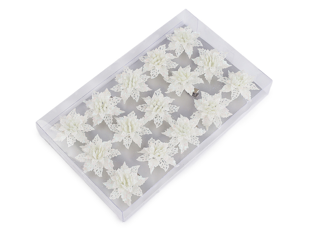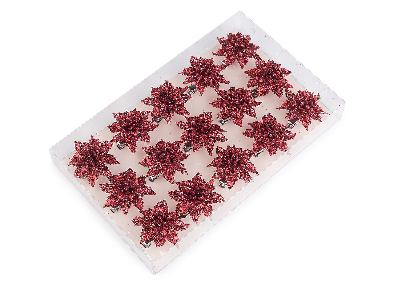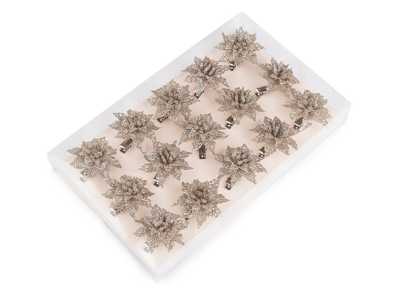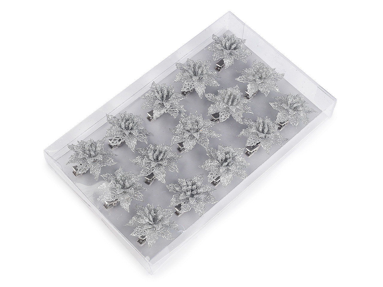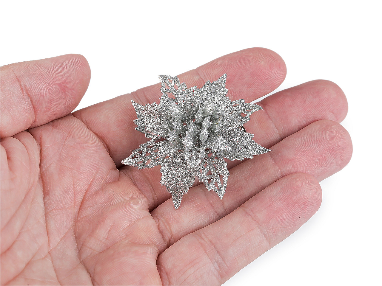 Vianočné hviezdy sú pútavým detailom sviatočnej výzdoby. Ich povrch s trblietavými glitrami dodá vášmu domovu nádych elegancie a luxusu. V dolnej časti je kovový klip, ktorý umožňuje jednoduché pripevnenie na vianočný stromček, vence, darčeky, svietniky a rôzne aranžmány.