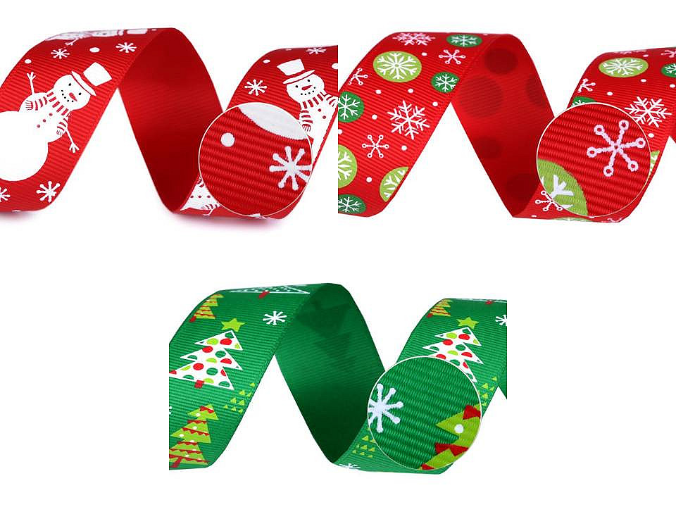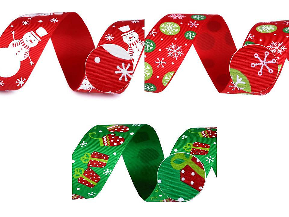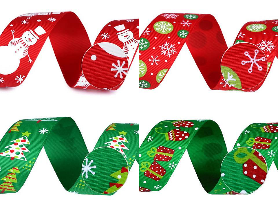Dekoračná rypsová stuha s vianočnými motívmi má na povrchu typické jemné rebrovanie. Potlač je jednostranná.