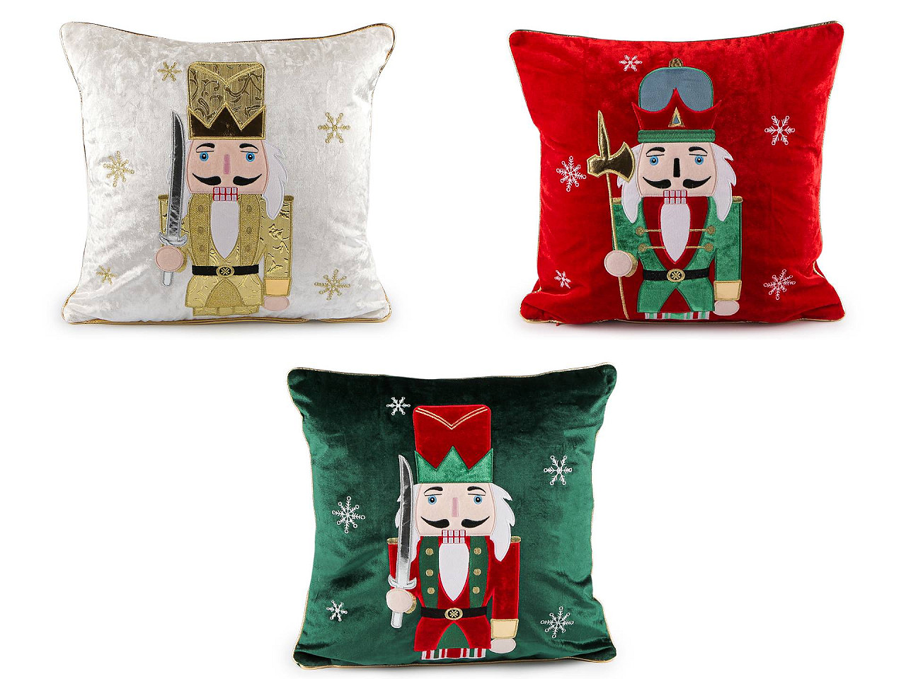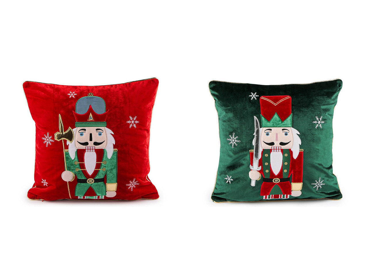 Zamatovú obliečku na vankúš zdobí vianočný motív luskáčika . Do interiéru vnesie tradičné vianočné kúzlo a prispeje k pohodovej atmosfére, jej jemný a hebký materiál je príjemný na dotyk. Obliečka je jednostranná, veľmi kvalitná , motív luskáčika tvorí pevne našitá aplikácia s výšivkou a metalickými detailami . Vločky sú vyšité. Okraj obliečky je olemovaný zlatou paspulkou . Zapína sa na zips. Toto je obliečka na vankúš, výplň môžete kúpiť zvlášť.