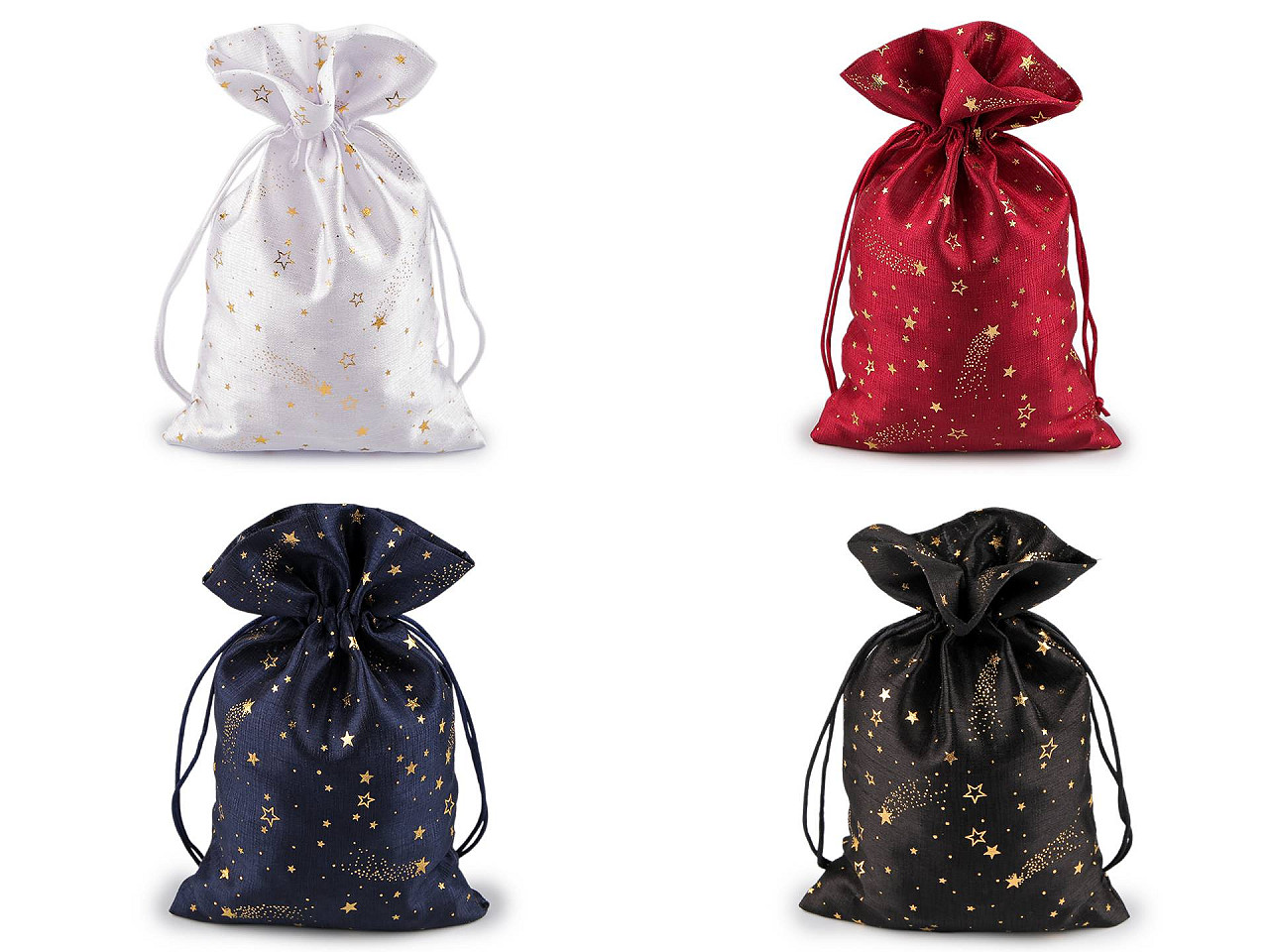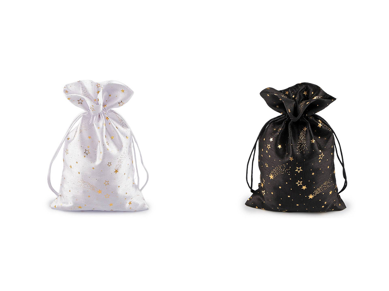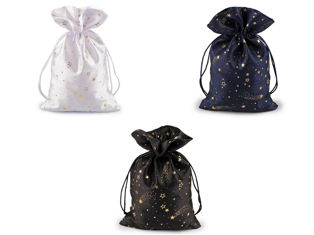 Vianočné darčekové vrecúško je stredne veľké, z oboch strán ozdobené potlačou zlatých metalických hviezdičiek . Pôsobí elegantne a luxusne, môžete ho použiť na darčeky alebo ho naplniť mikulášskou nádielkou, ušetrí vám čas pri balení. Dá sa naaranžovať aj ako vianočná dekorácia. Sťahuje sa pomocou okrúhlych saténových šnúriek, darčeku dodá osobné kúzlo a pôvab.