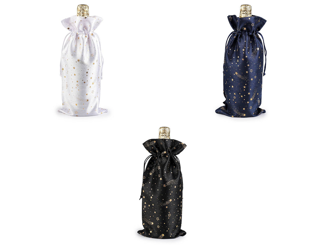 Vianočné darčekové vrecúško ozdobené zlatou metalickou potlačou hviezdičiek pôsobí elegantne a luxusne. Je určené na zabalenie fliaš a iných podlhovastých darčekov . Vrecko je dostatočne vysoké, či už sa rozhodnete pre darček s alkoholom alebo s domácou limonádou, ušetrí vám čas pri balení. Sťahuje sa pomocou okrúhlych saténových šnúriek, darčeku dodá osobné kúzlo a pôvab. Fľaša nie je súčasťou vrecúška.