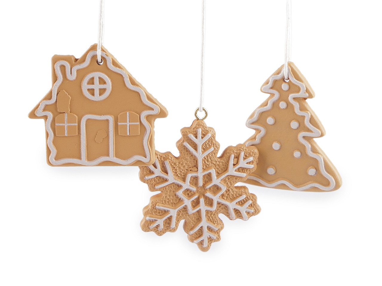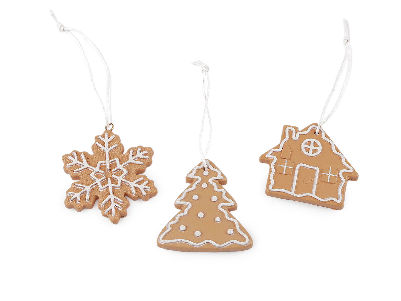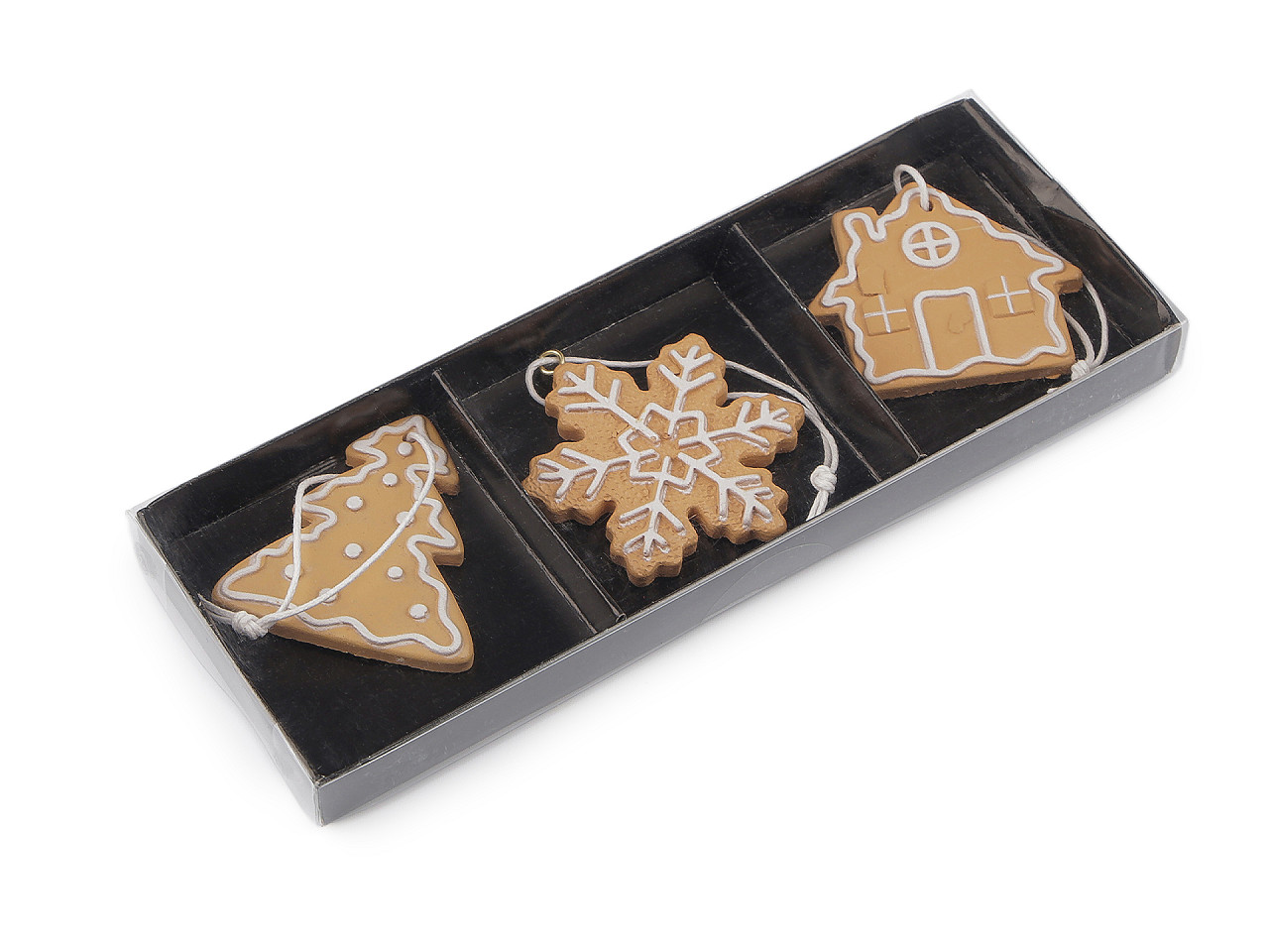 Dekoračné perníčky v tvare domčeka, stromčeka a vločky zdobí jemný biely dekor. Perníčky sú jednostranne zdobené a opatrené praktickým pútkom pre ľahké zavesenie na vianočný stromček, vence alebo iné miesta v domácnosti.