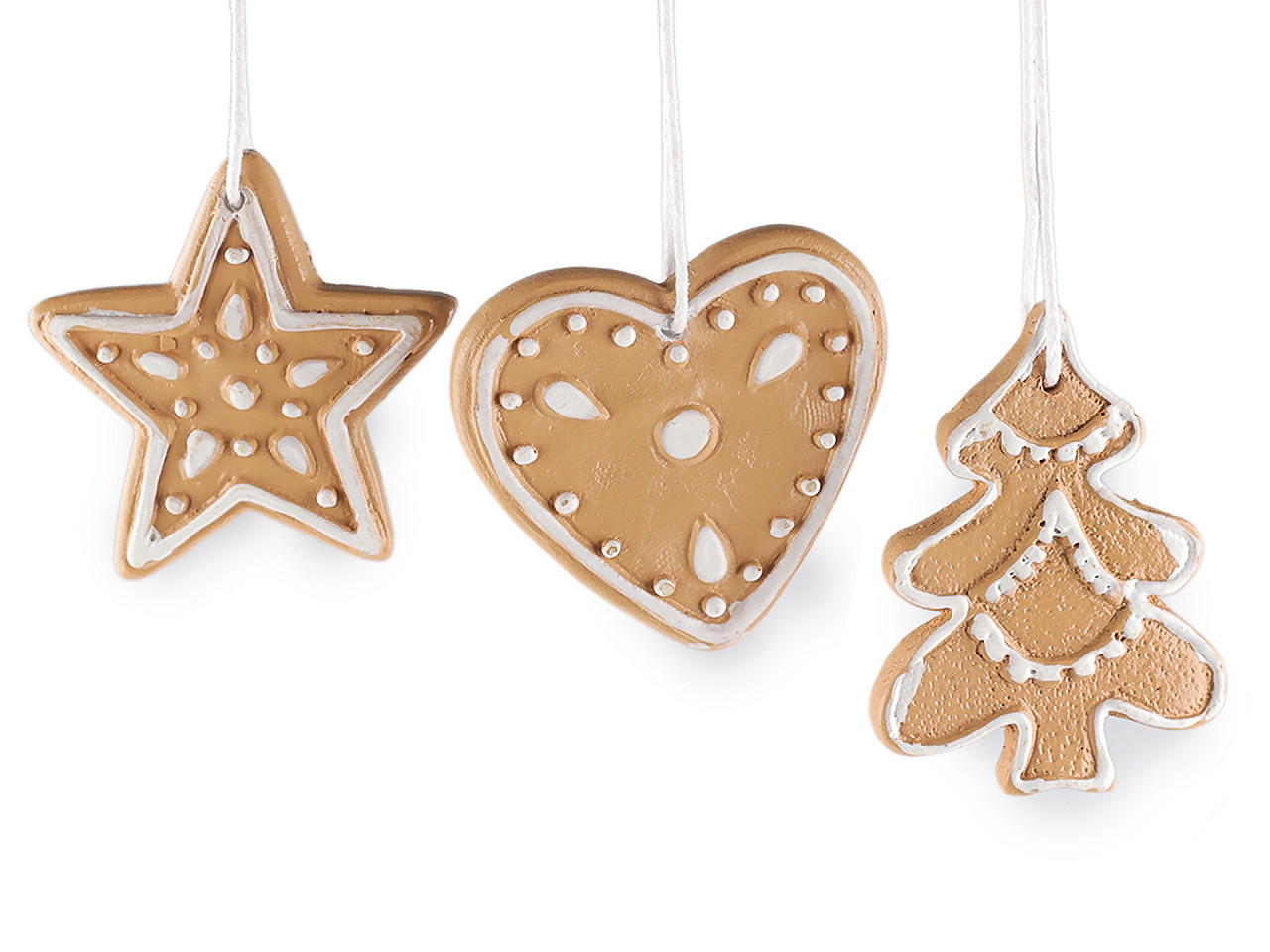 Dekoračné perníčky zdobí jemný biely dekor. Sú jednostranne zdobené a opatrené praktickým pútkom pre ľahké zavesenie na vianočný stromček, vence alebo iné miesta v domácnosti.