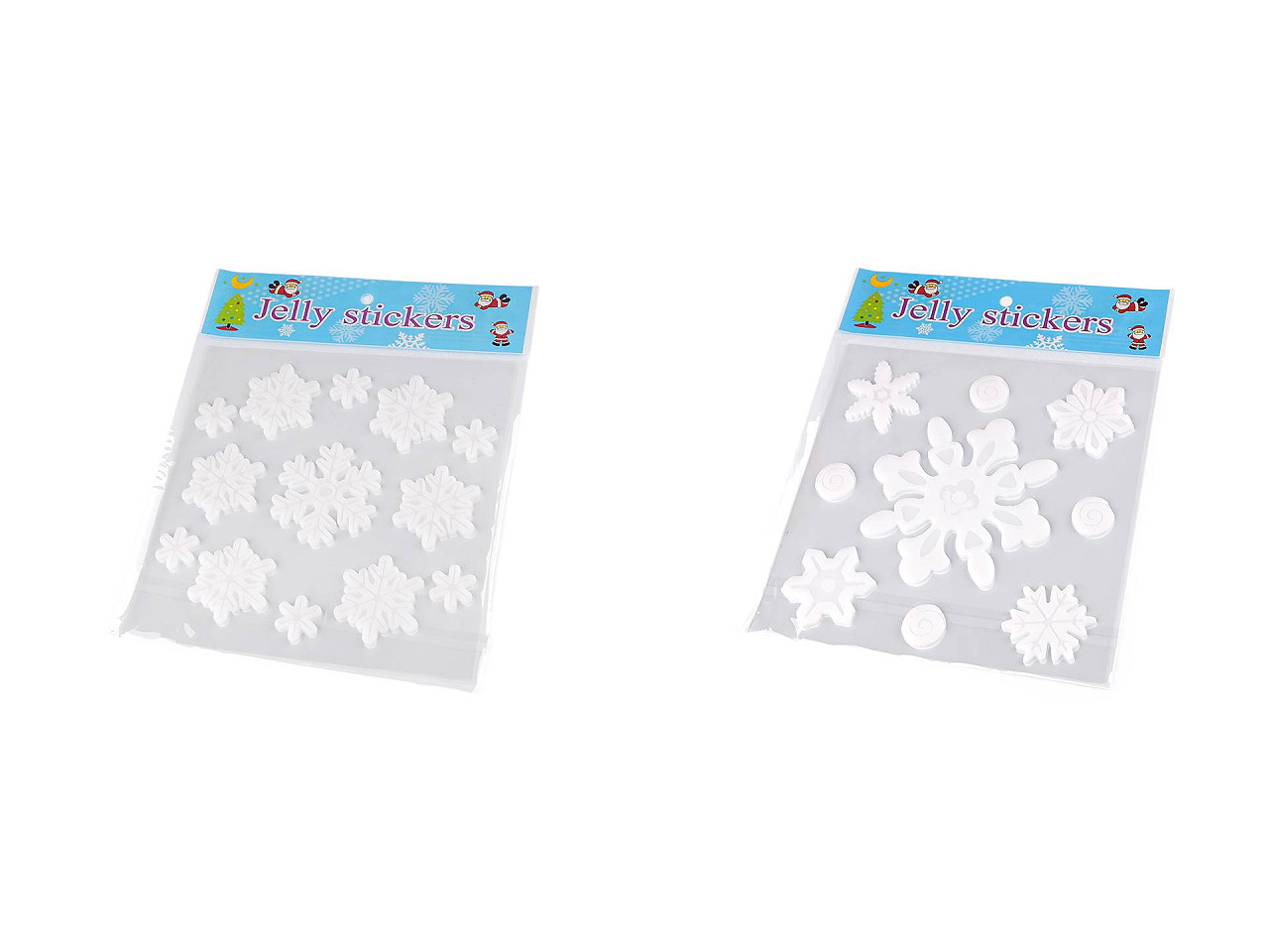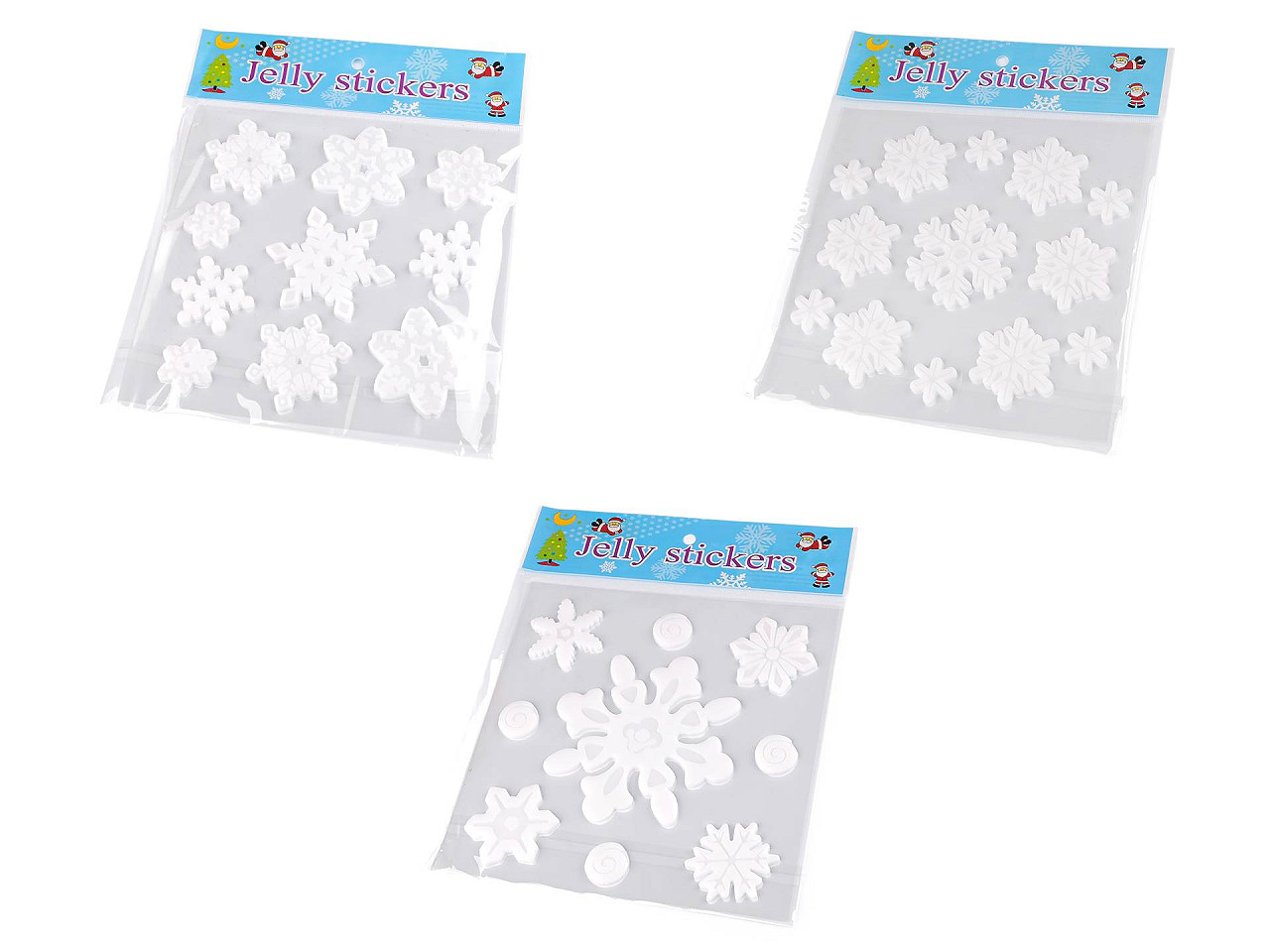 Dekoračné gélové vločky využijete na ozdobenie okien, zrkadiel či rôznych skiel počas zimného obdobia. Neobsahujú lepidlo , jednoducho priľnú na rovný hladký povrch. Ľahko sa zlúpnu , nezanechávajú stopy, dajú sa premiestniť a znovu použiť. Variant č. 1 obsahuje 10 samolepiek. Variant č. 2 obsahuje 13 samolepiek. Variant č. 3 obsahuje 9 samolepiek. Priemer samolepiek je v rozmedzí cca 2,3 – 11,5 cm.